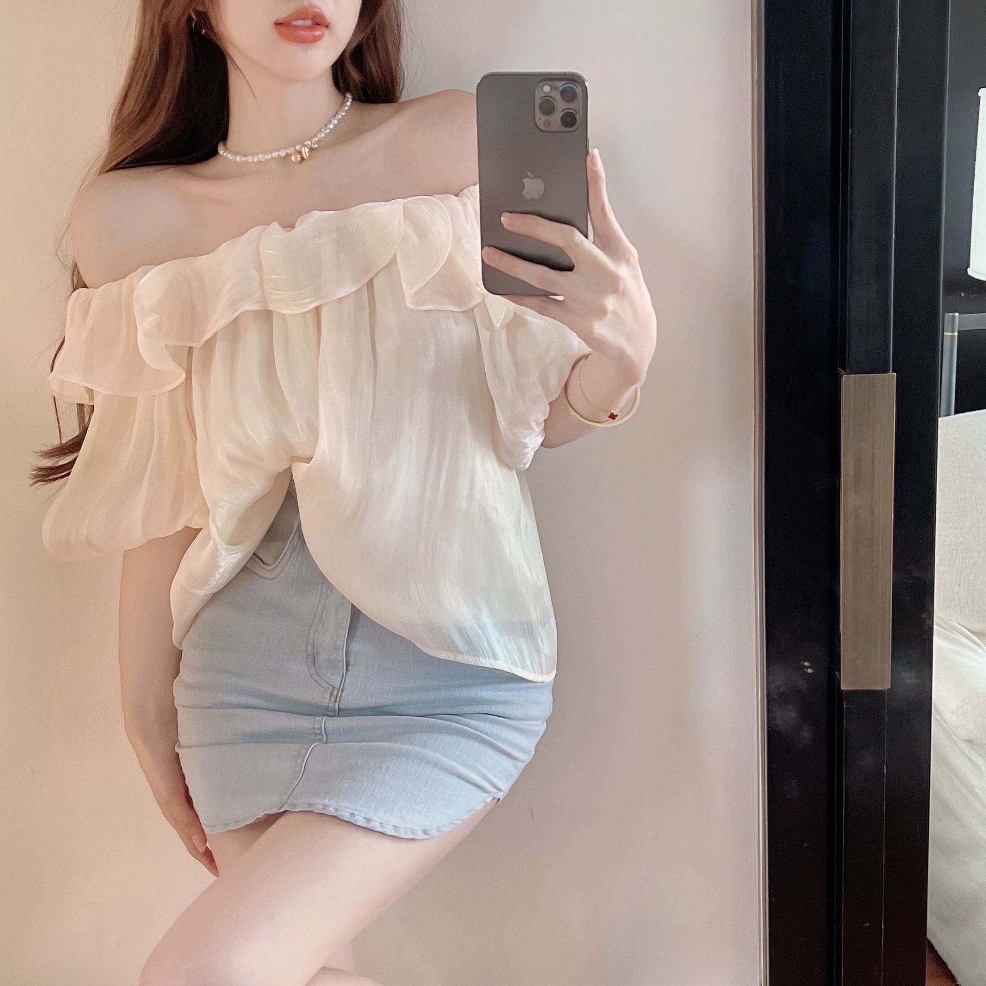 패션 우아한 어깨 셔츠 여성 디자인 센스 여름 틈새 탑 러플 세련된 어깨 쉬폰 셔츠 트렌디