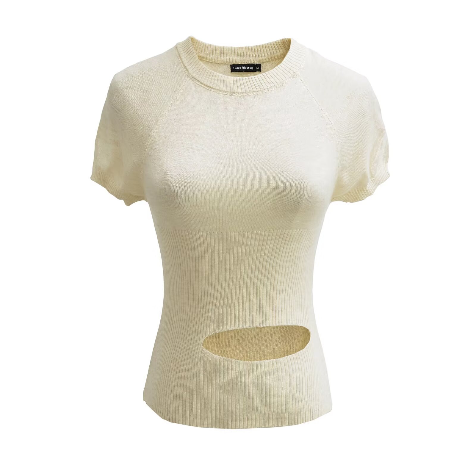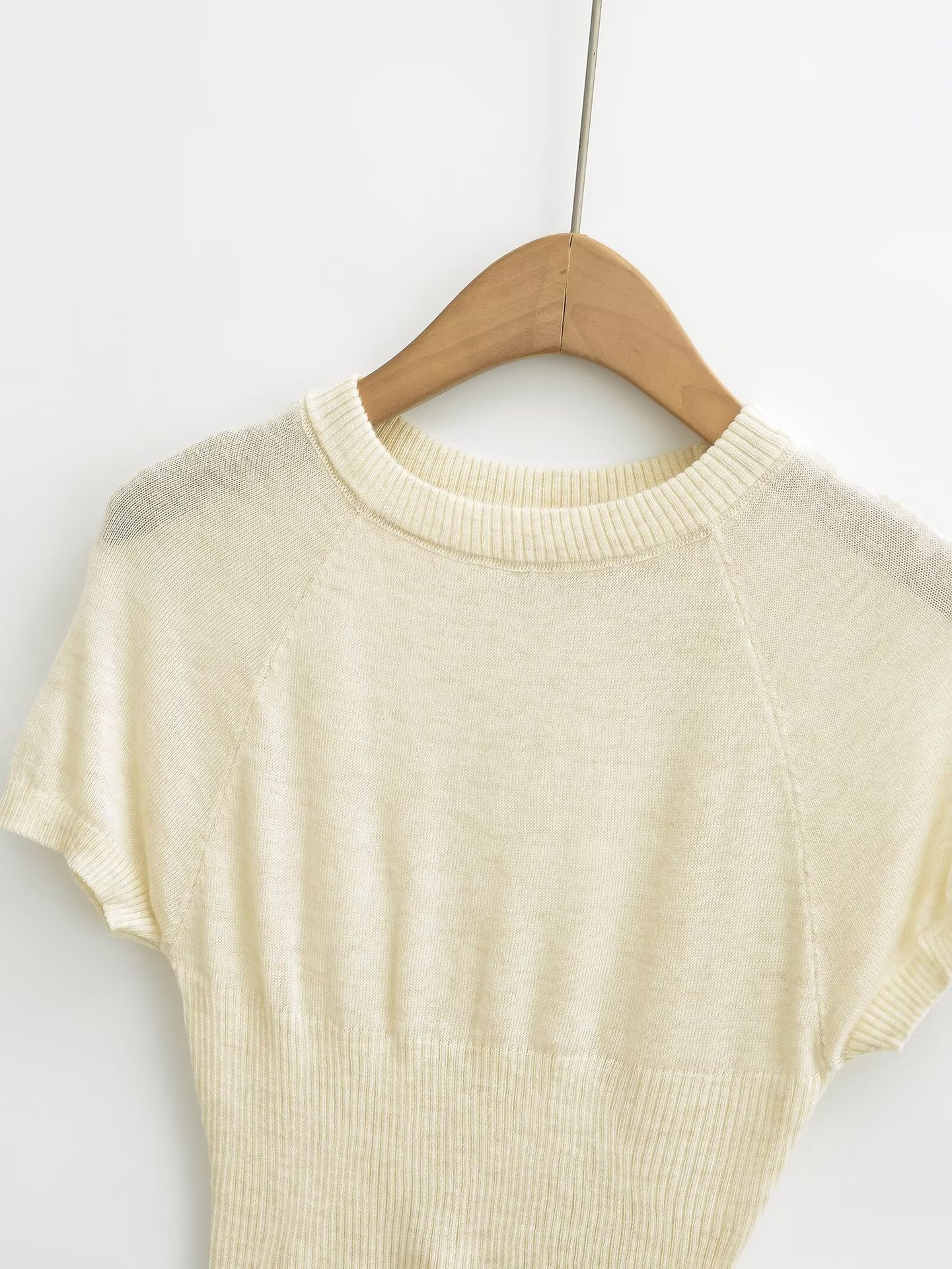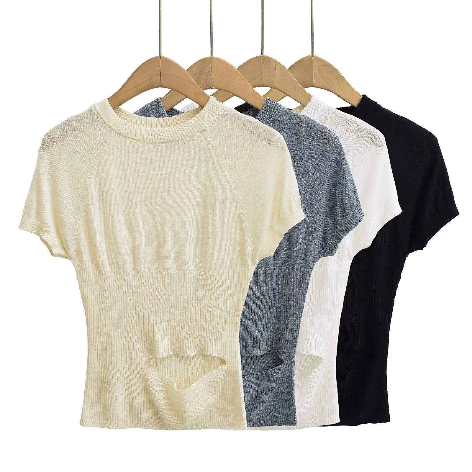 여름 섹시한 스파이스 소녀 작은 둥근 목 반팔 얇은 니트 셔츠 슬림 핏 슬리밍 올매치 쇼트 탑 허비 아웃 관점
