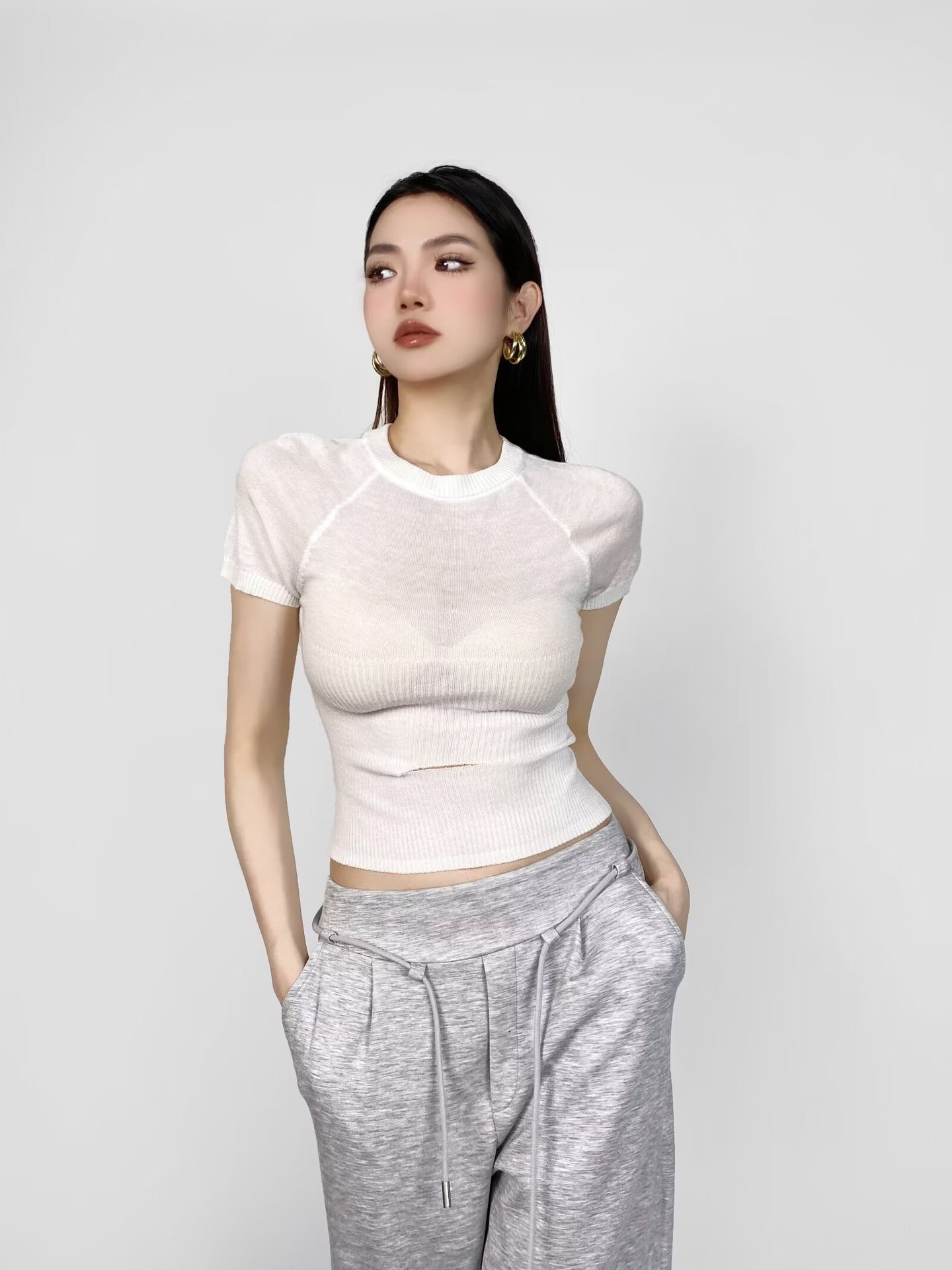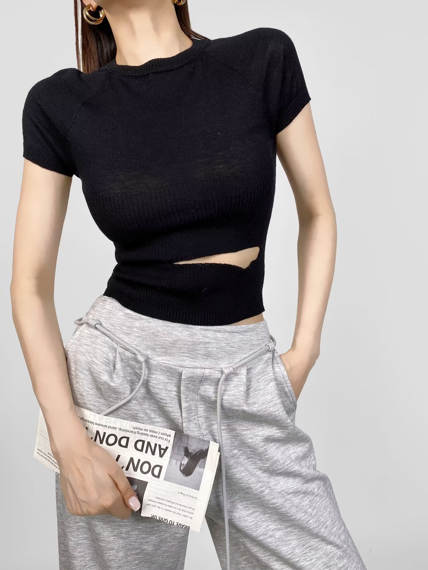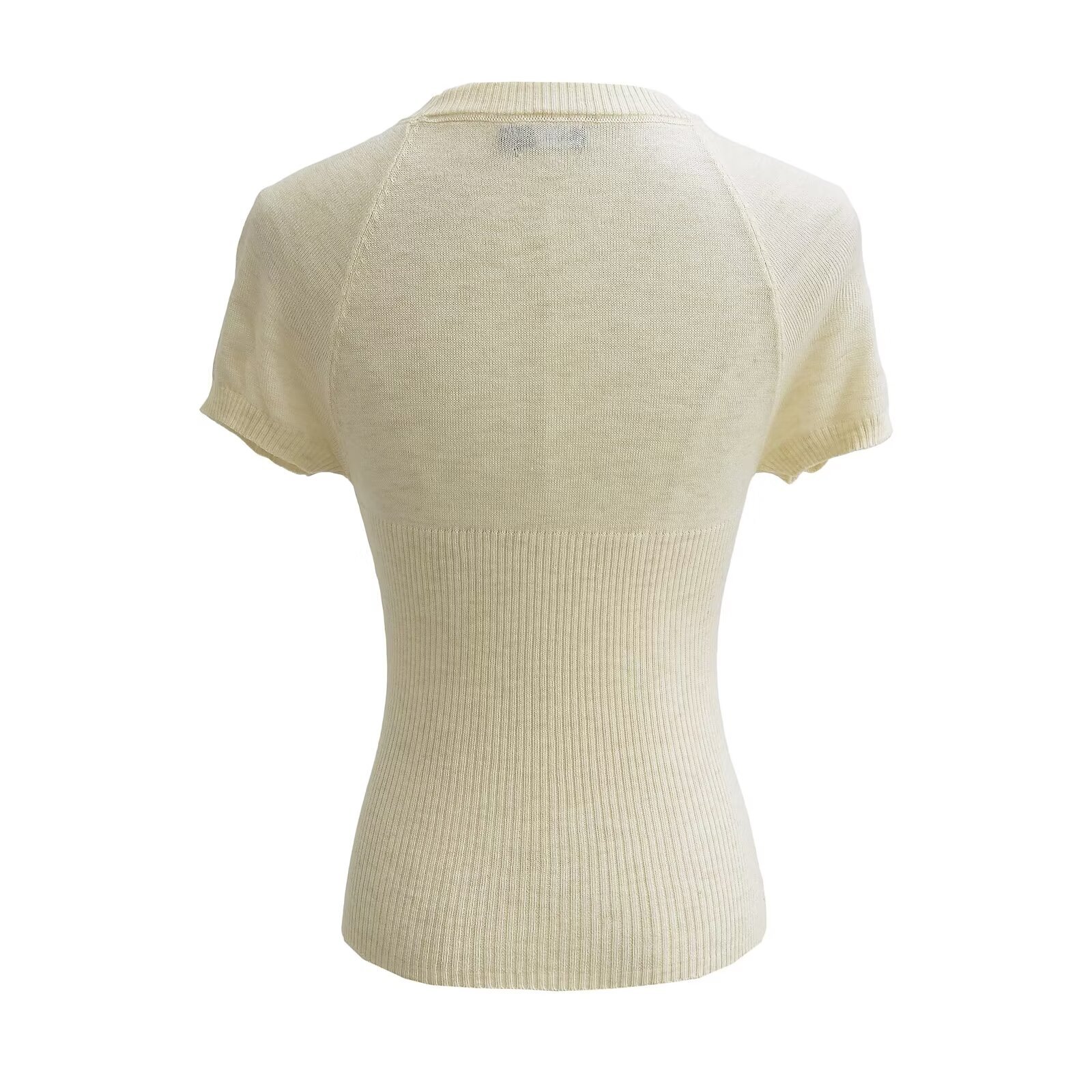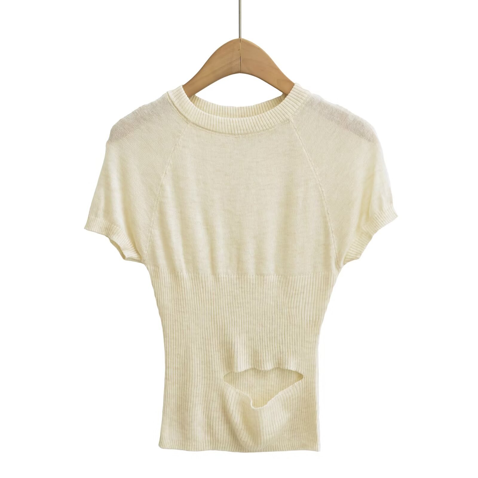 여름 섹시한 스파이스 소녀 작은 둥근 목 반팔 얇은 니트 셔츠 슬림 핏 슬리밍 올매치 쇼트 탑 허비 아웃 관점