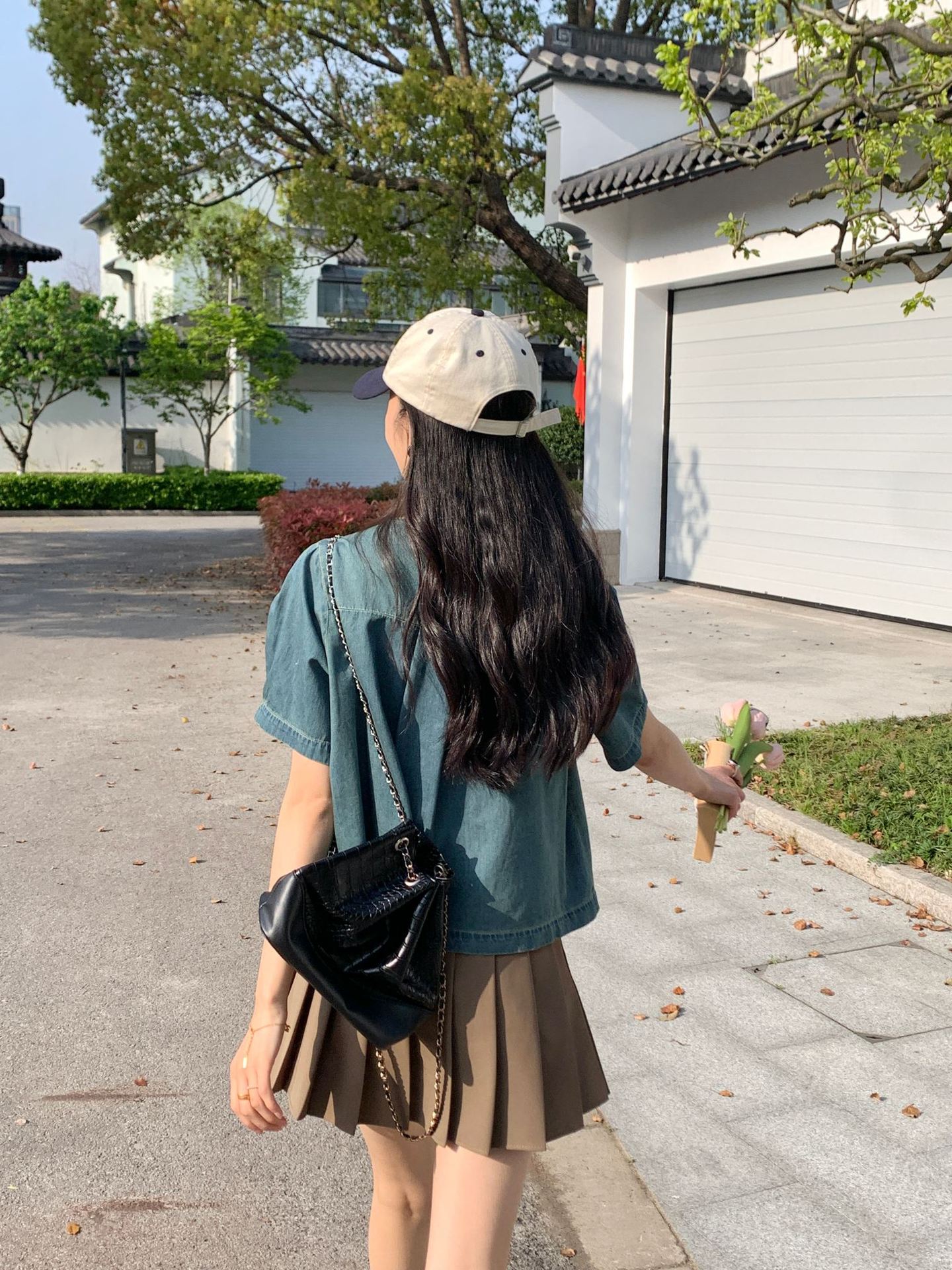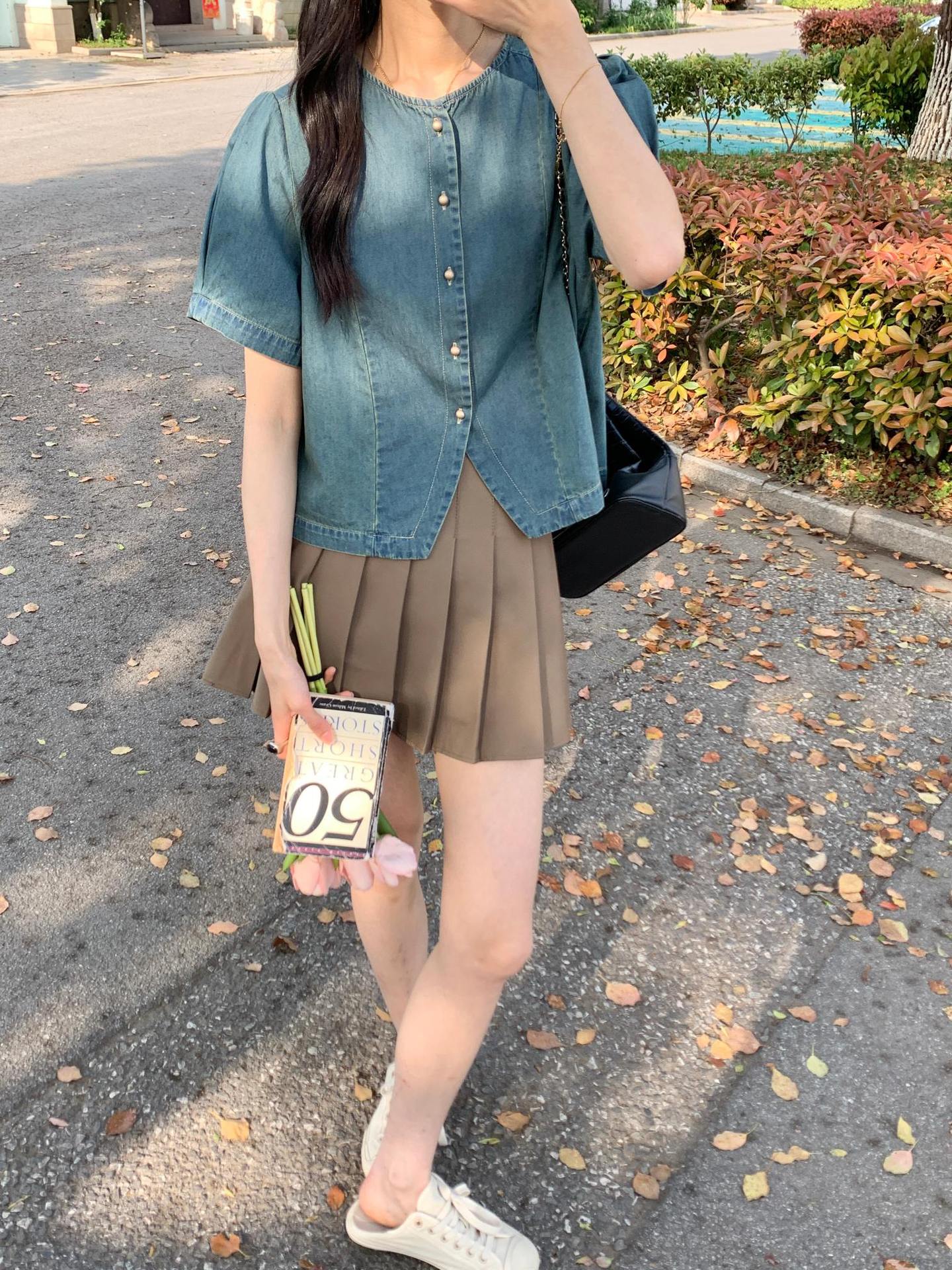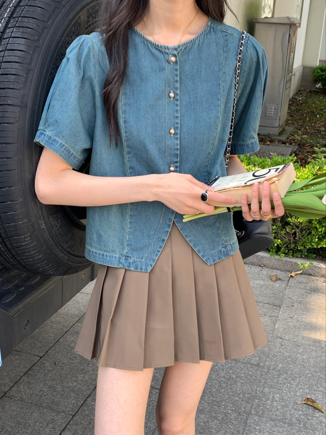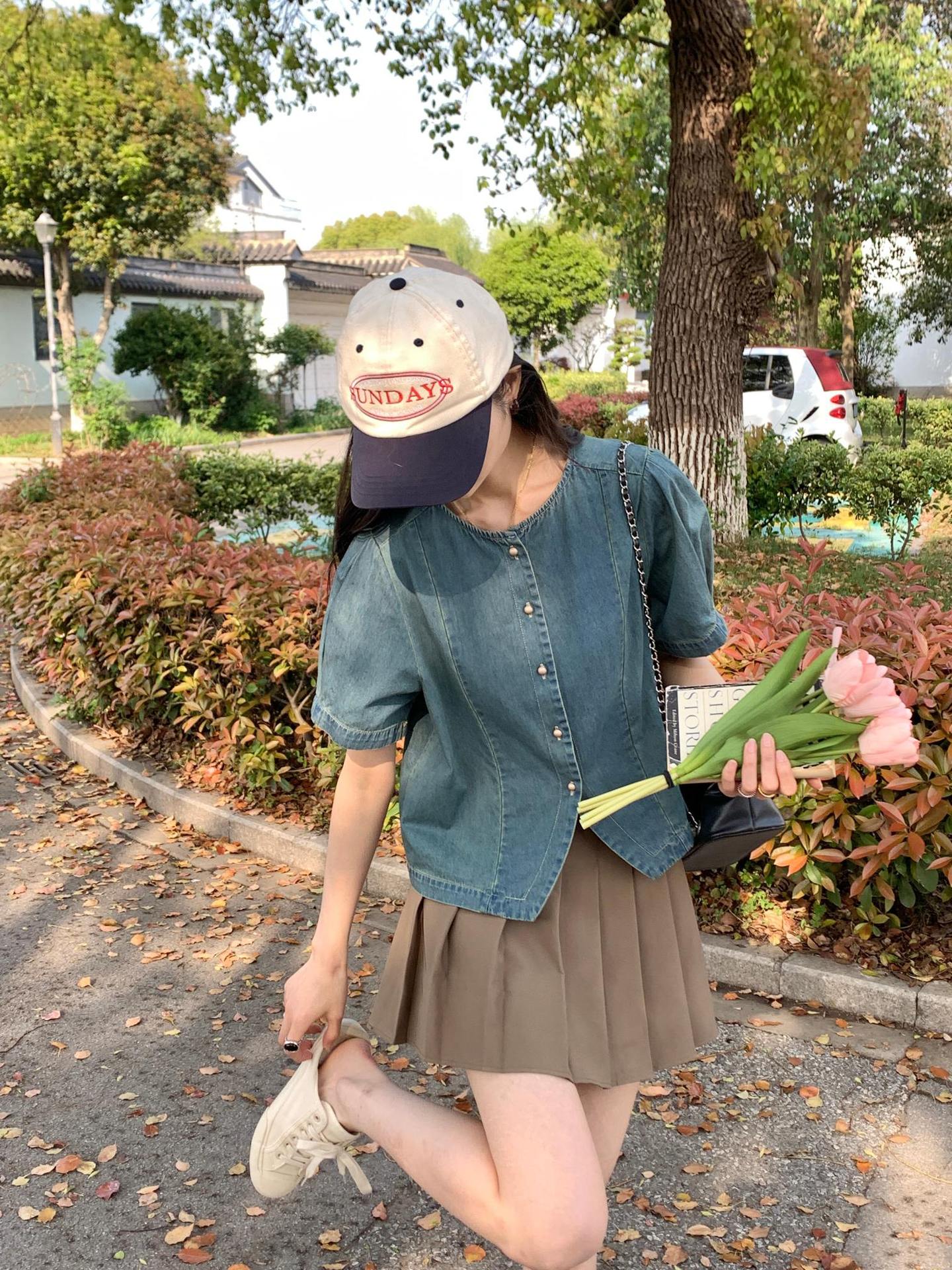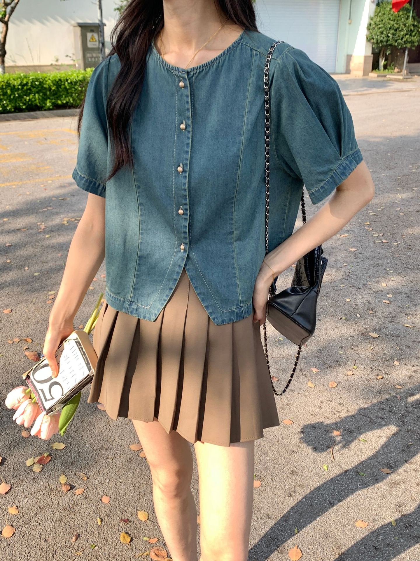 크루 넥 싱글 브레스트 버블 반팔 도브테일 스플릿 쇼트 셔츠 데님 셔츠 2024 여름 스위트 걸 칼리지 스타일스토어 가기