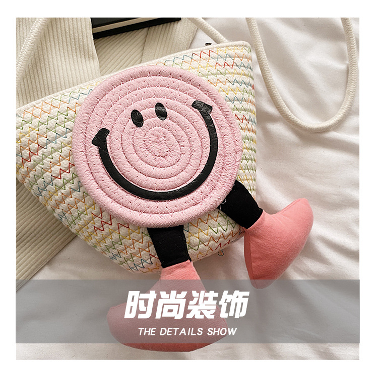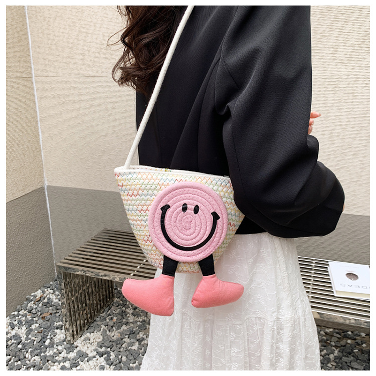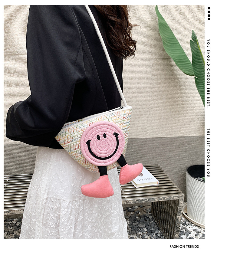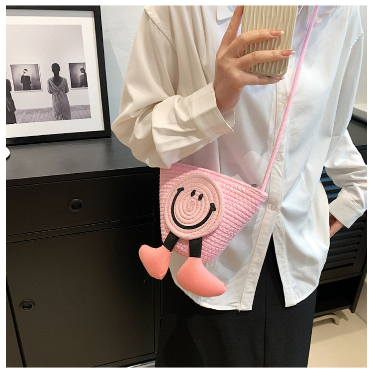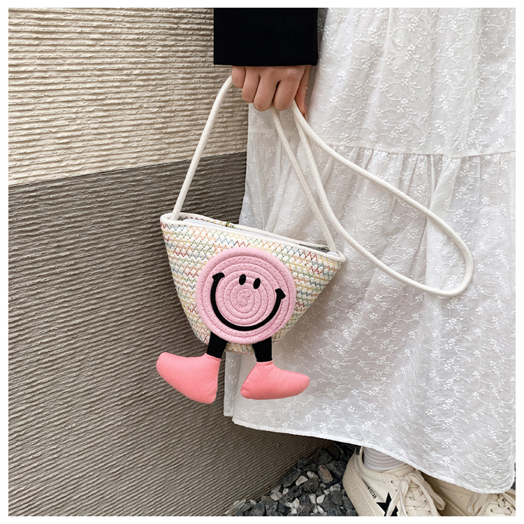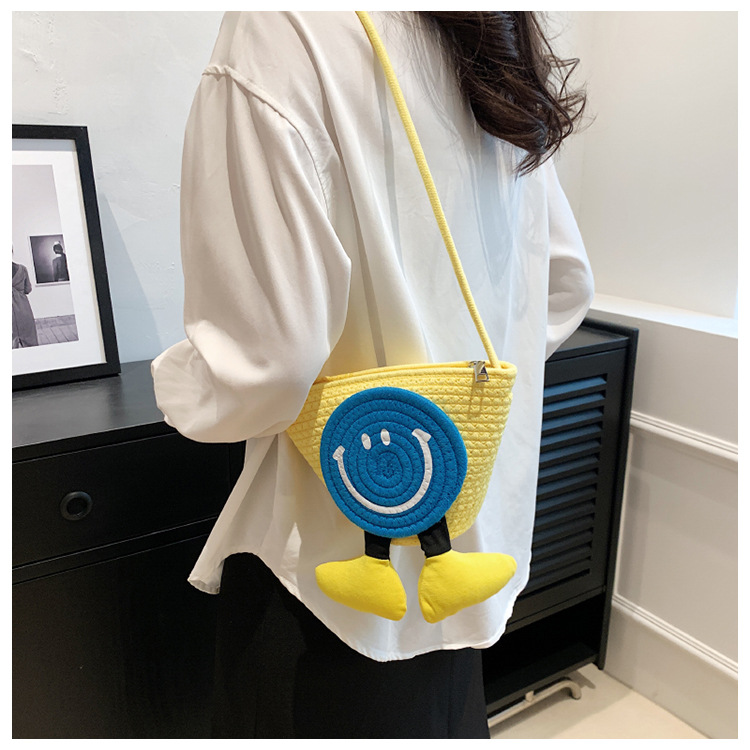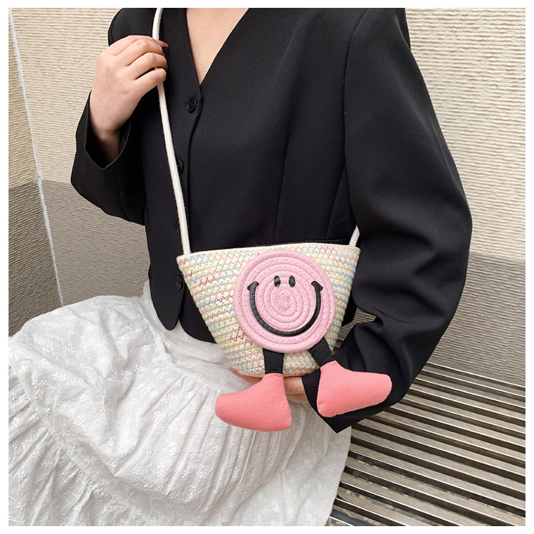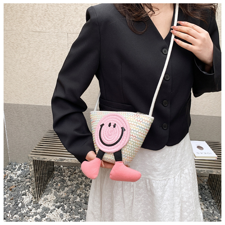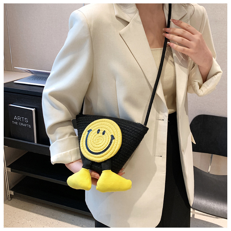 여름 스마일리 밀짚 가방 여자 2024 새 Ins 올매치 비치 짠 버킷 백 트렌디 한 어깨 크로스 바디 백