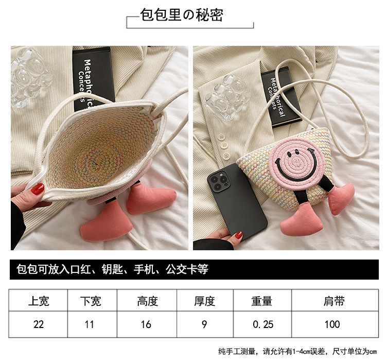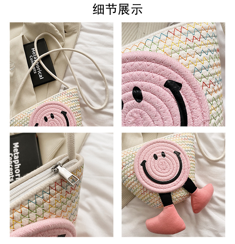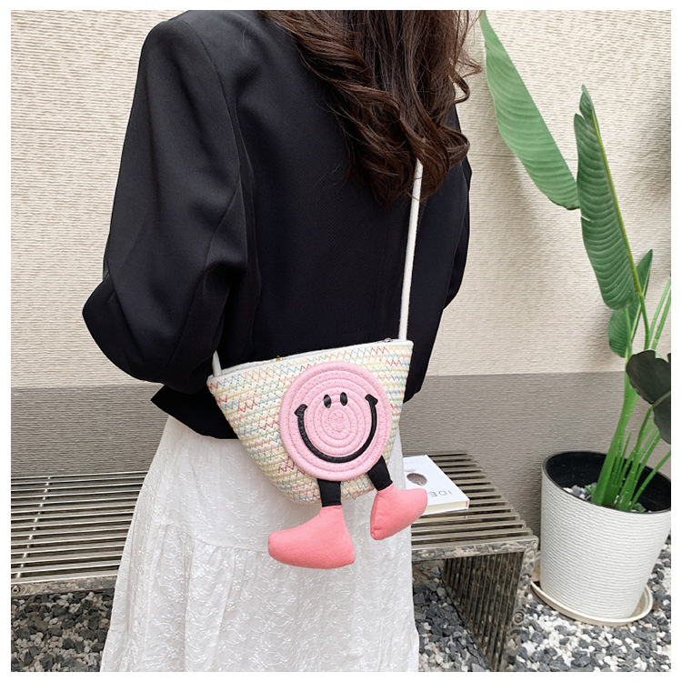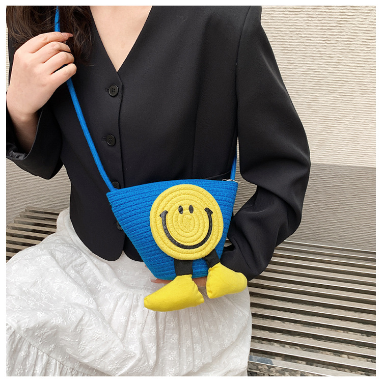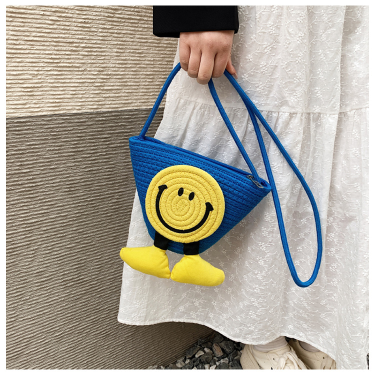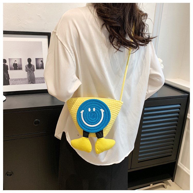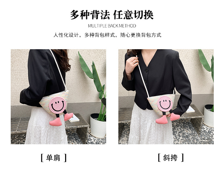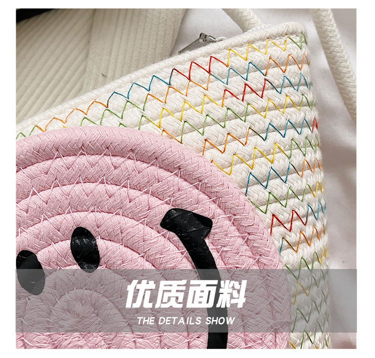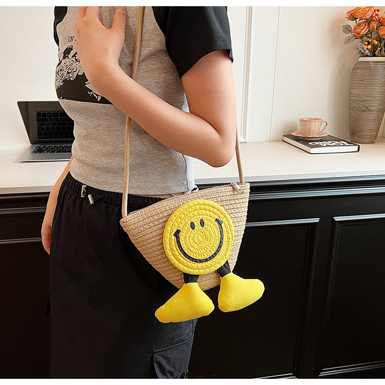 여름 스마일리 밀짚 가방 여자 2024 새 Ins 올매치 비치 짠 버킷 백 트렌디 한 어깨 크로스 바디 백