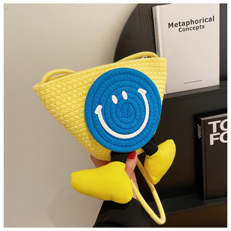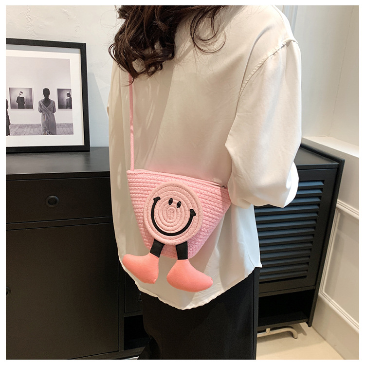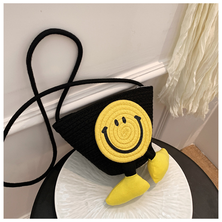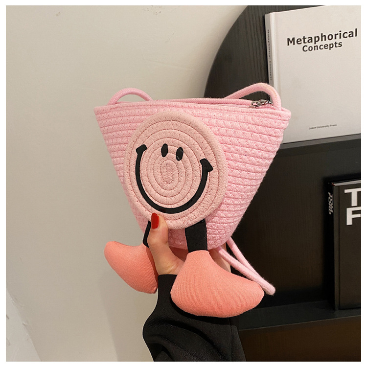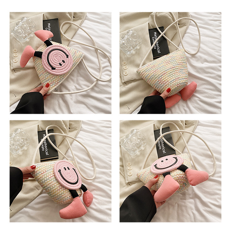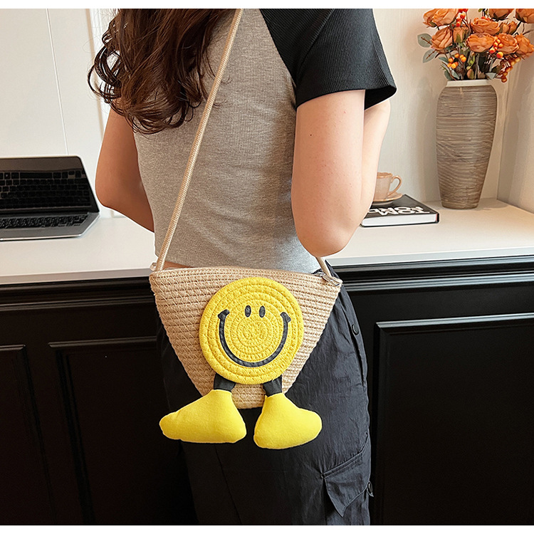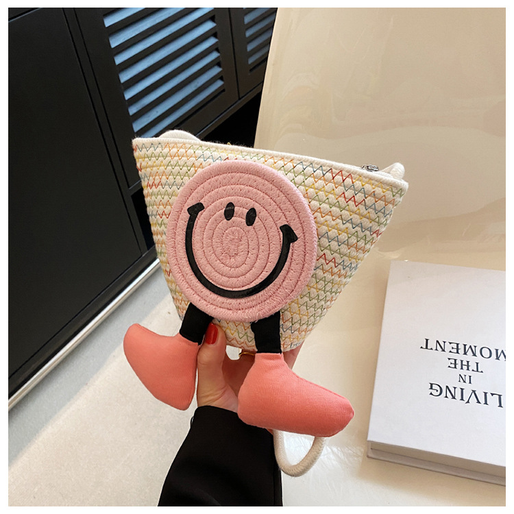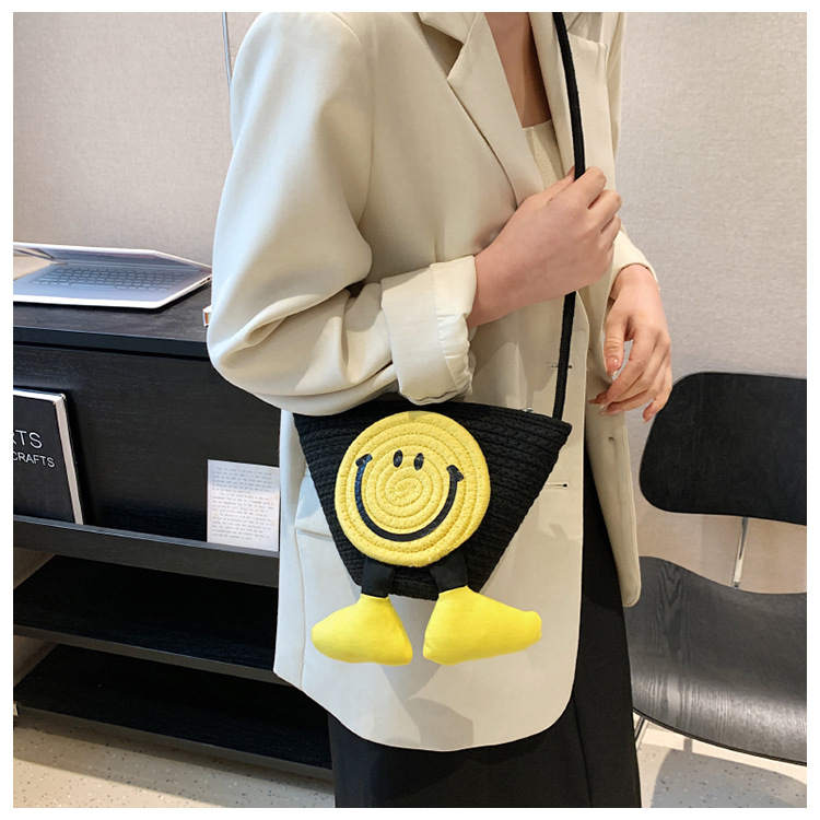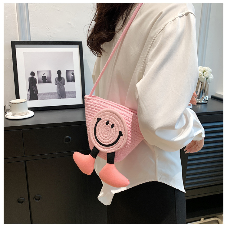 여름 스마일리 밀짚 가방 여자 2024 새 Ins 올매치 비치 짠 버킷 백 트렌디 한 어깨 크로스 바디 백