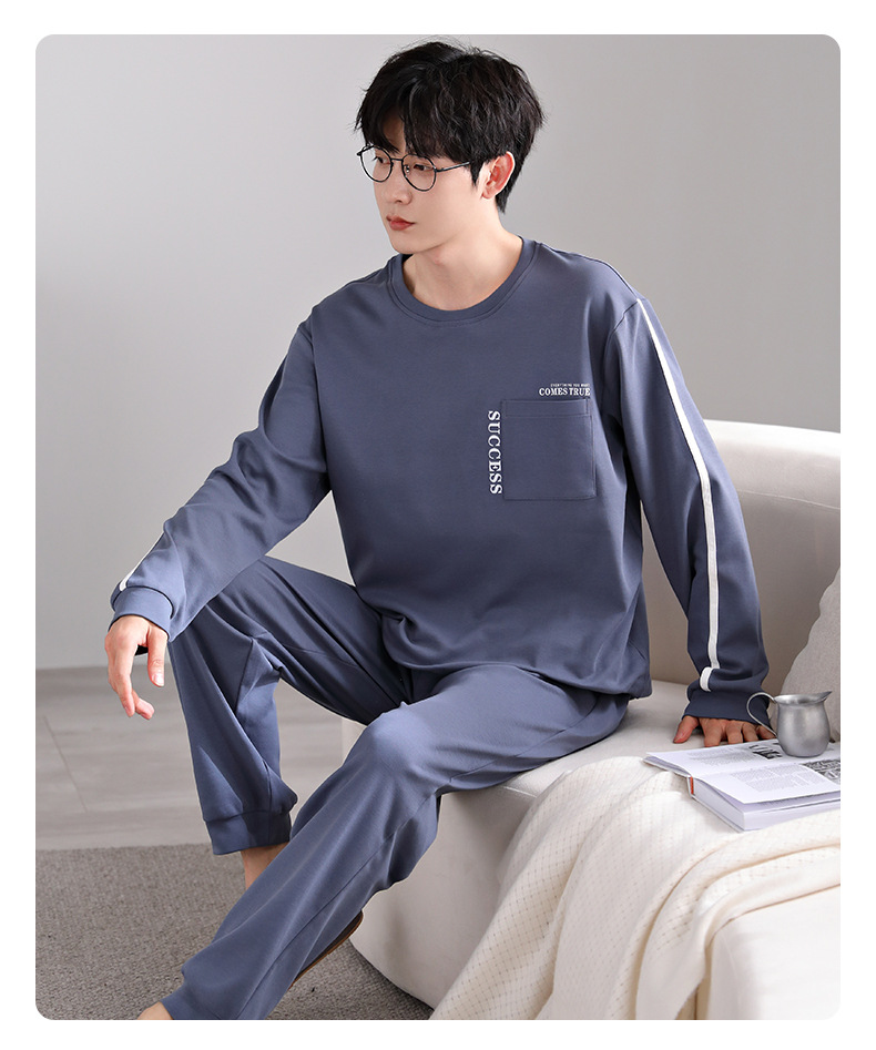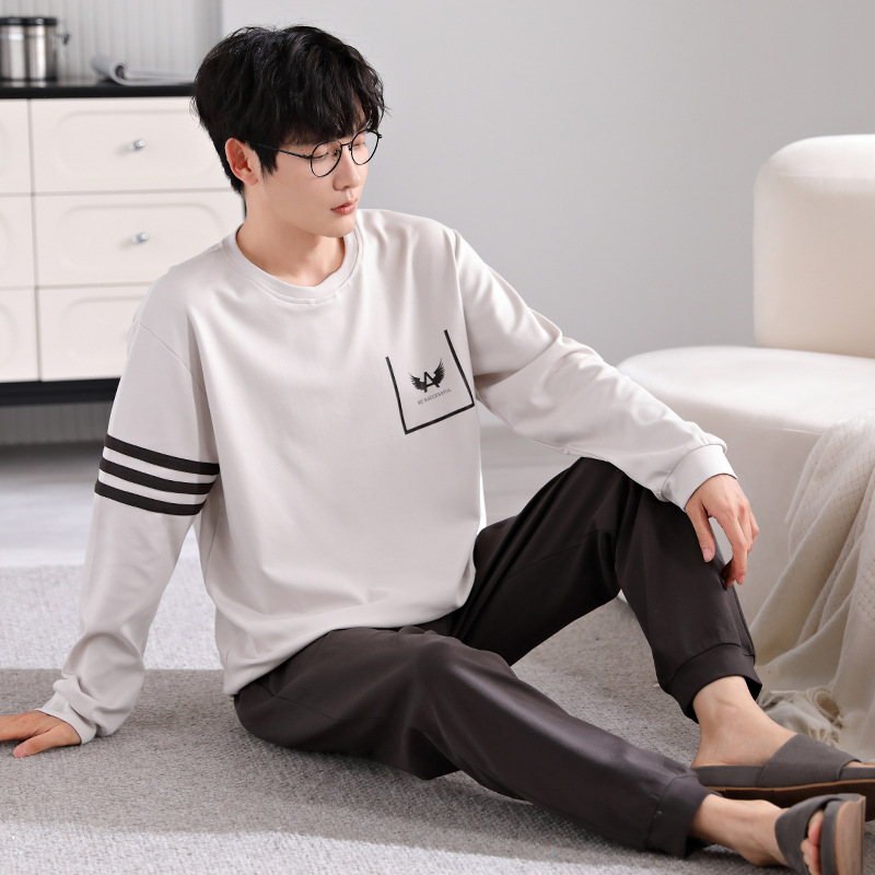 100% 양면 순면 잠옷 남성용 가을 겨울 긴팔 긴바지 두꺼운 캐주얼 루즈 청소년 홈웨어 세트