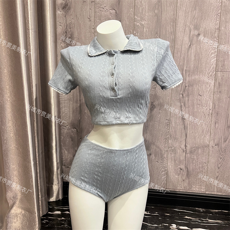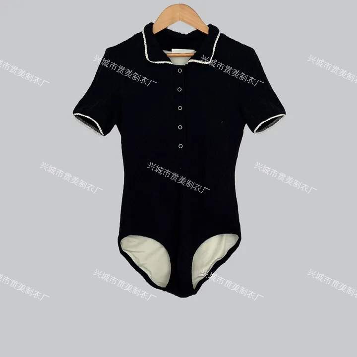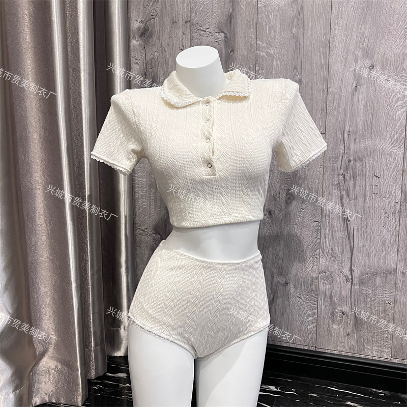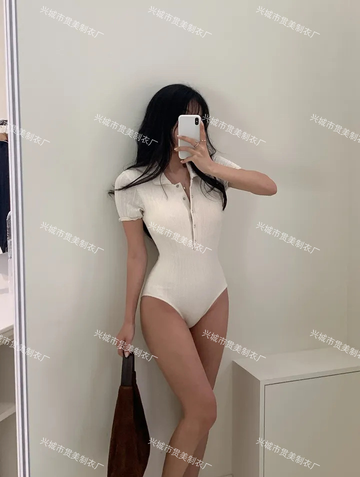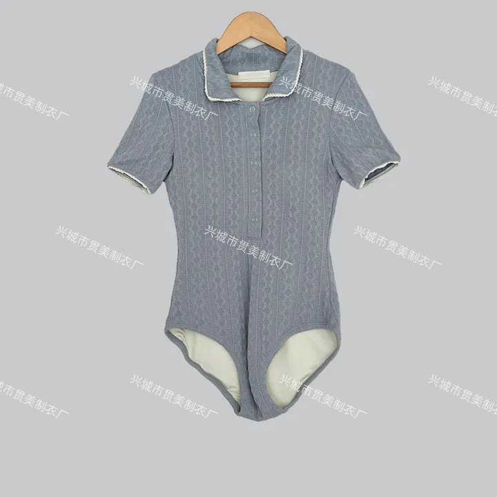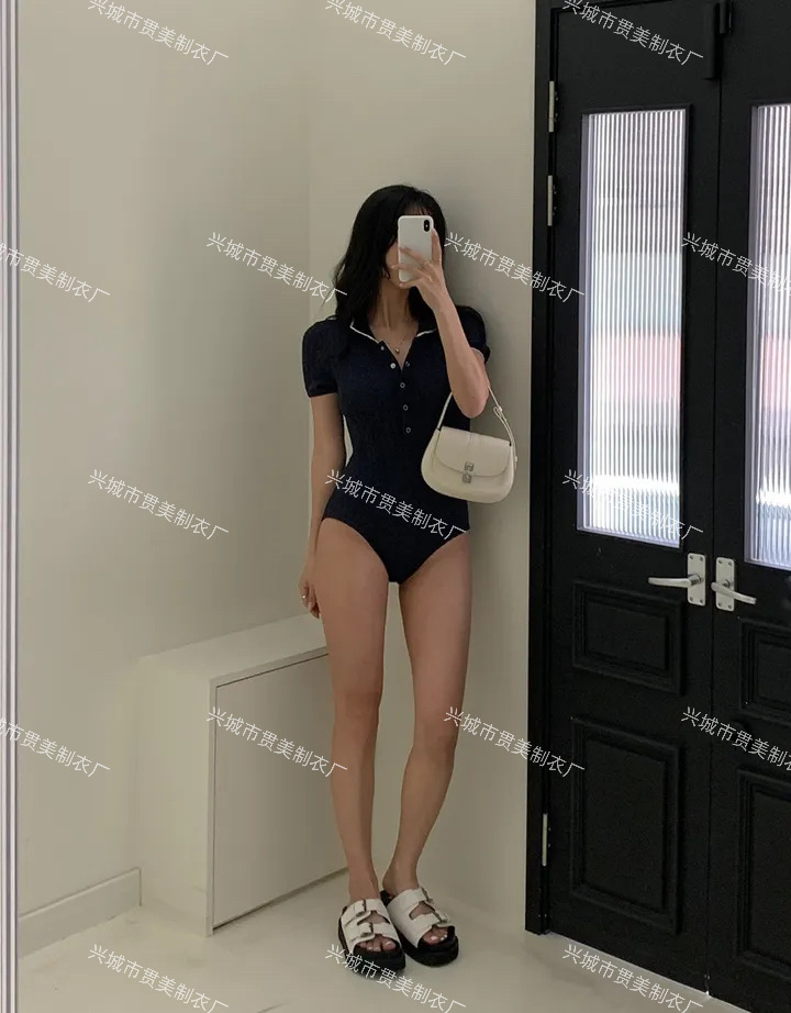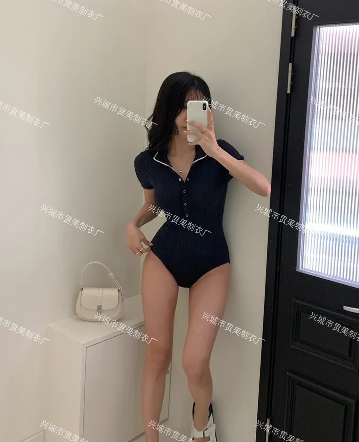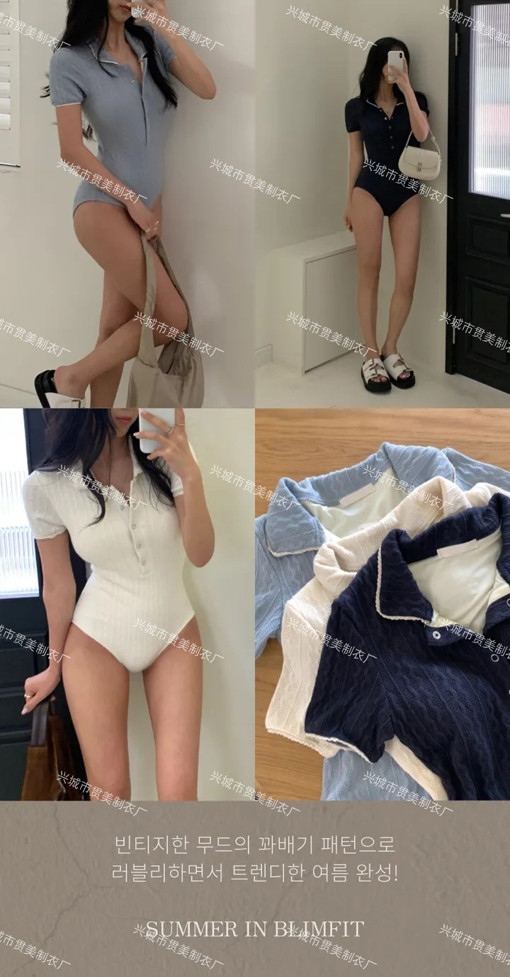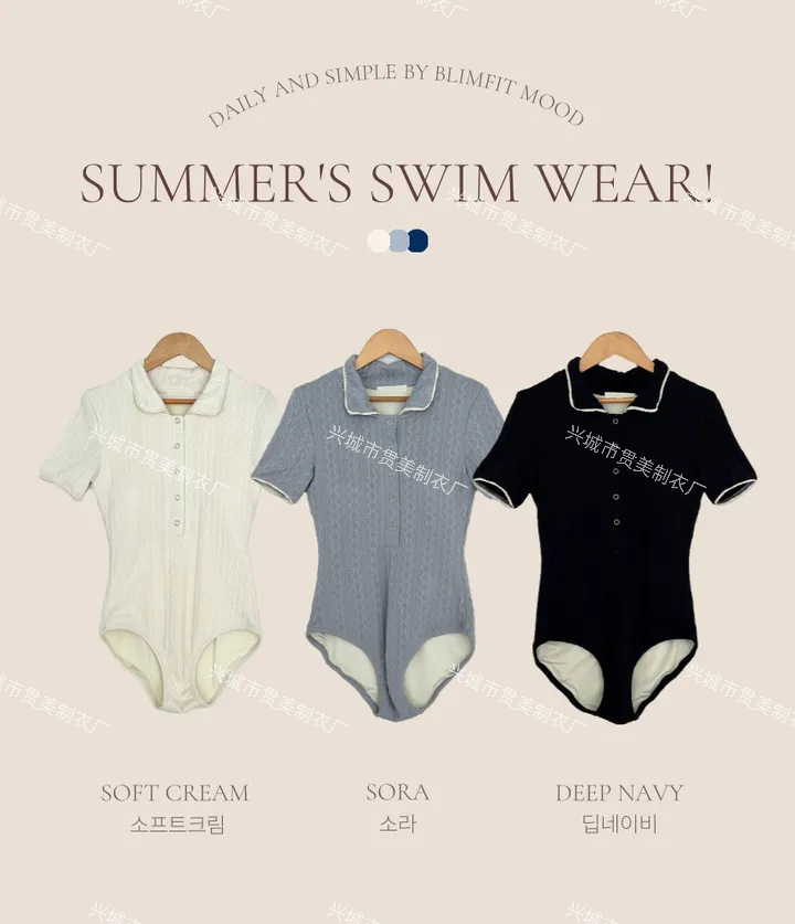 3 색] 새로운 한국 단색 폴로 칼라 하프 소매 우아한 원피스 간단한 수영복 여성 해변 휴가 비키니
