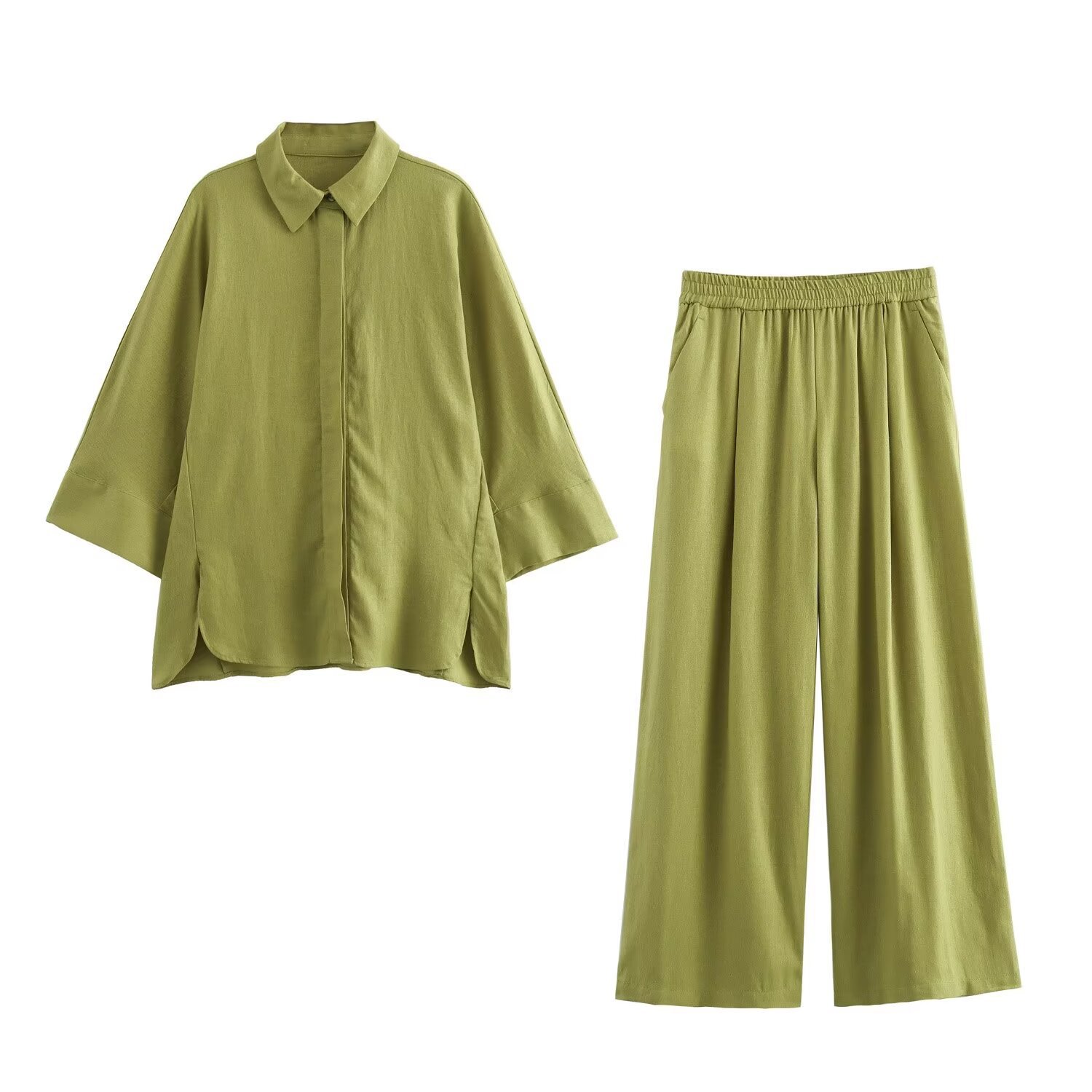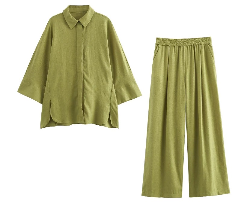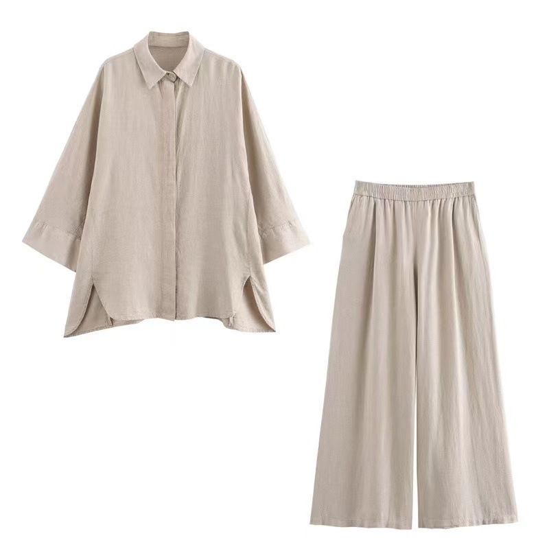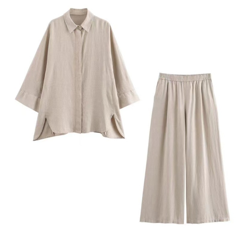 국경을 넘는 유럽과 미국 여성의 AliExpress INS 폭발 느슨한 린넨 셔츠 탄성 스트레이트 바지 세트 2157045