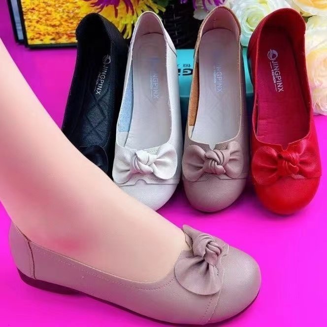 부드러운 가죽 부드러운 밑바닥 콩 신발 새로운 봄과 가을 어머니 신발 슬립 온 쇠고기 단독 라운드 헤드 플랫 얕은 입 신발 여성