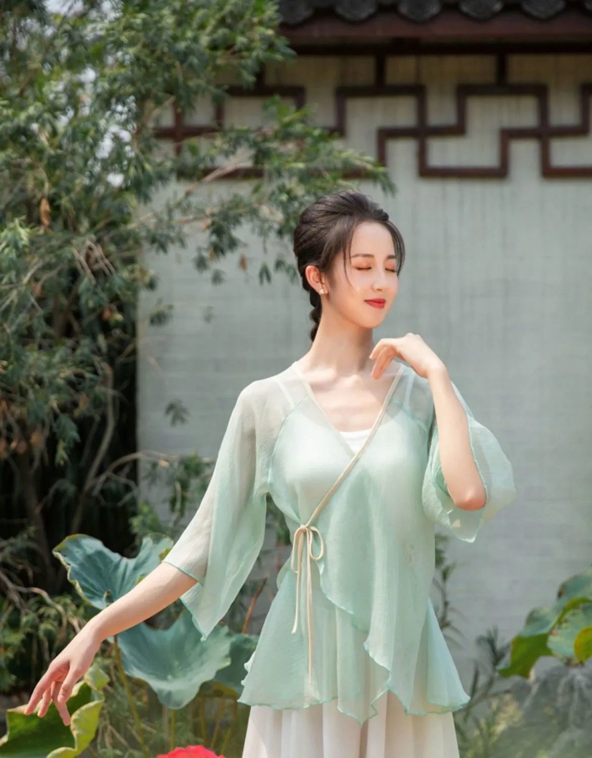 • 淡绿色上衣+吊带+白色阔腿裤⚑