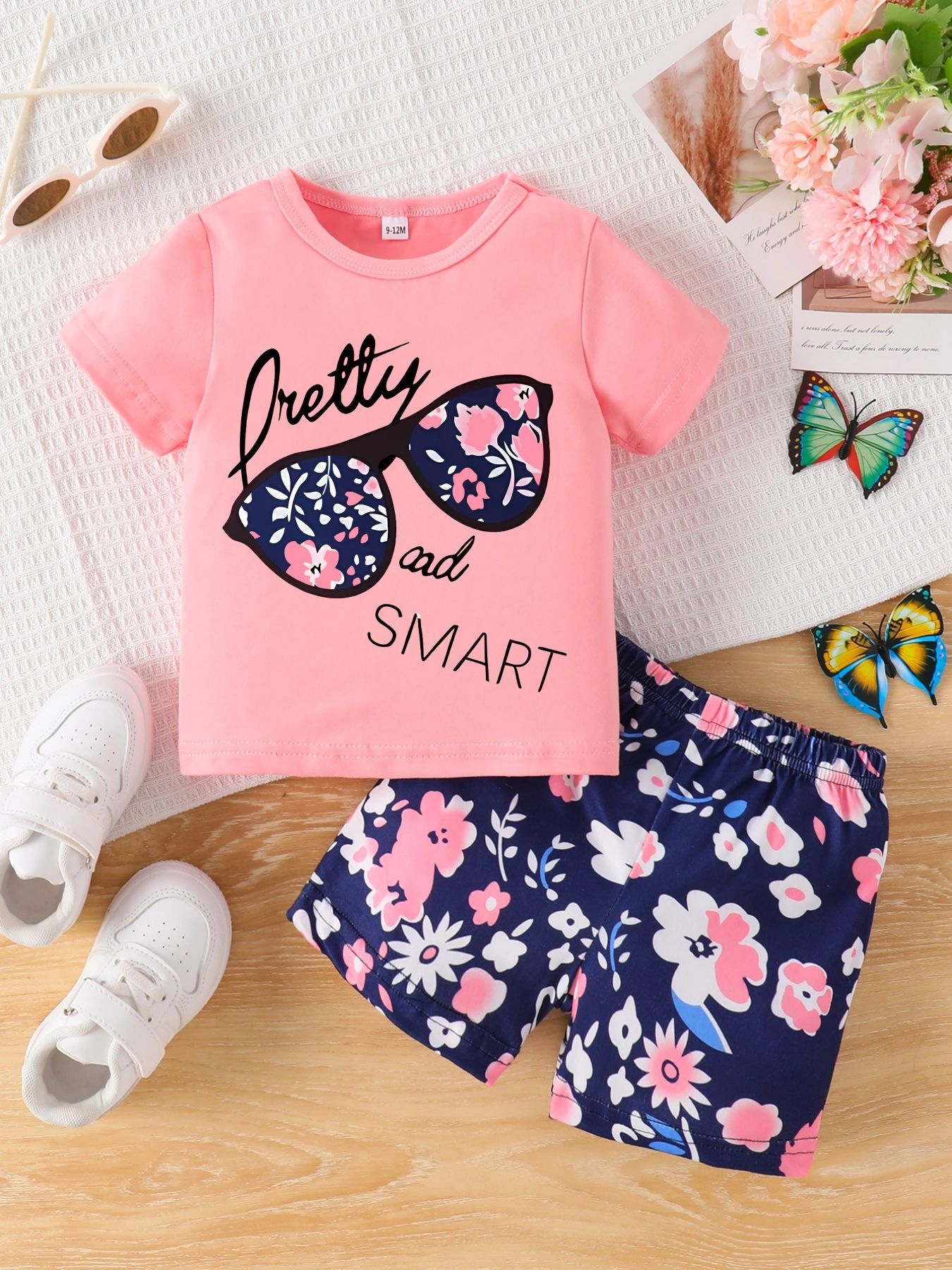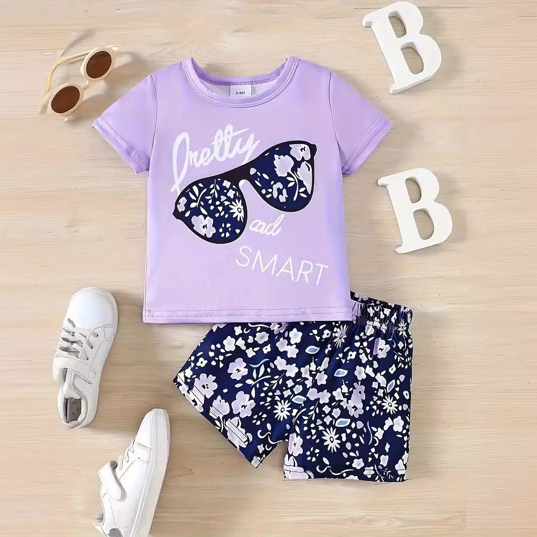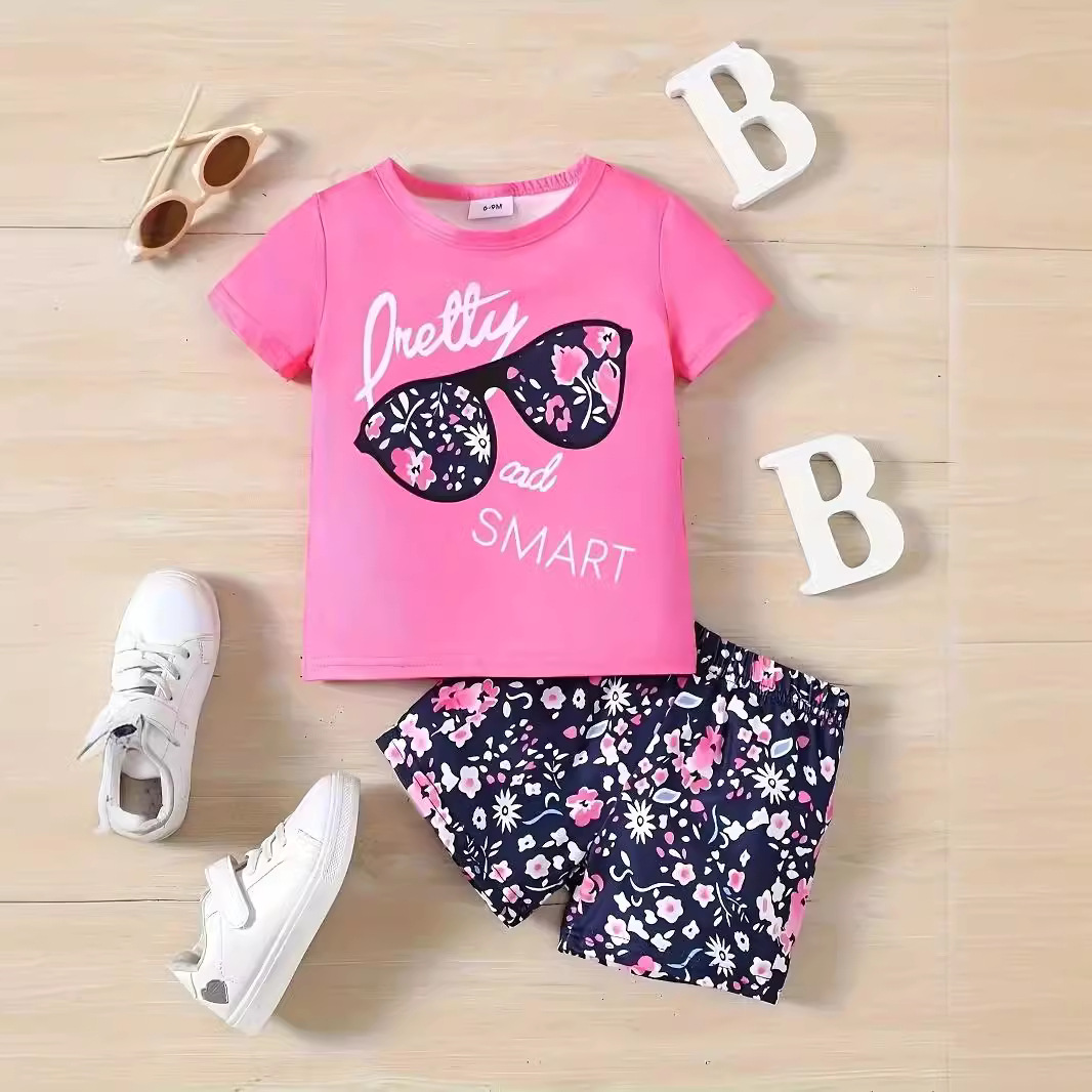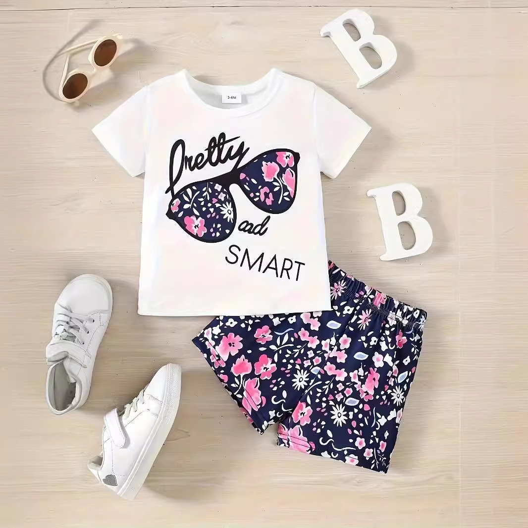 국경 간 INS 아기 소녀 여름 안경 편지 인쇄 반팔 최고 꽃 반바지 세트