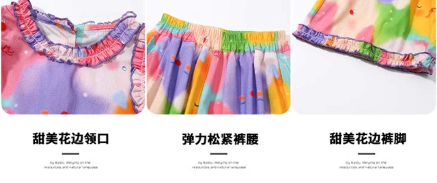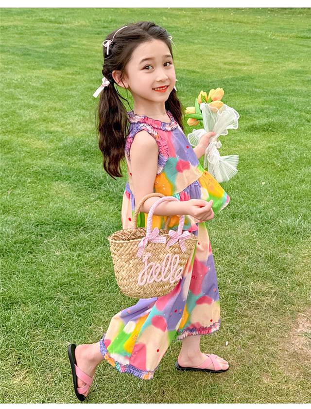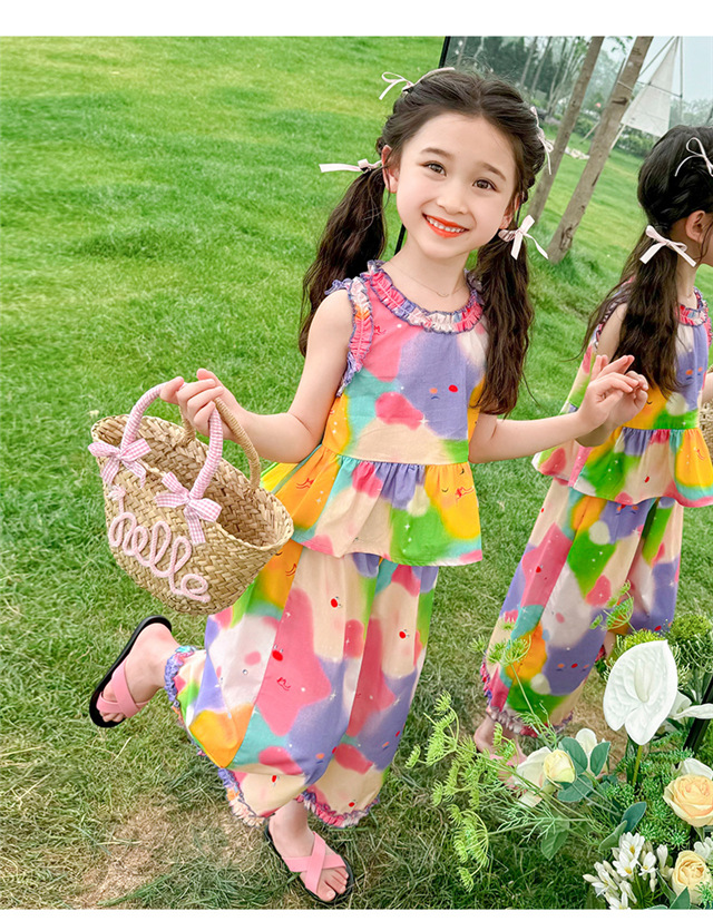 여자 여름 민소매 세트 새로운 어린이 서양식 타이-염료 조끼 아기 소녀 한국 스타일 넓은 다리 바지 투피스 세트스토어 가기