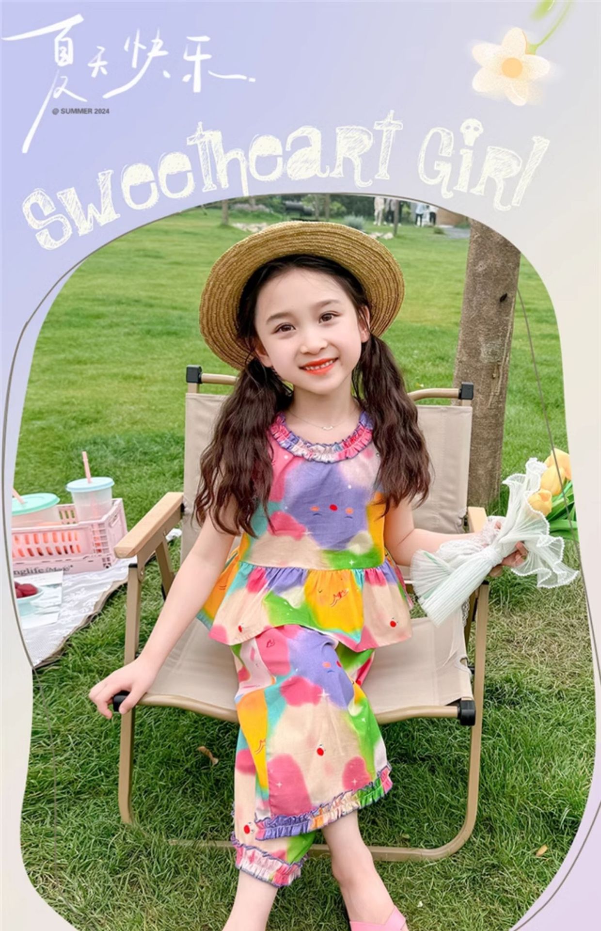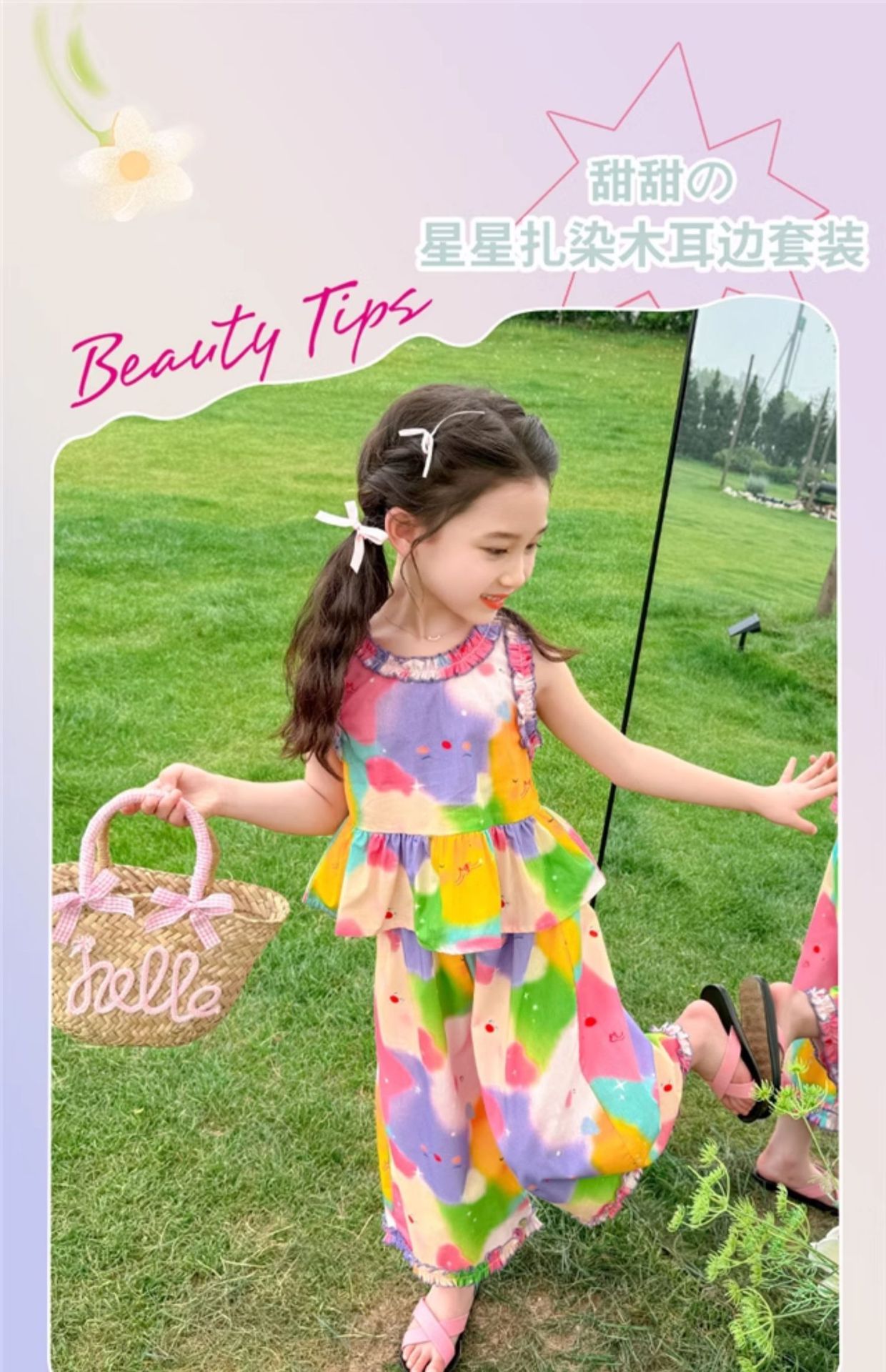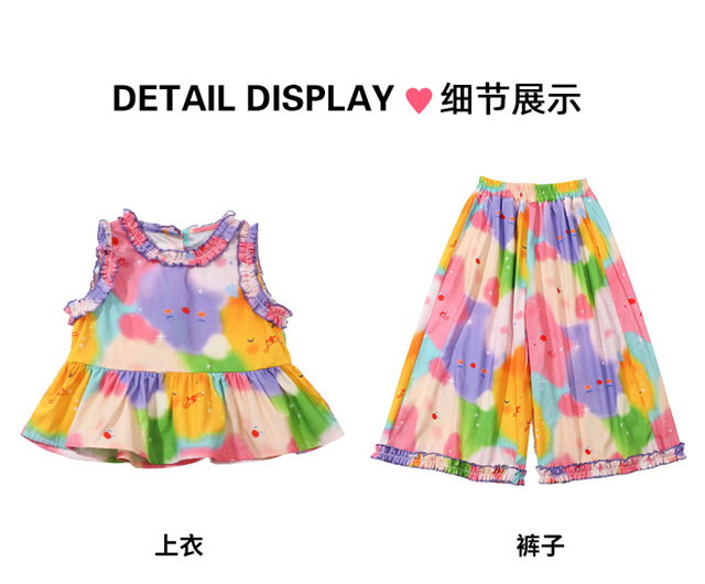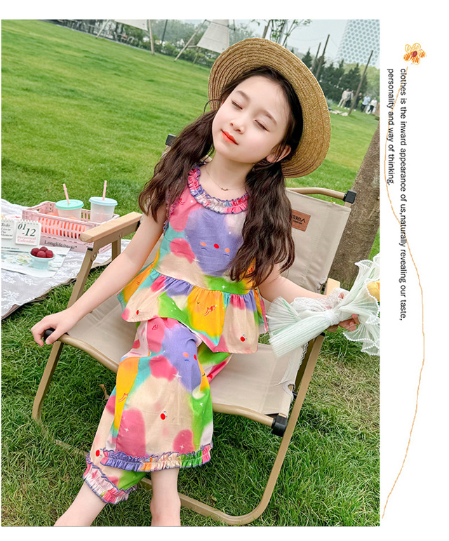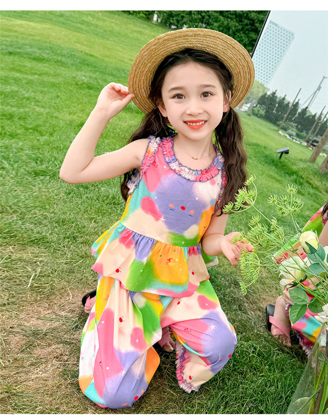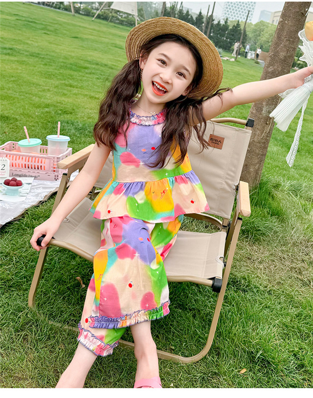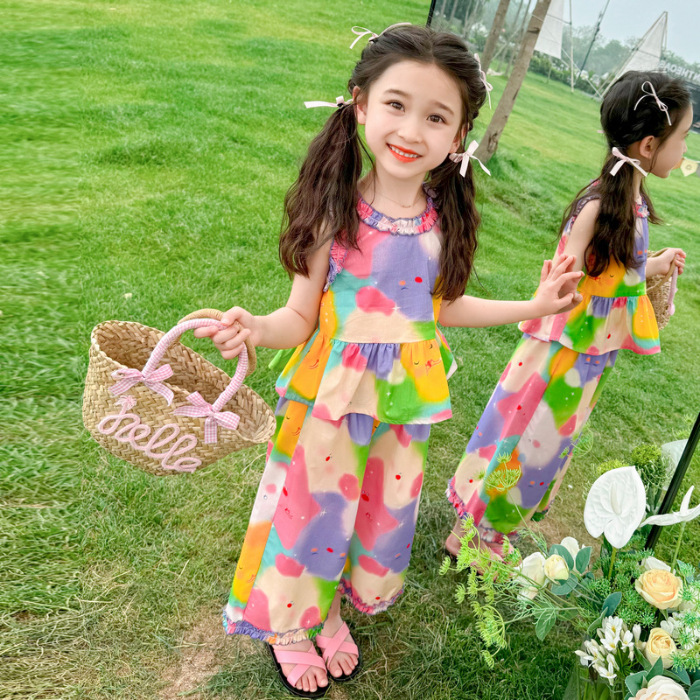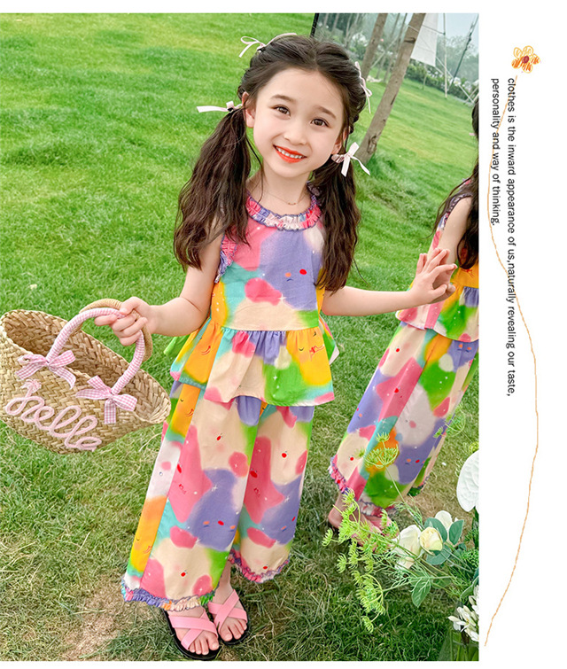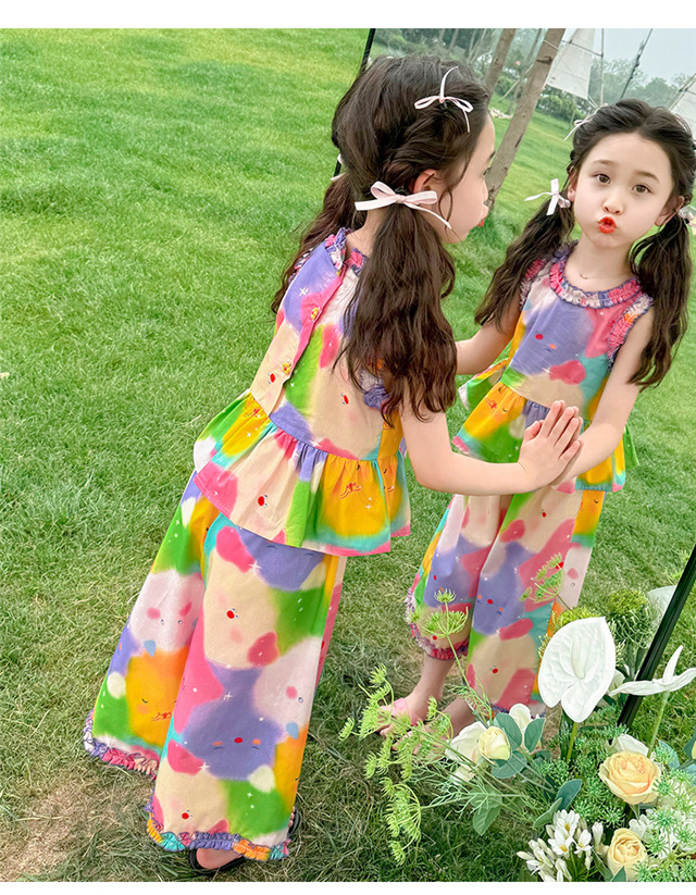 여자 여름 민소매 세트 새로운 어린이 서양식 타이-염료 조끼 아기 소녀 한국 스타일 넓은 다리 바지 투피스 세트