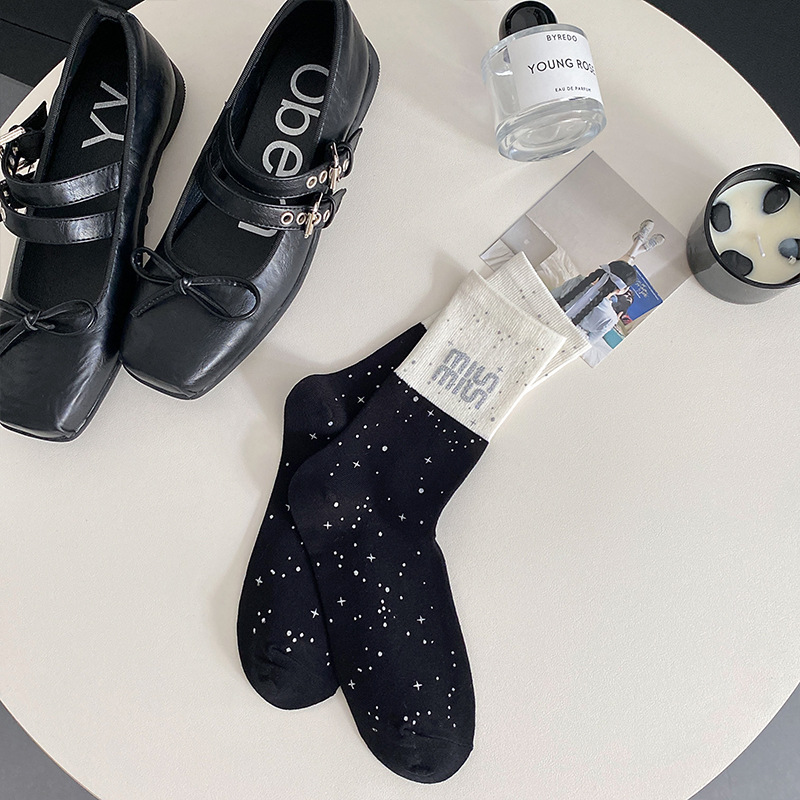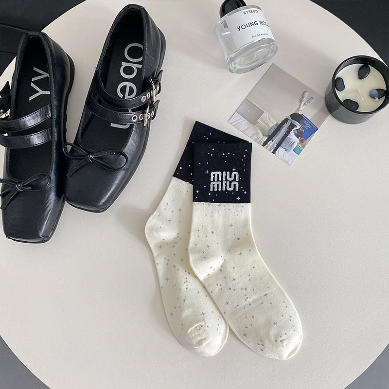 새로운 2024 사계절 풀 프린트 스프레이 페인트 폴로 도트 활 장식 색상 매칭 틈새 디자인 트렌디 한 올 매치 미드 튜브 양말스토어 가기