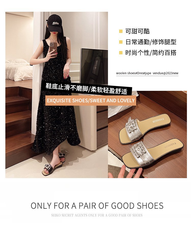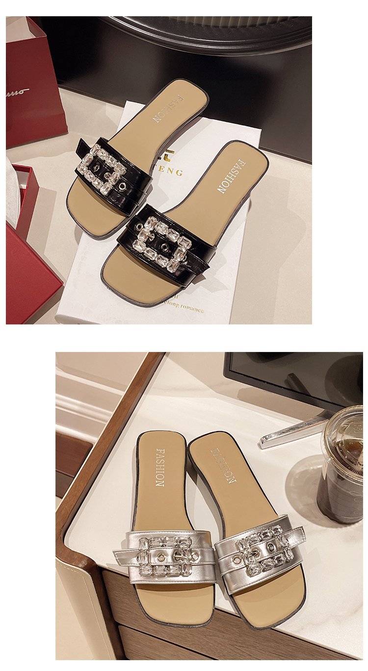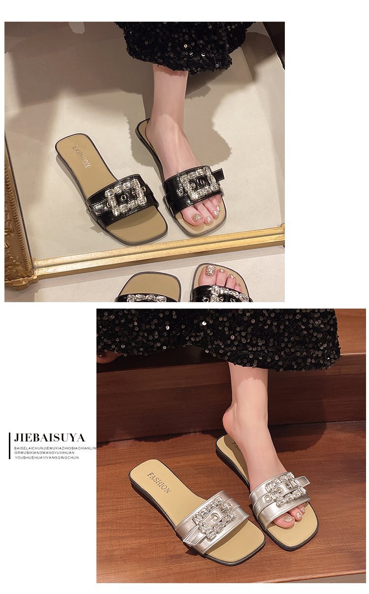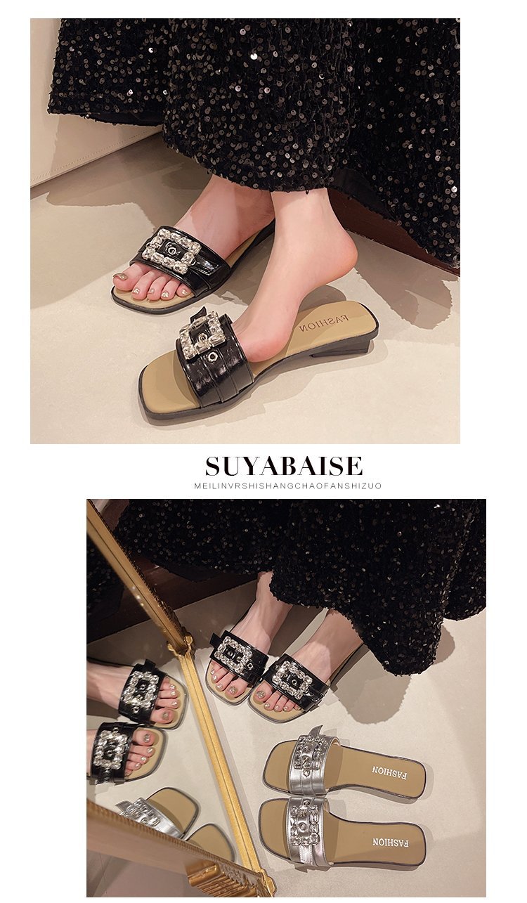 여성을위한 새로운 여름 프랑스 요정 라인 스톤 스퀘어 버클 슬리퍼를 착용 한 여성용 여성용 플랫 하이 엔드 슬리퍼스토어 가기