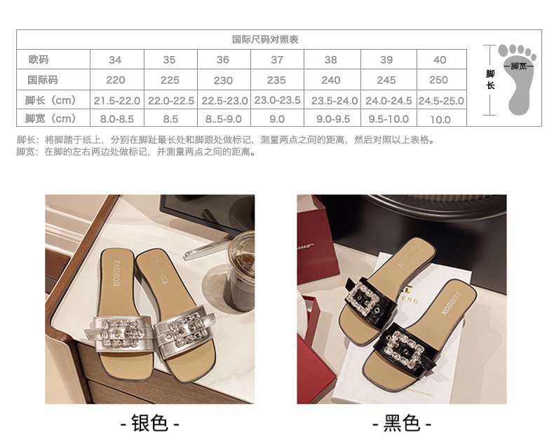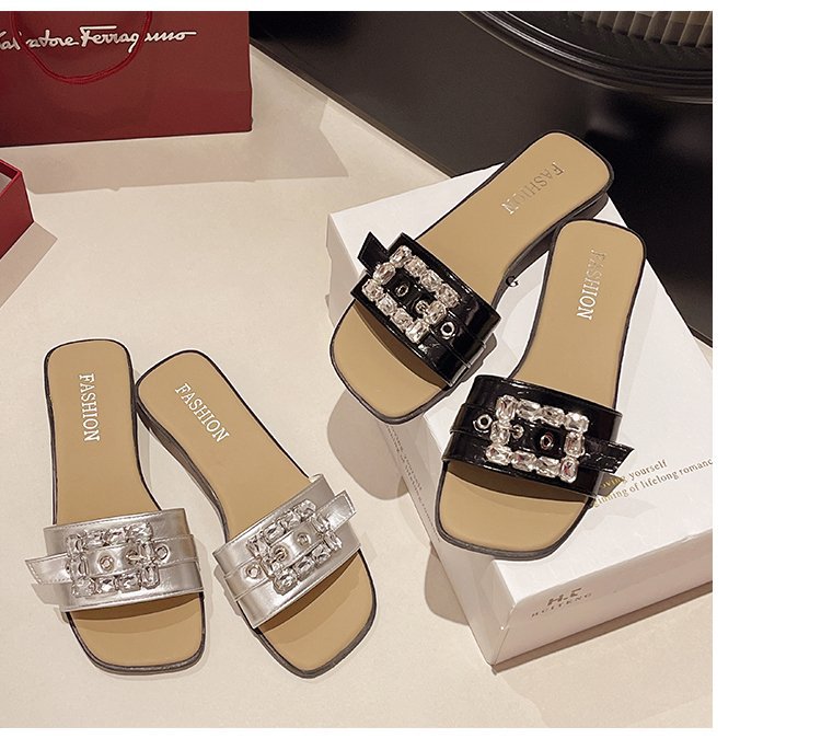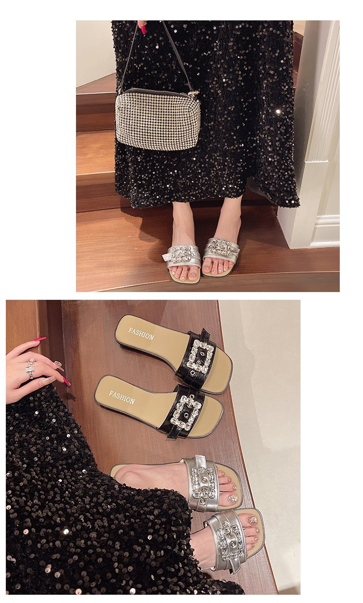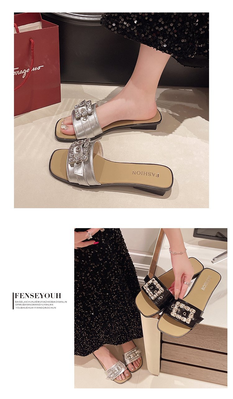 여성을위한 새로운 여름 프랑스 요정 라인 스톤 스퀘어 버클 슬리퍼를 착용 한 여성용 여성용 플랫 하이 엔드 슬리퍼스토어 가기
