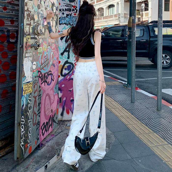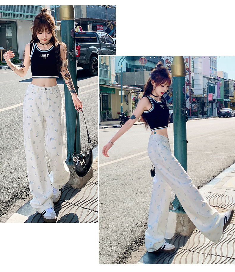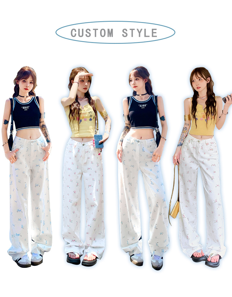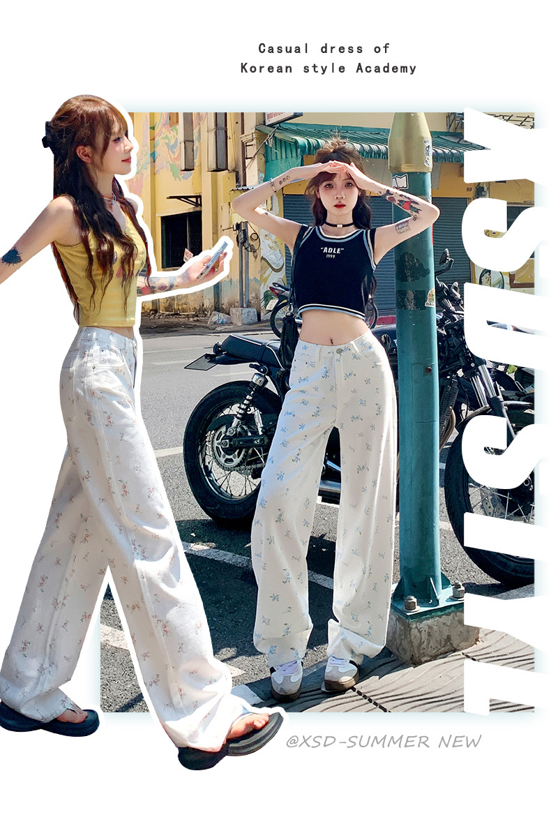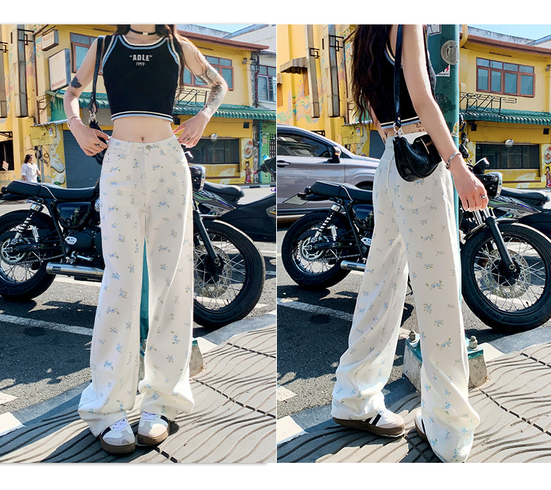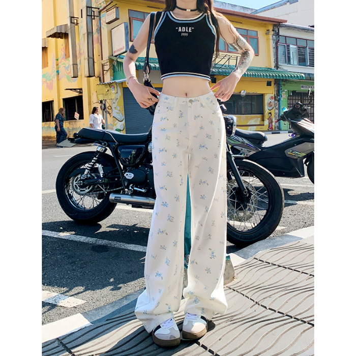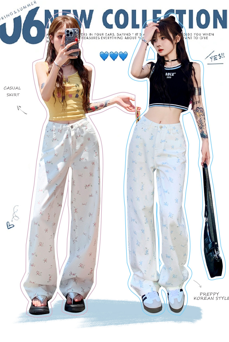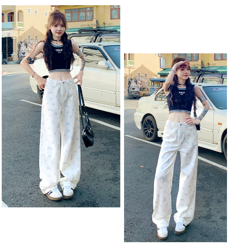 흰색 꽃 넓은 다리 청바지 여성의 2024 여름 새로운 높은 허리 디자인 감각 느슨한 슬리밍 스트레이트 바지스토어 가기
