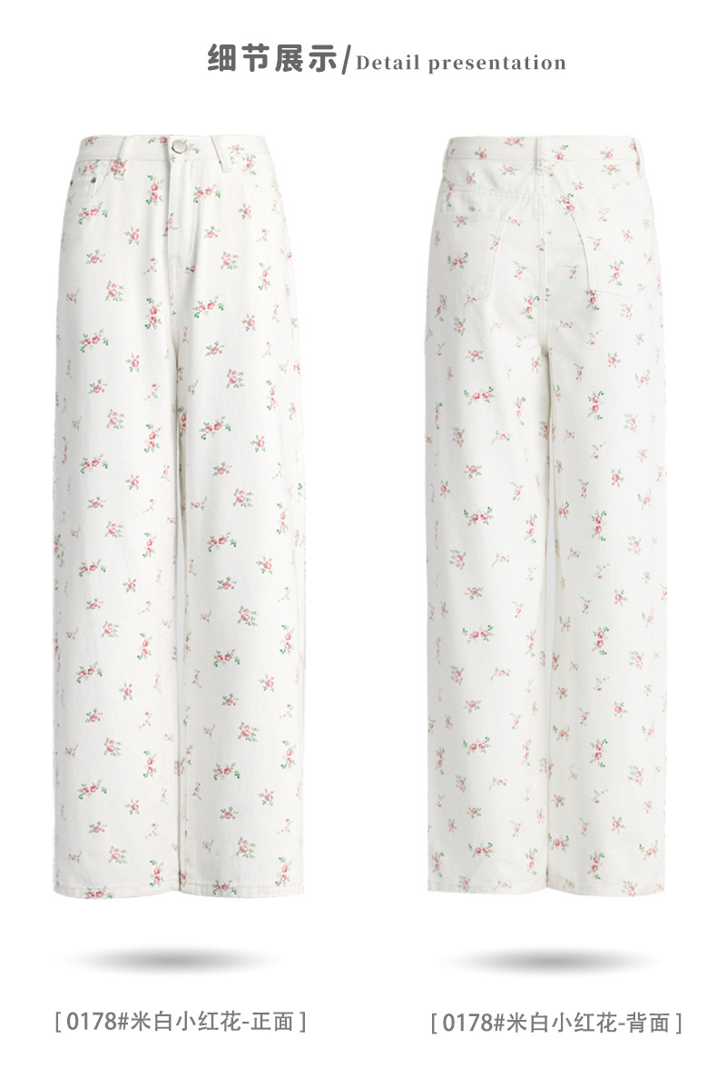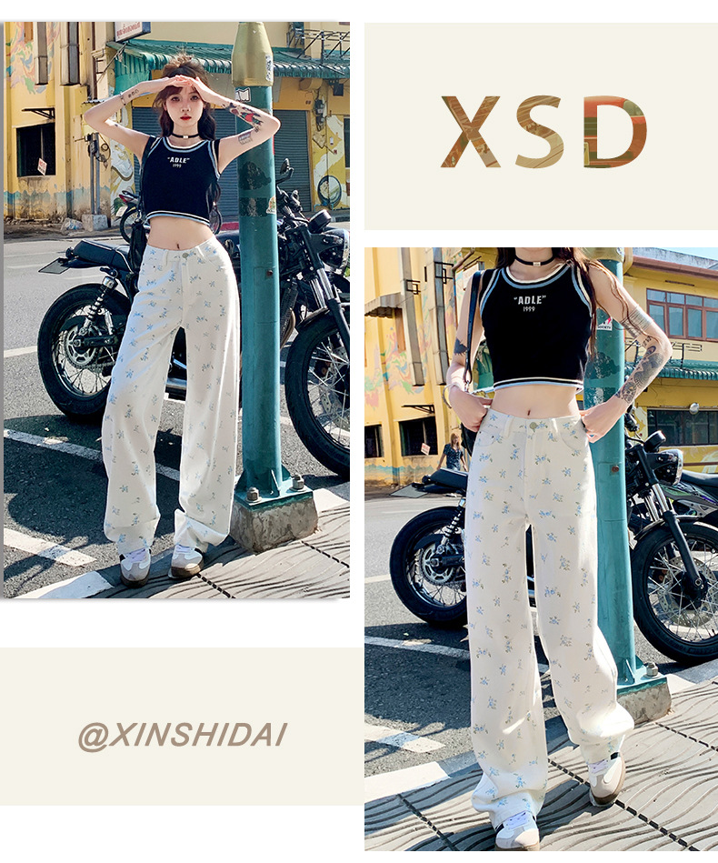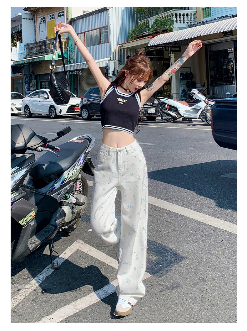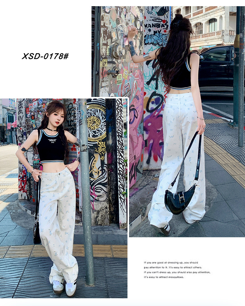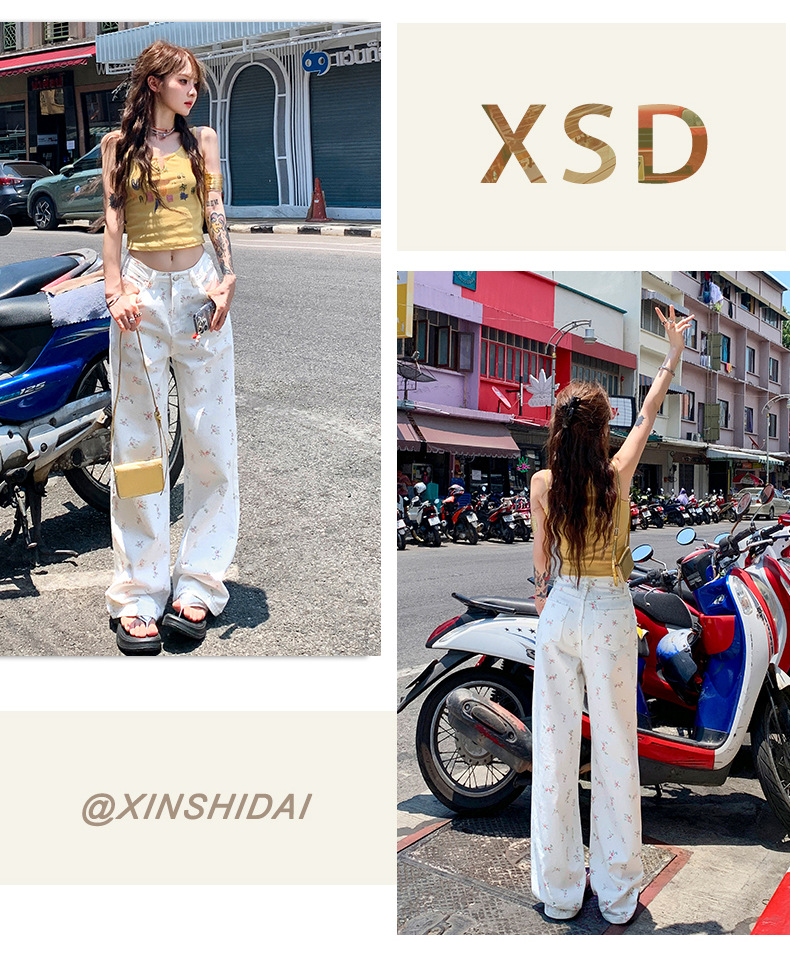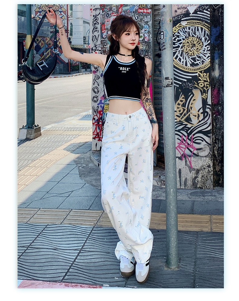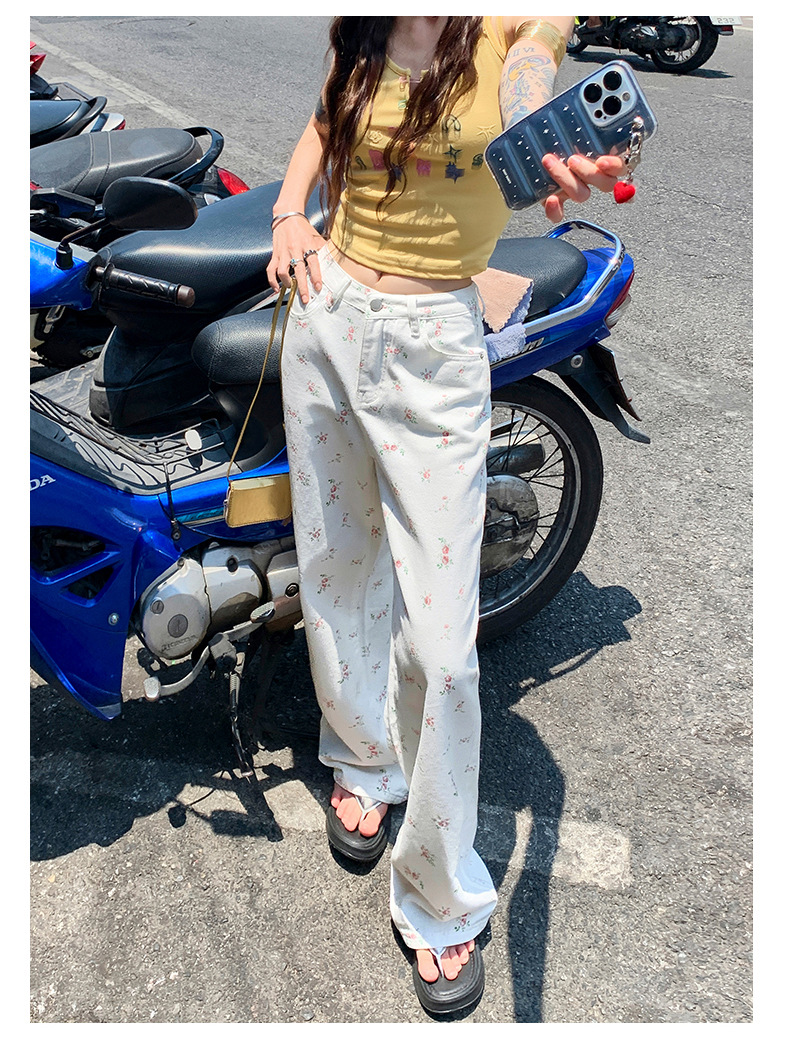 흰색 꽃 넓은 다리 청바지 여성의 2024 여름 새로운 높은 허리 디자인 감각 느슨한 슬리밍 스트레이트 바지스토어 가기