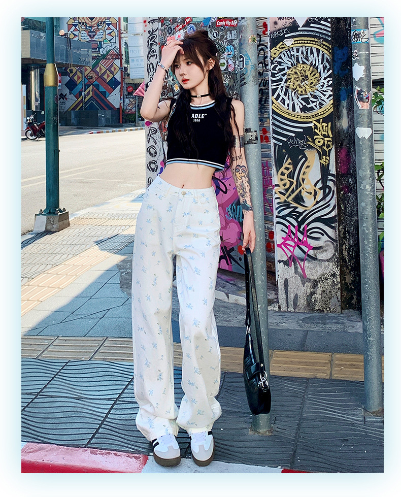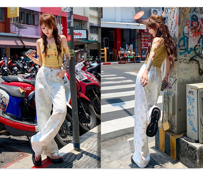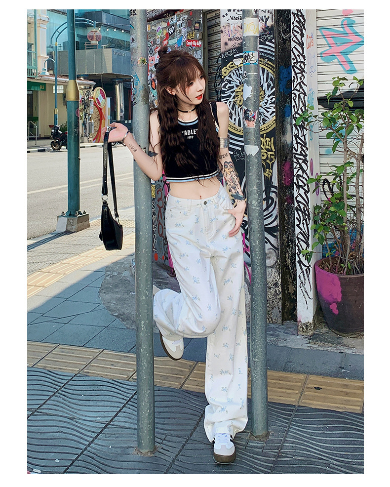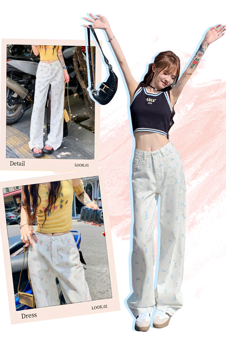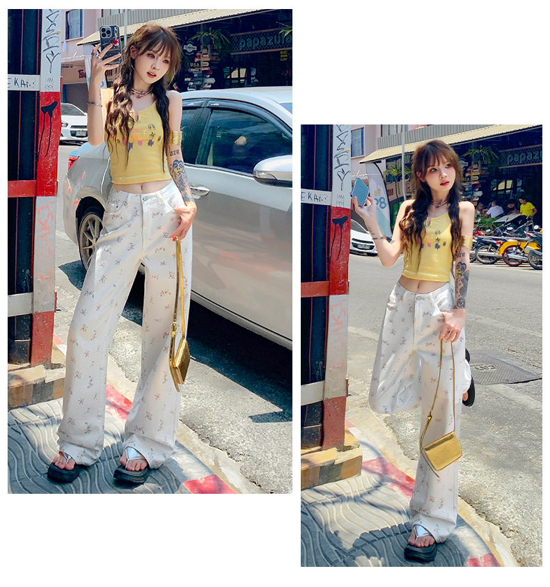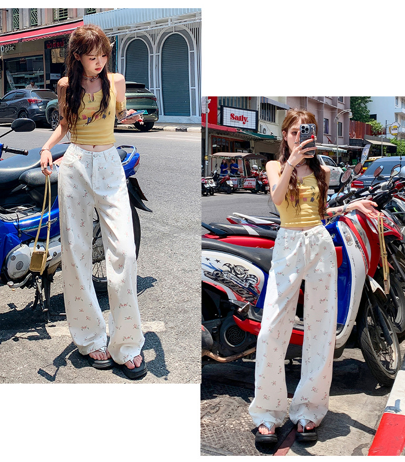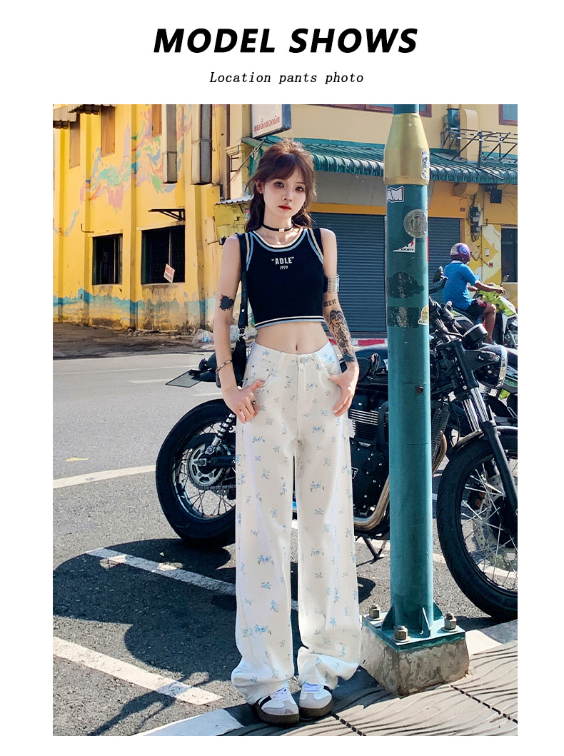 흰색 꽃 넓은 다리 청바지 여성의 2024 여름 새로운 높은 허리 디자인 감각 느슨한 슬리밍 스트레이트 바지스토어 가기