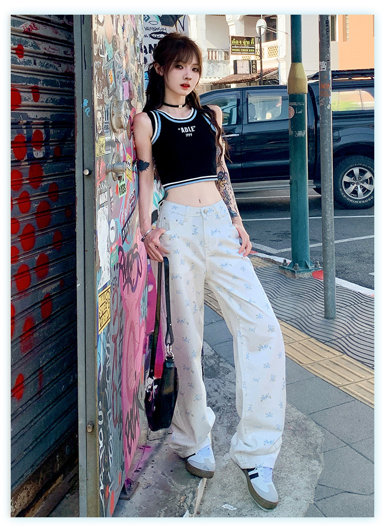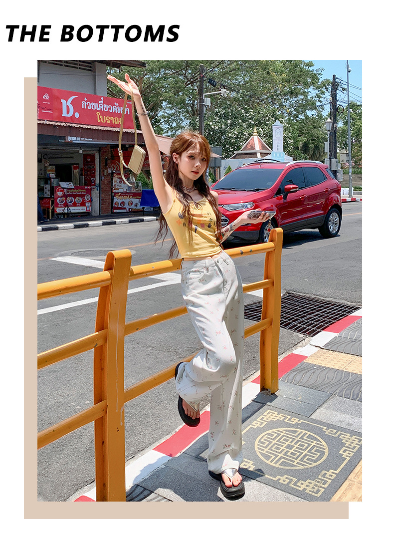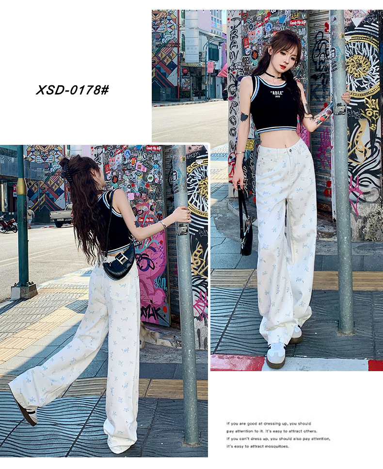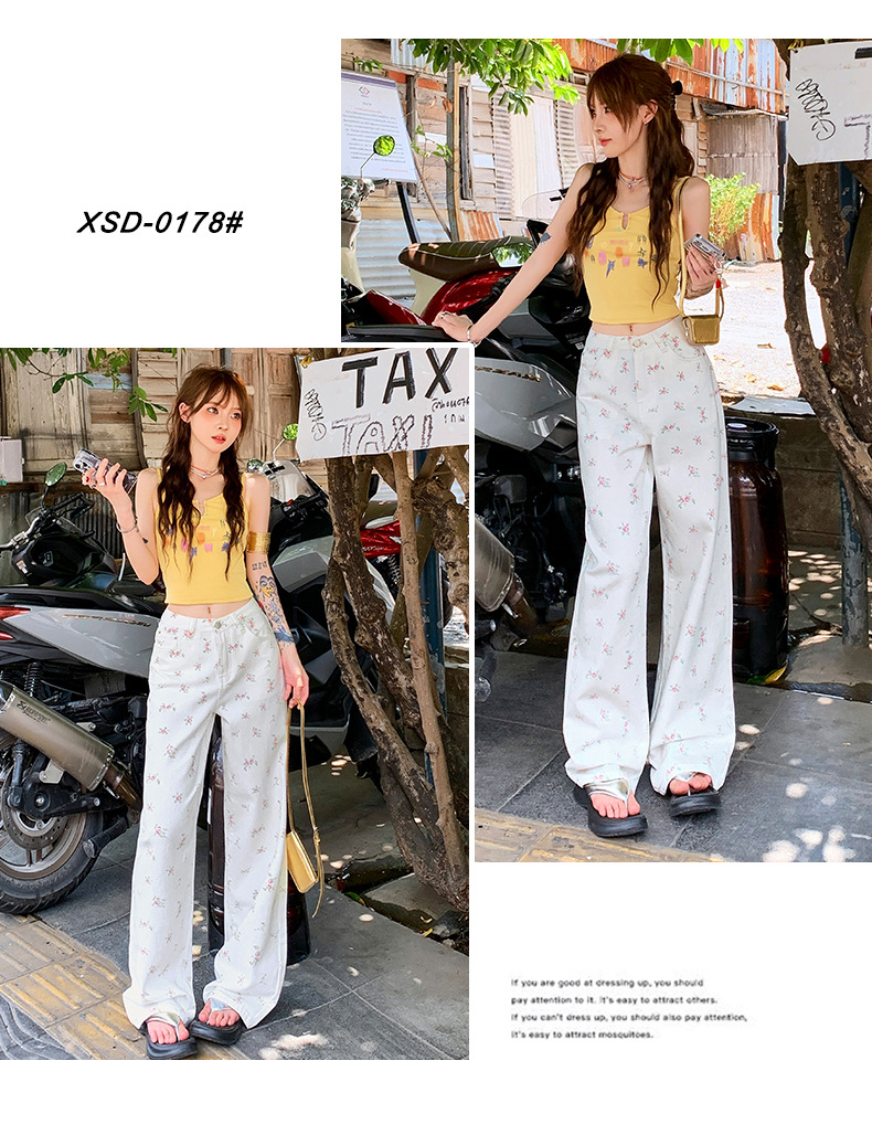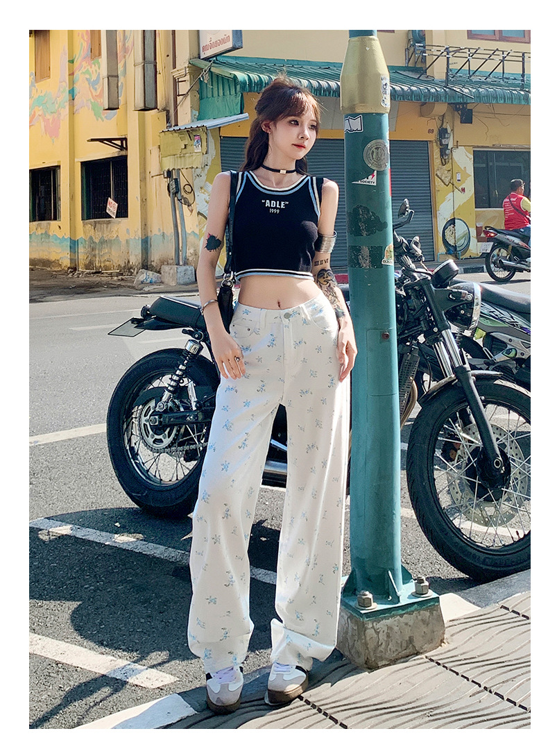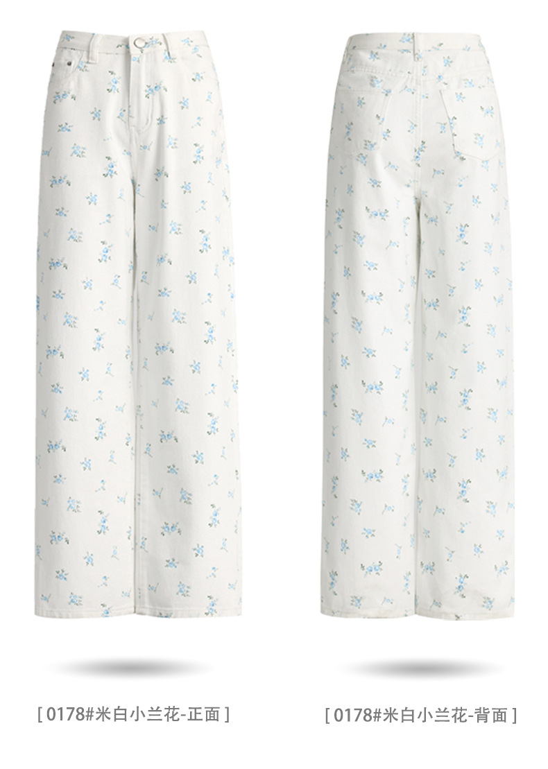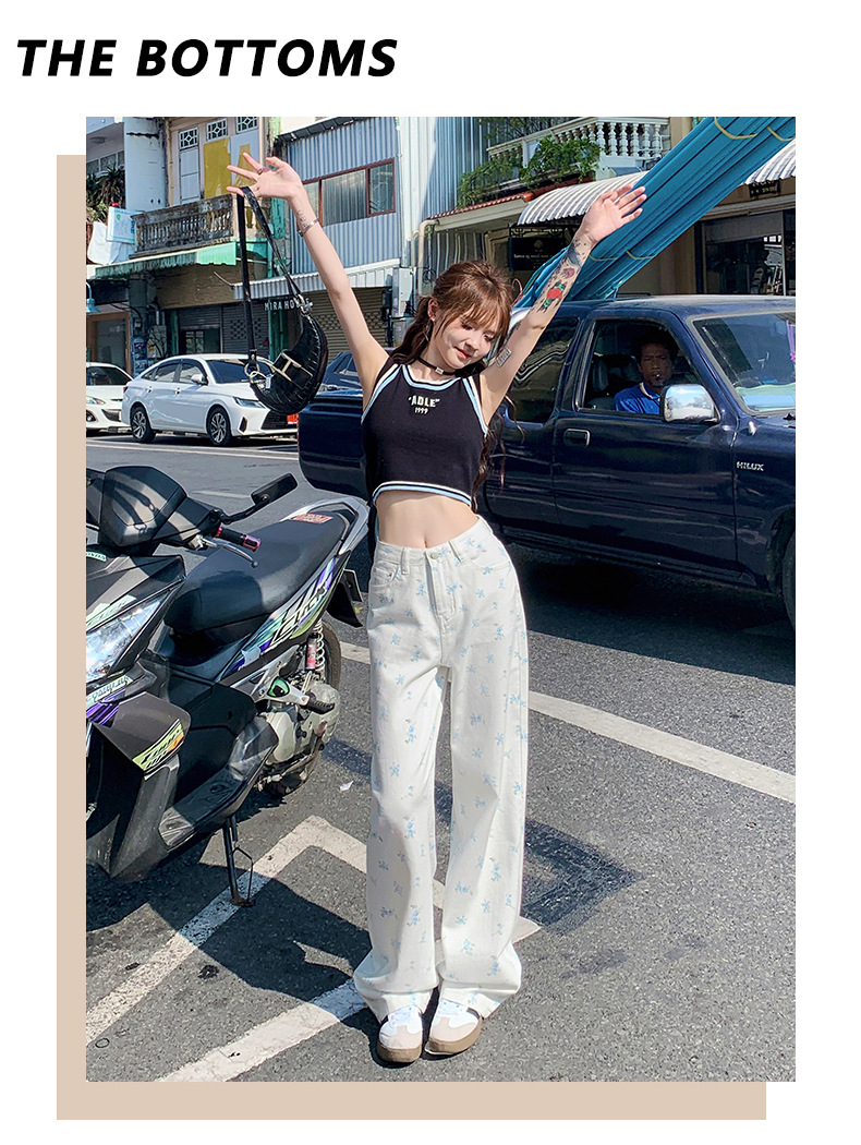 흰색 꽃 넓은 다리 청바지 여성의 2024 여름 새로운 높은 허리 디자인 감각 느슨한 슬리밍 스트레이트 바지스토어 가기