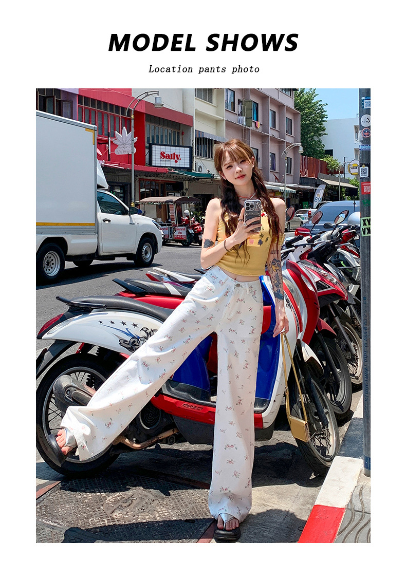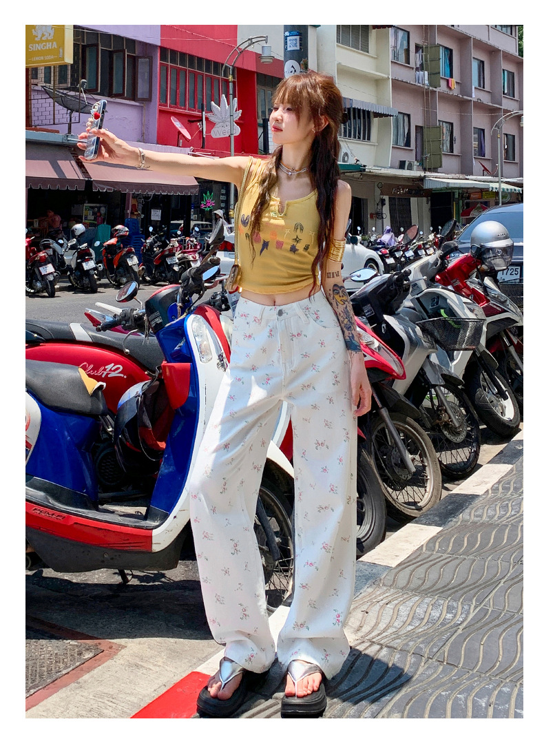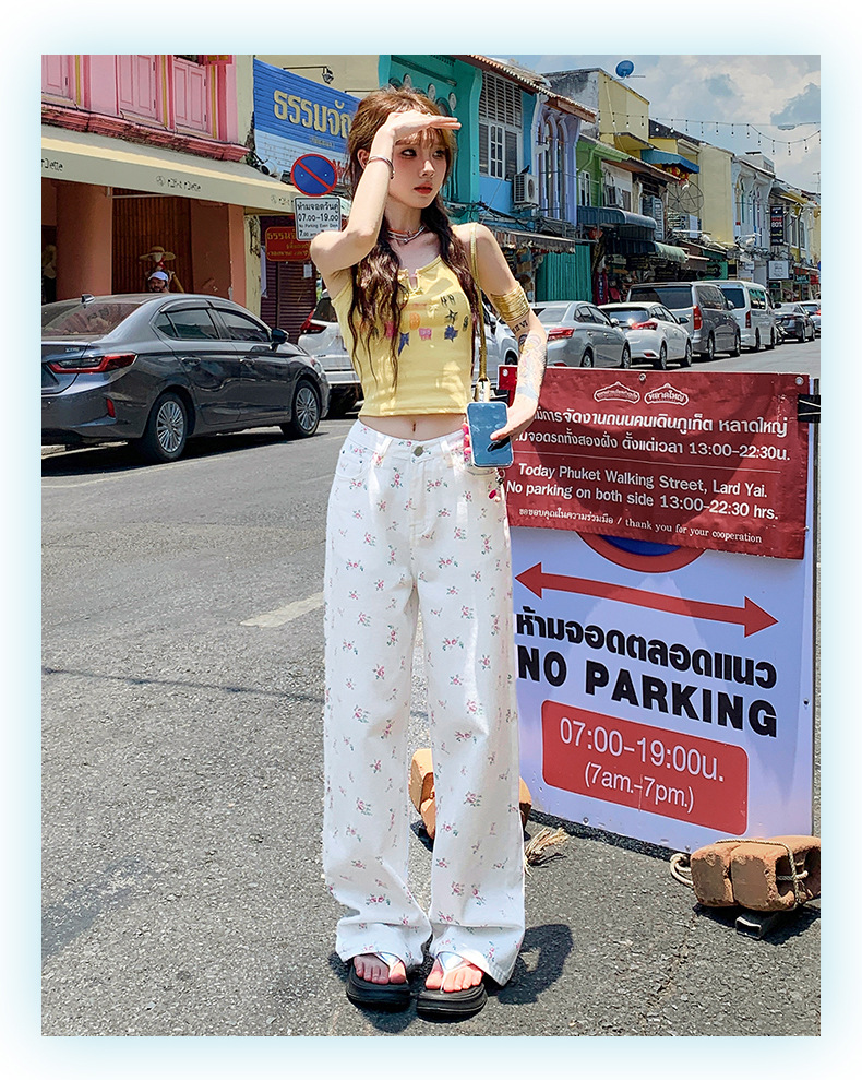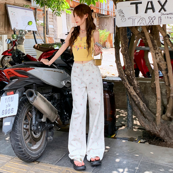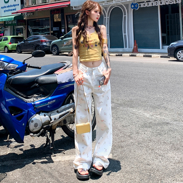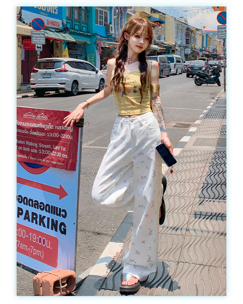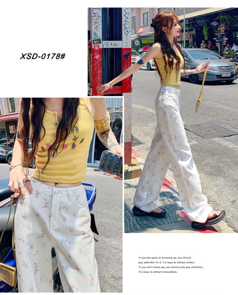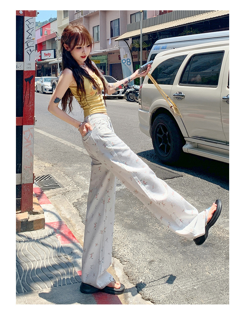 흰색 꽃 넓은 다리 청바지 여성의 2024 여름 새로운 높은 허리 디자인 감각 느슨한 슬리밍 스트레이트 바지스토어 가기