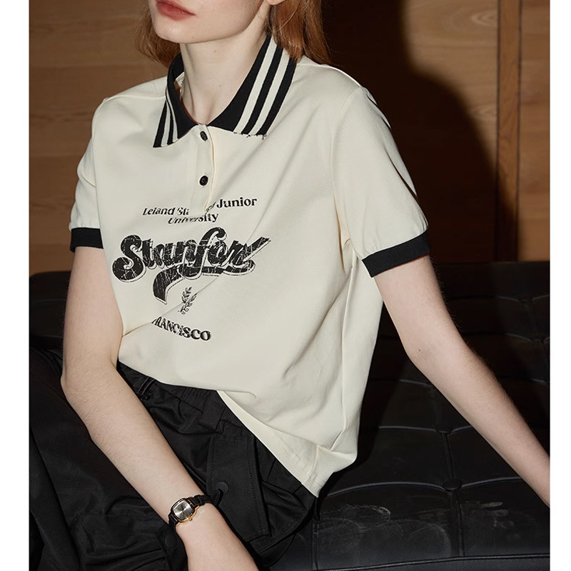 빈티지 아이보리 줄무늬 POLO 칼라 티셔츠 여성용 2024 년 여름 새로운 세련된 인쇄 대비 짧은 소매스토어 가기