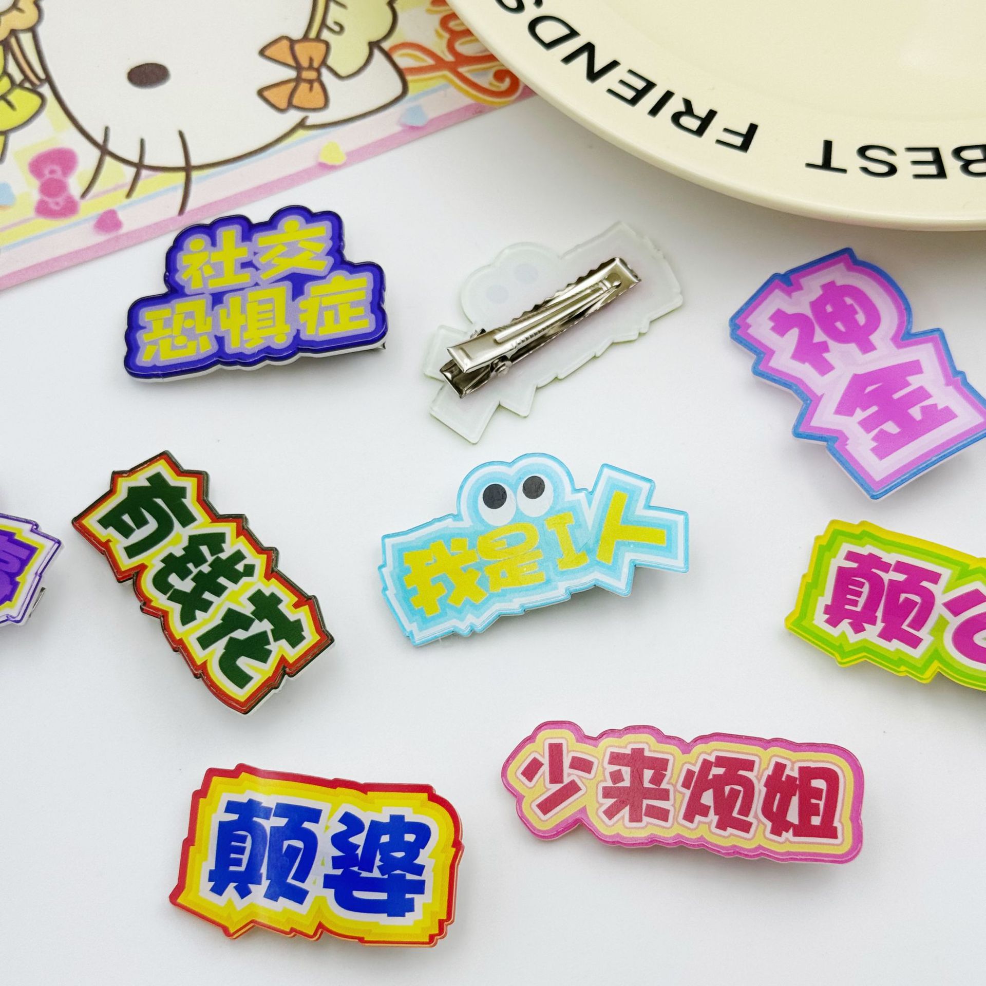 창조적 인 성격 네트워크 텍스트 머리핀 이상한 캐릭터 플레이트 뱅 만화 재미 학생 헤어 액세서리 여성