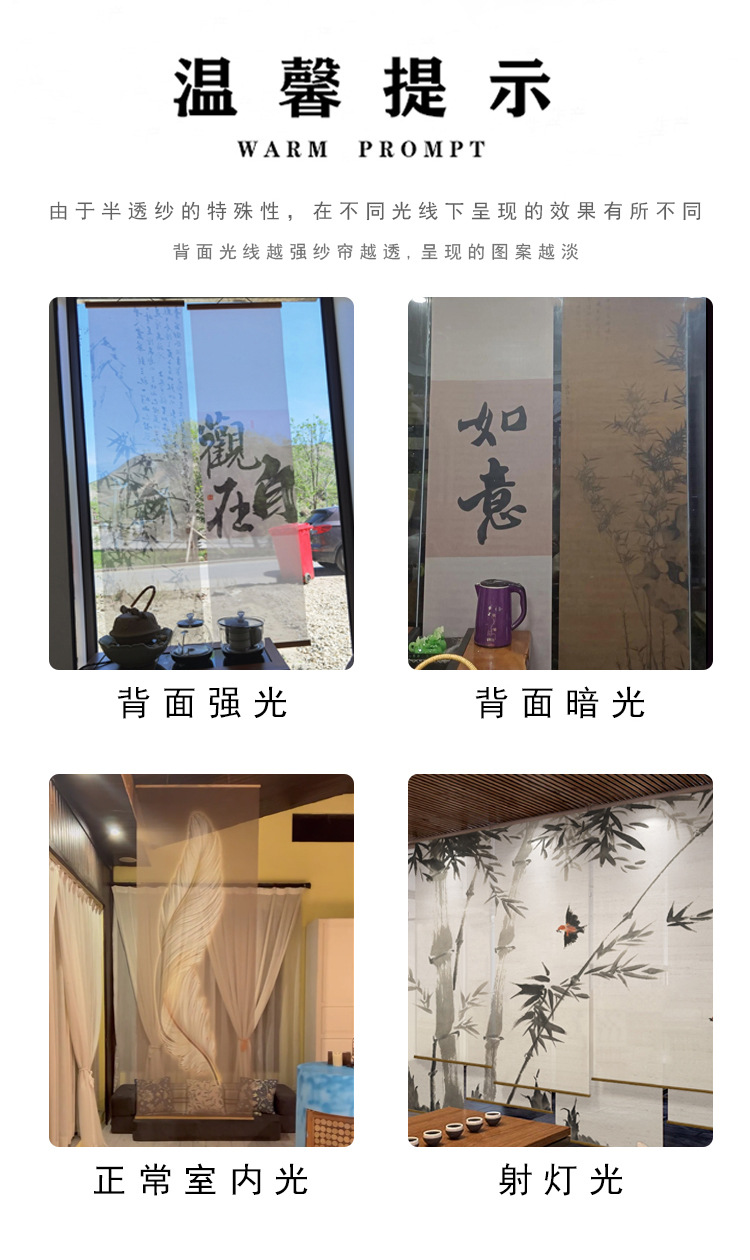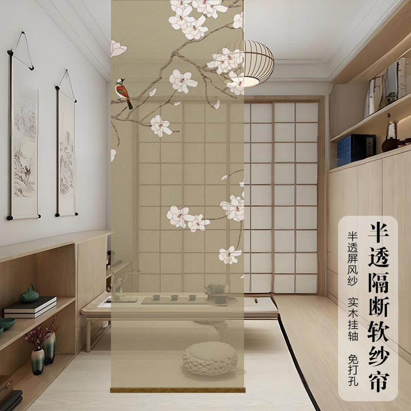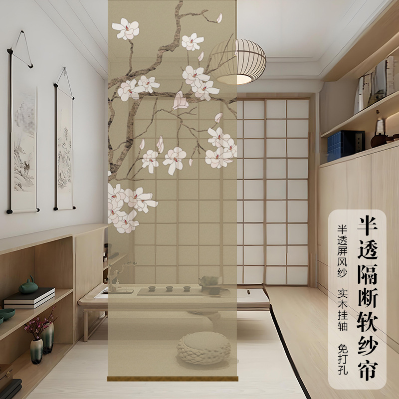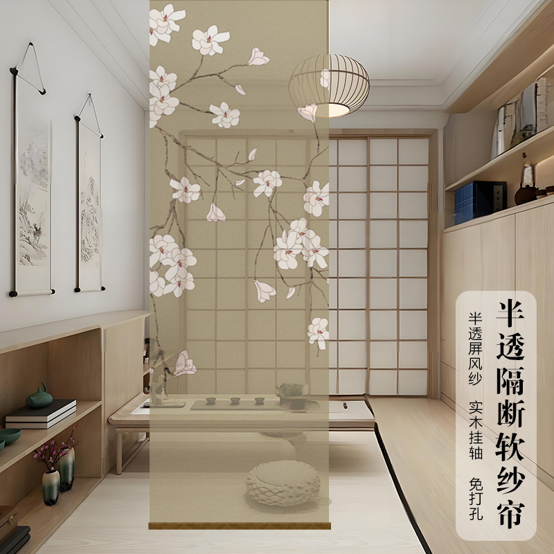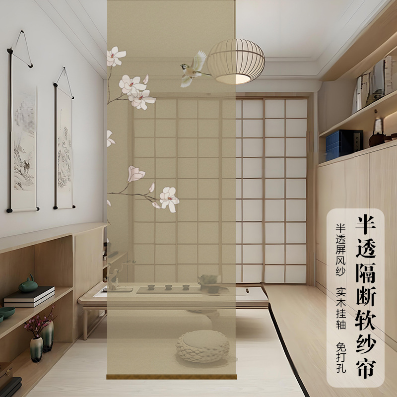 半透纱纱幔装饰画双面挂画半透卷帘纱帘窗帘屏风日式侘寂中国风古风复古隔断挂帘透光禅意透景半透玻璃定制玄关
