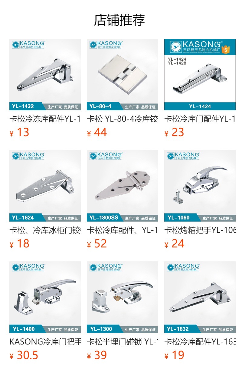 玉环玉龙制冷机械厂是一家专业从事门把碰锁和门铰链等五金系列制品的生产、销售及售后服务为一体的企业。企业始建于1988年,已拥有一支技术优良、经验丰富、管理卓效的工作团队。本企业产品采用锌铝合金压铸、生铁铸造、不锈钢硅溶胶铸造、表面镀铬、电泳镀锌,广泛适用于各类柜门配套,特别在冷库、厨房冰箱、烤箱、冷藏柜等需高密封的产品上更显特色的高密封性能。本厂一直秉持“诚信立业、品质至上、技术创新”的宗旨,致力于提升“玉龙”“卡松”品牌。企业以先进的工艺、优良的品质、完善的服务饮誉国内外,本厂竭诚欢迎国内外客商来电来函共谋发展。