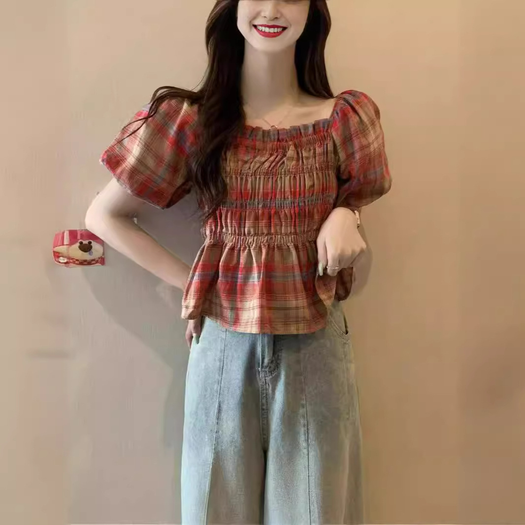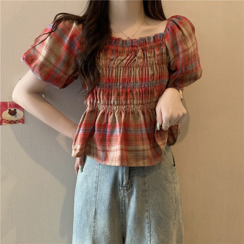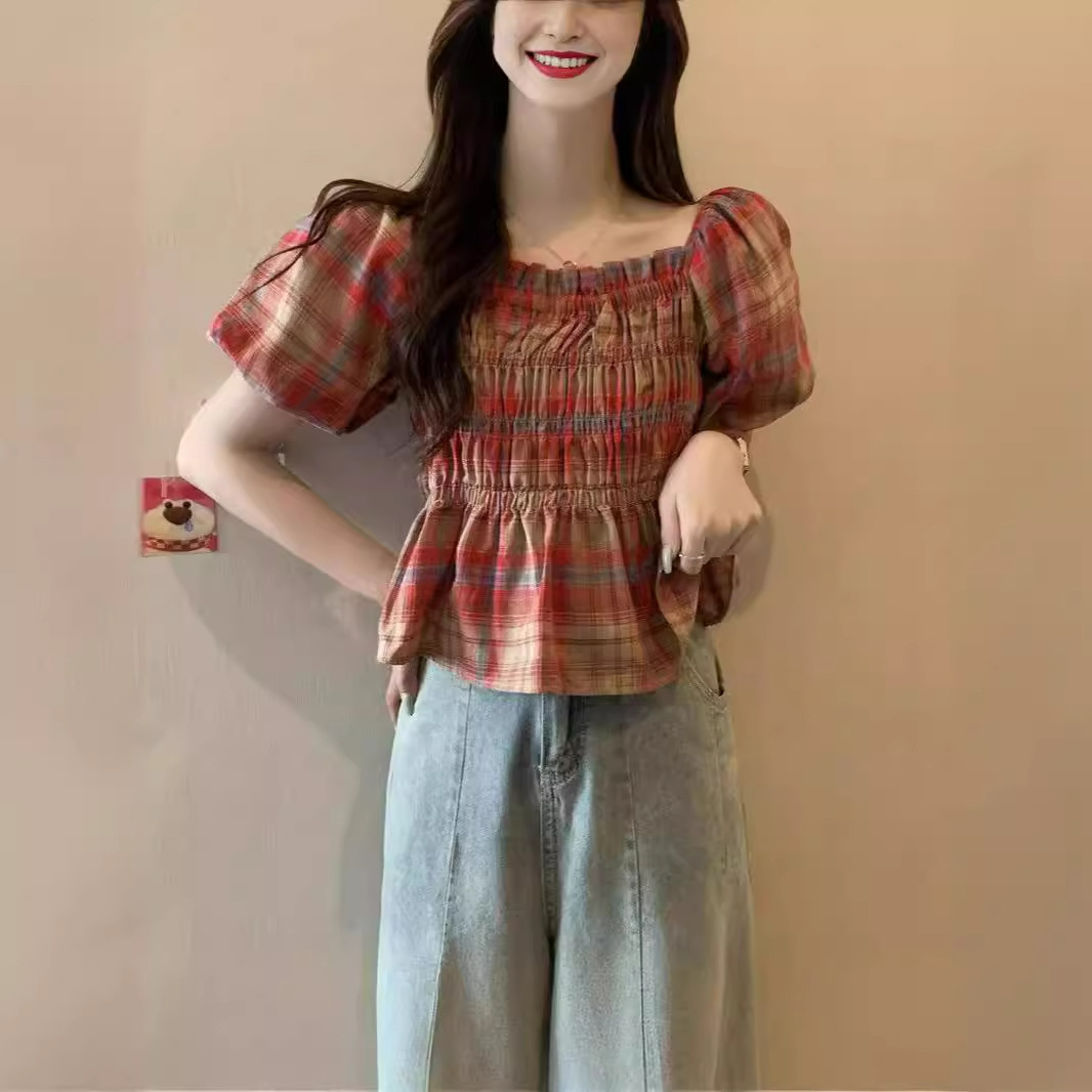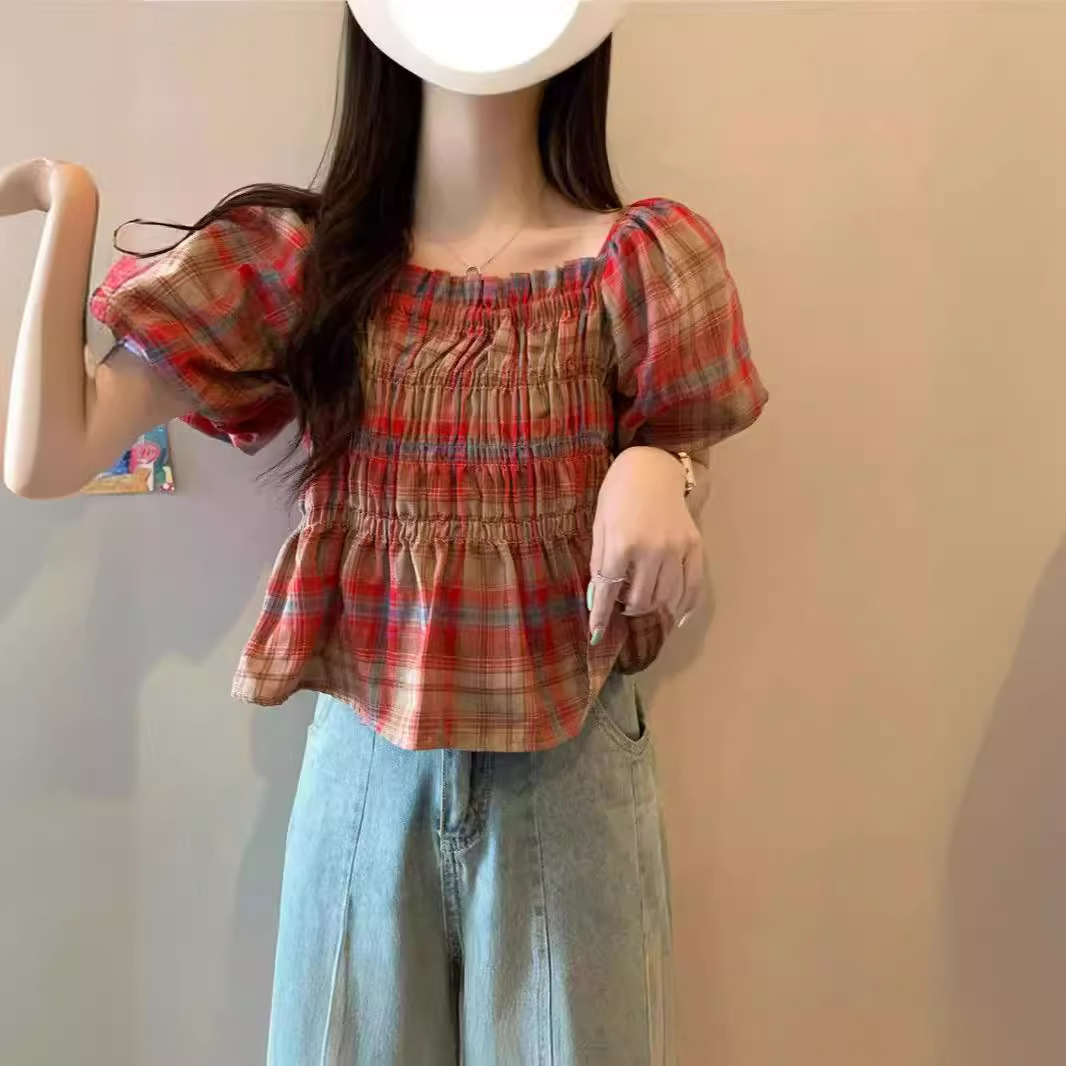 2024 년 새로운 여름 올 매치 체크 무늬 틈새 프랑스 반팔 셔츠 퍼프 소매 학생 쁘띠 탑 여자 여름
