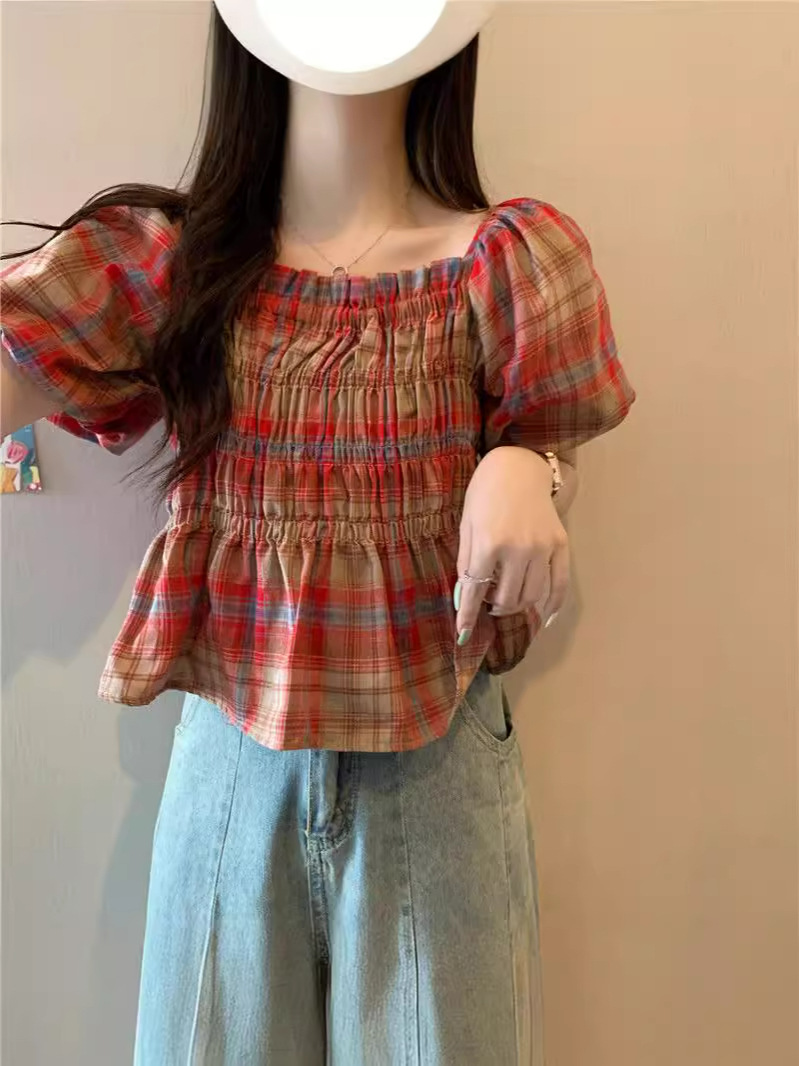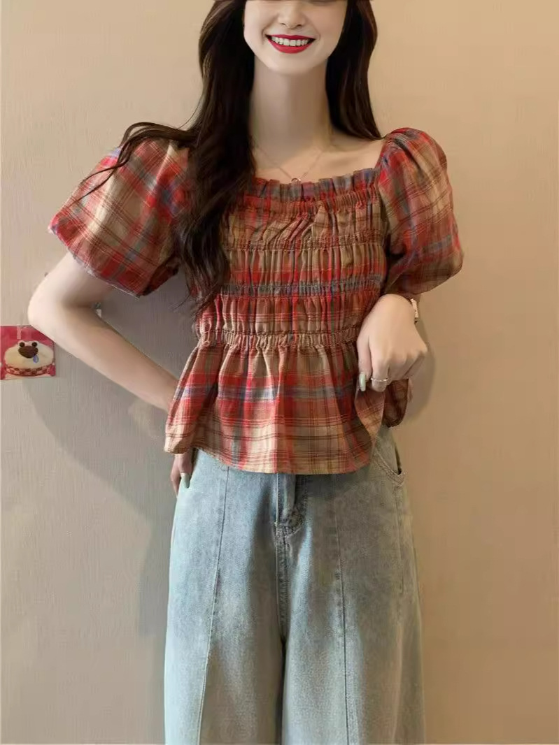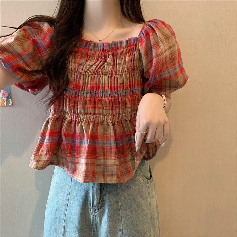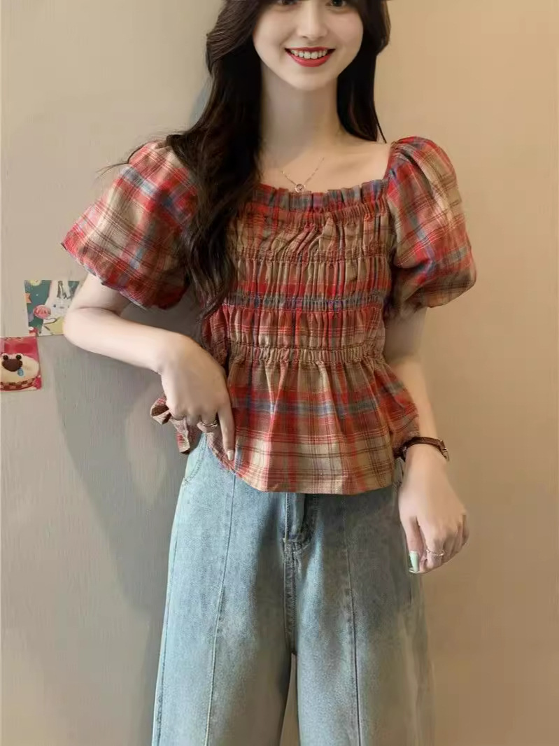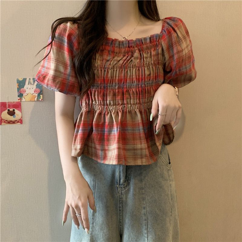 2024 년 새로운 여름 올 매치 체크 무늬 틈새 프랑스 반팔 셔츠 퍼프 소매 학생 쁘띠 탑 여자 여름