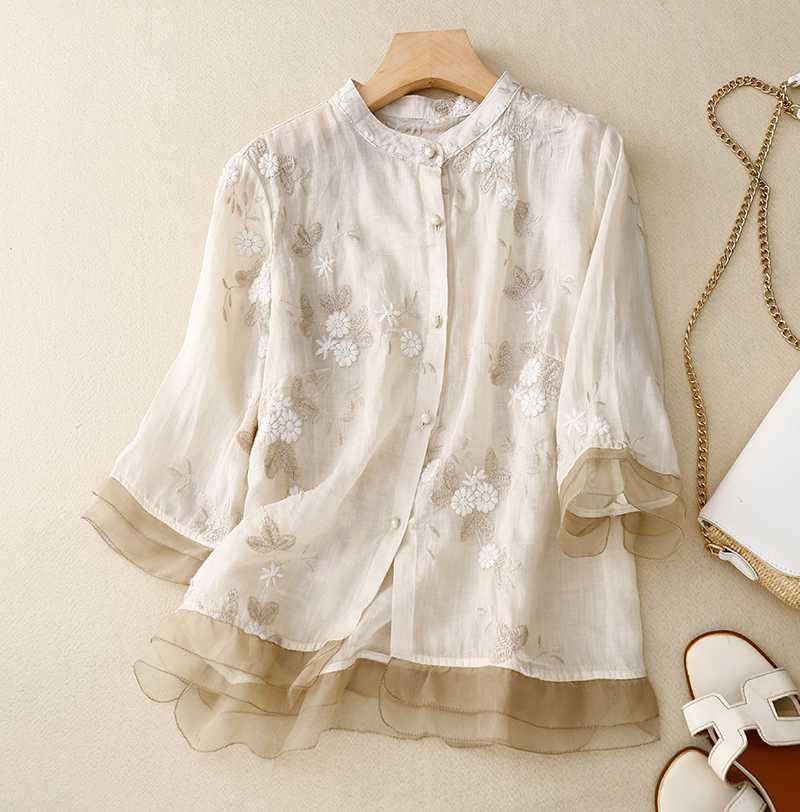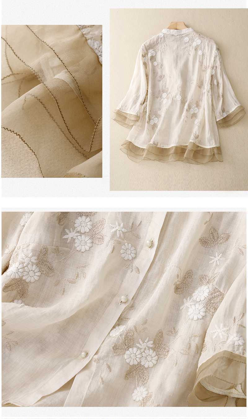 리얼 샷 중공업 라미 탑 여성용 7 점 슬리브 코튼 및 리넨 스티칭 작은 셔츠 여성용 예술적 레트로 새로운 스타일