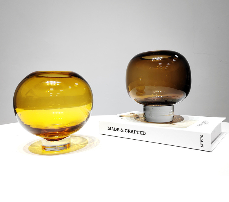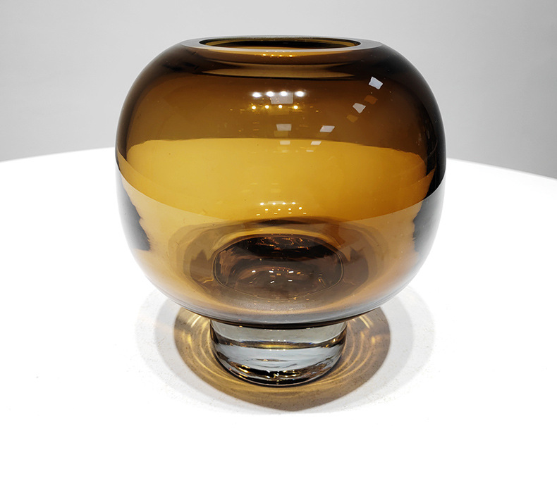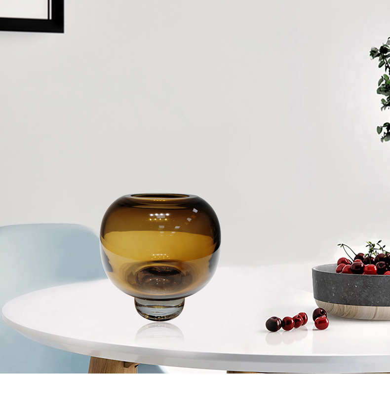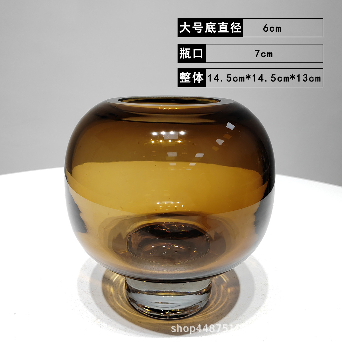 간단한 입장 럭셔리 두꺼운 바닥 라운드 작은 입 유리 꽃병 차 컬러 꽃병 고급 디자이너 레스토랑 데스크탑 꽃 꽃병