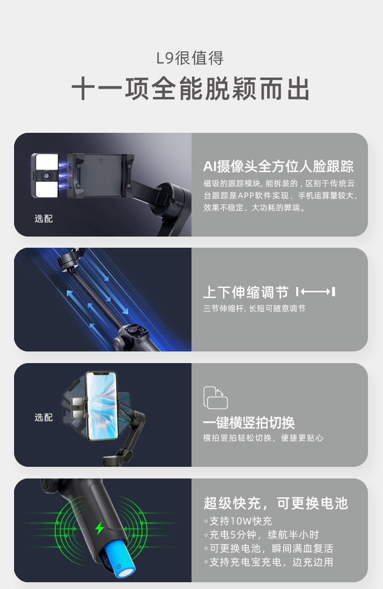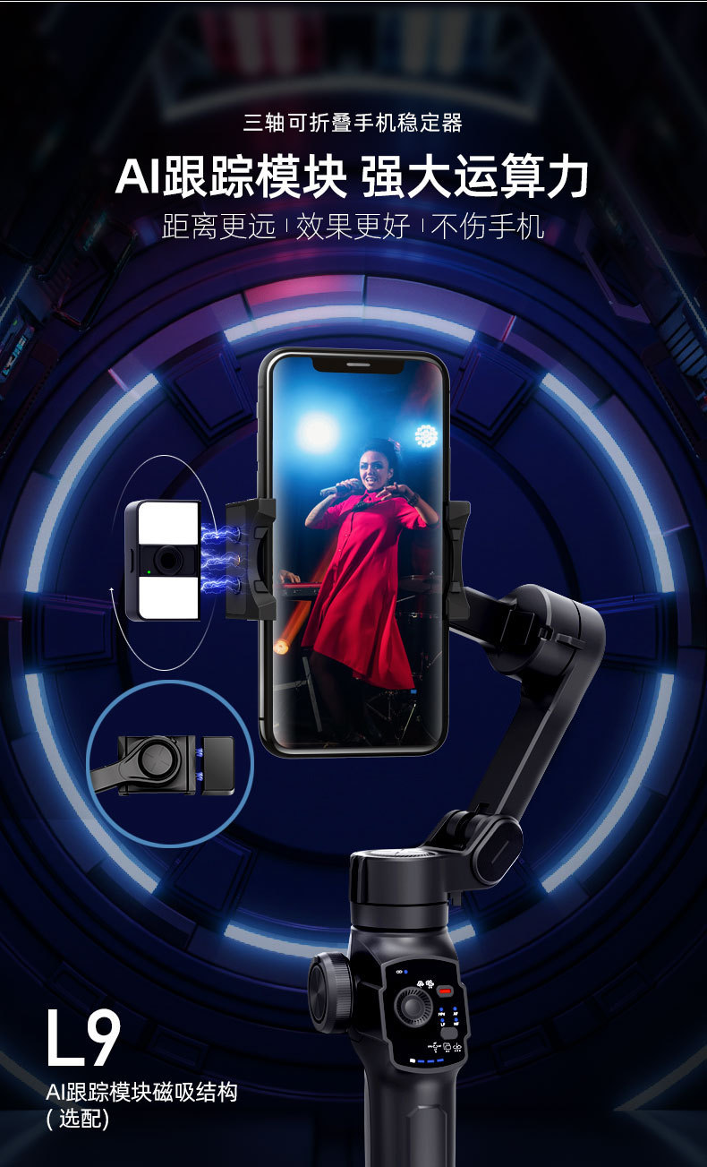 L9Pro 핸드 헬드 3 축 스태빌라이저 안티 쉐이크 팬 틸트 지능형 AI 페이스 후속 팬 틸트 텔레스코픽 로드 스태빌라이저