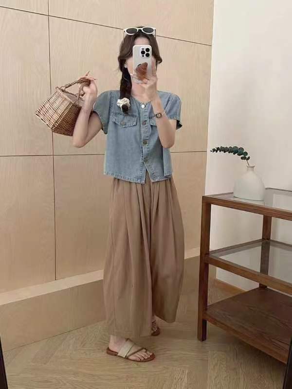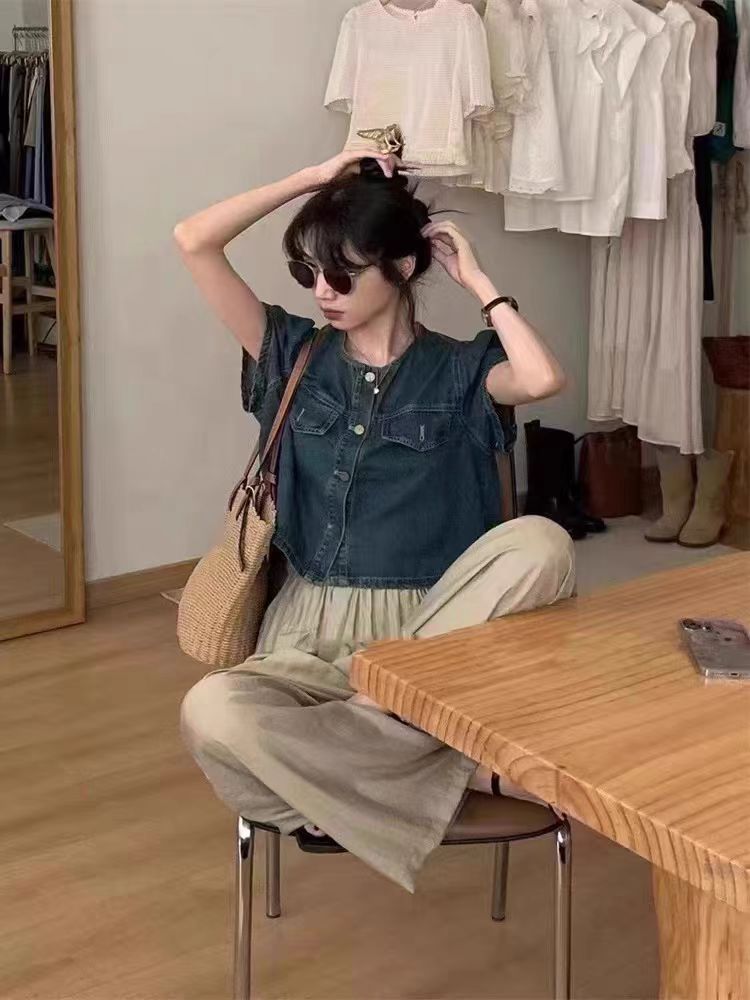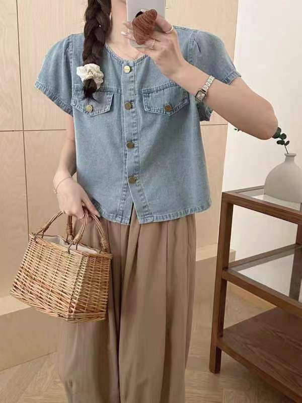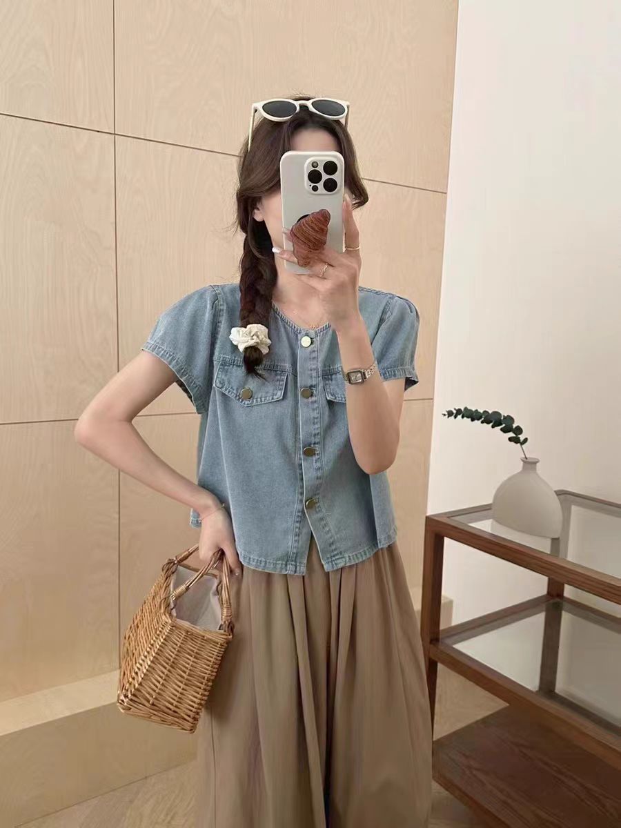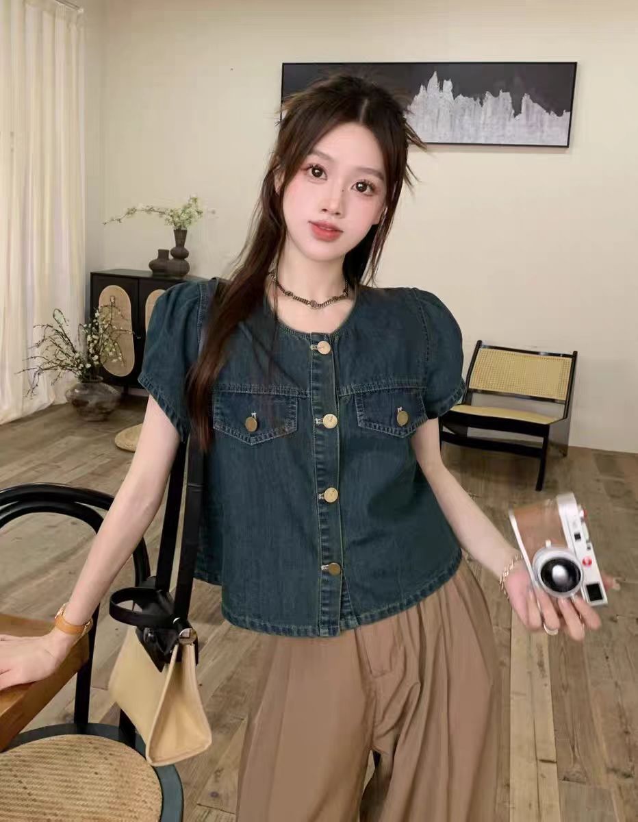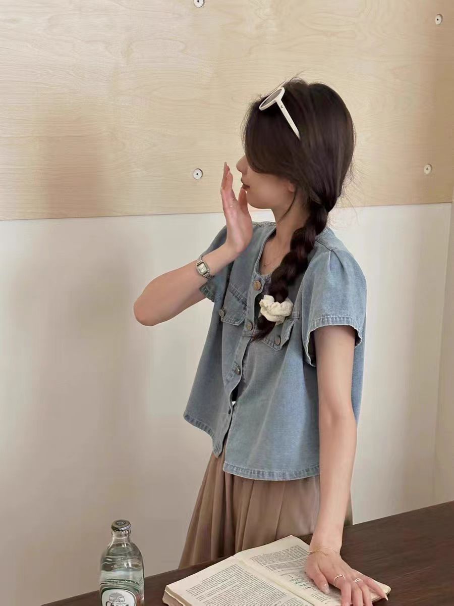 2024 새로운 한국 스타일 여름 신선한 데님 셔츠 여성 디자인 틈새 퍼프 소매 짧은 최고 유행 여성스토어 가기