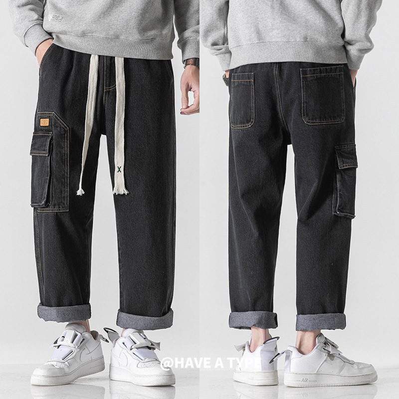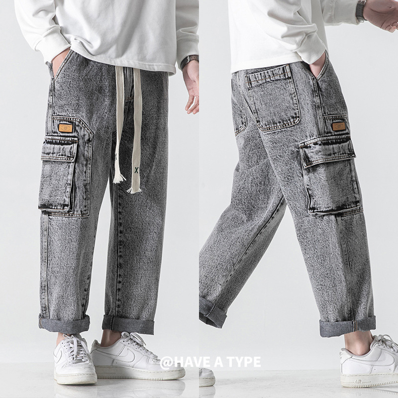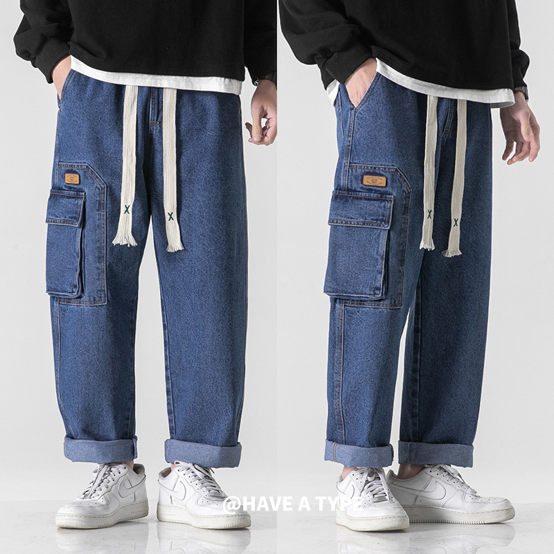 플러스 사이즈 툴링 청바지 남자 2023 봄 한국 스타일 청소년 캐주얼 스트레이트 바지 남성용 레이스 업 엘라테 바지스토어 가기