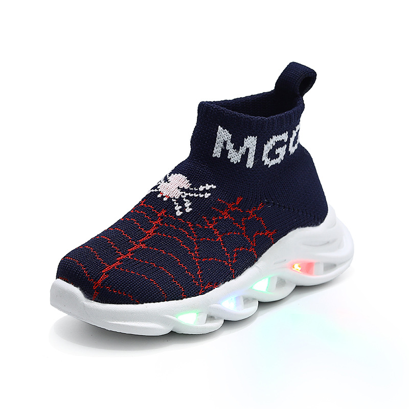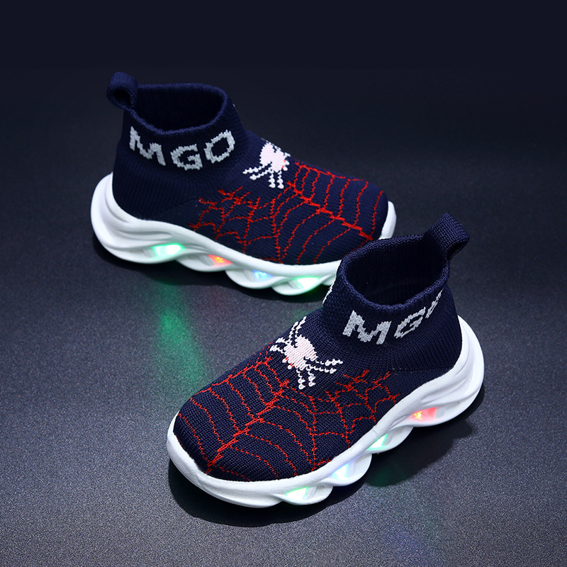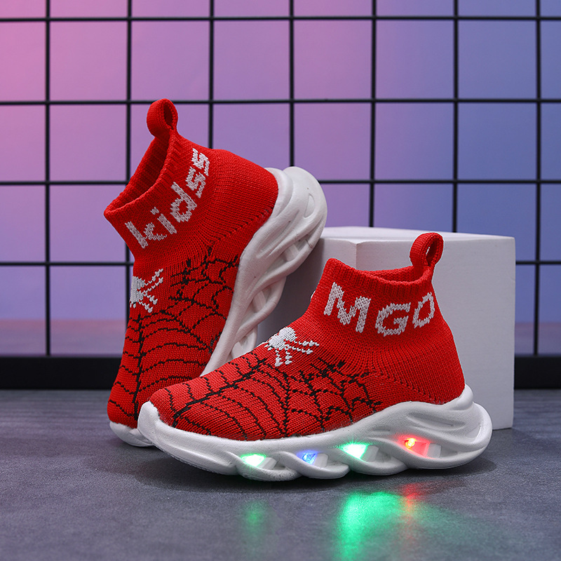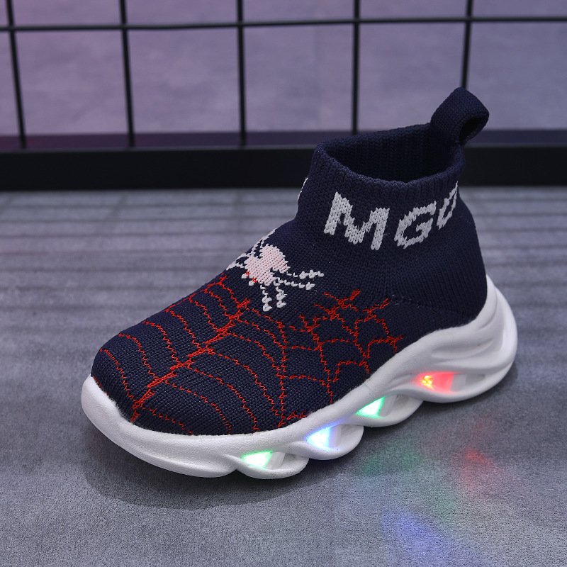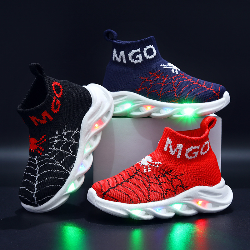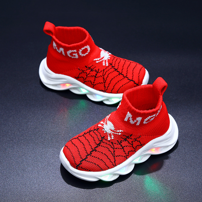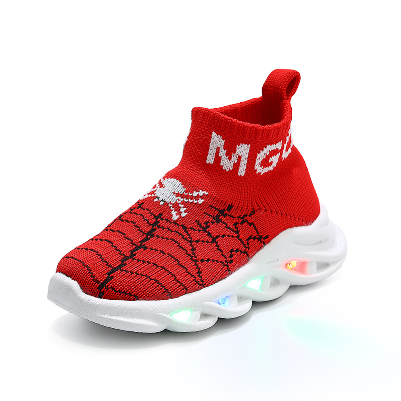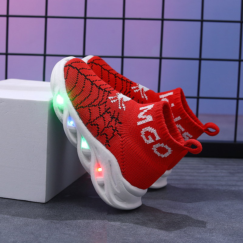 봄과 가을 새로운 어린이 운동화 비행 짠 스파이더 맨 LED 빛나는 어린이 신발 1-6 세 소년 스포츠 캐주얼 신발스토어 가기