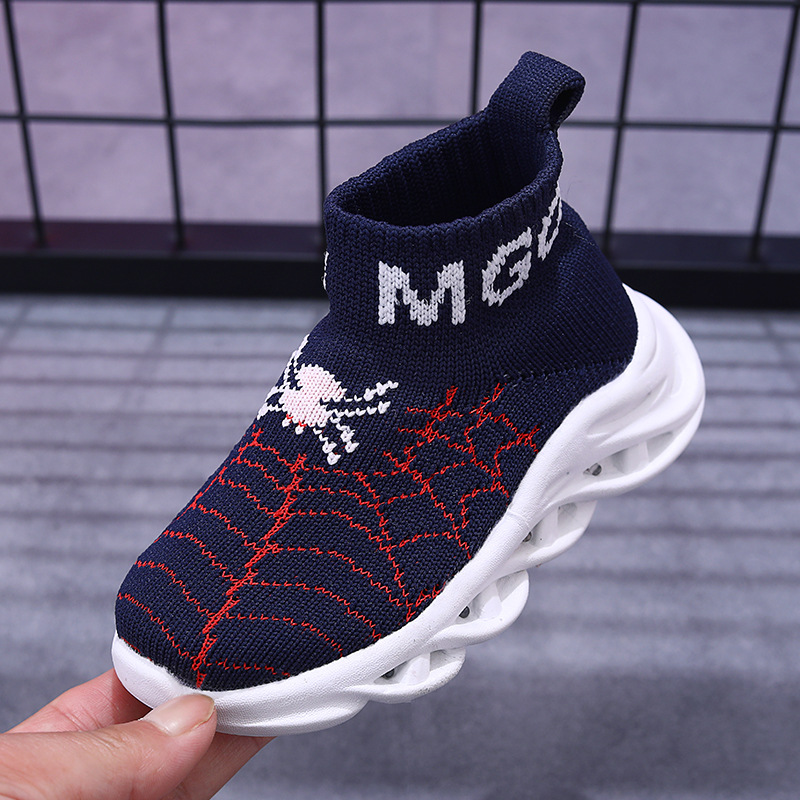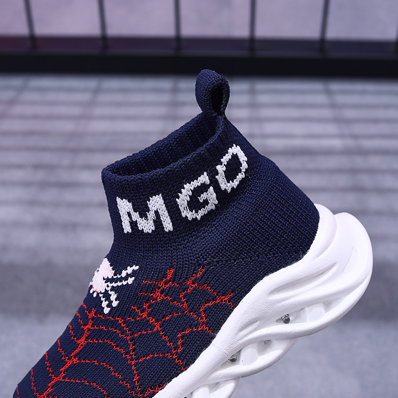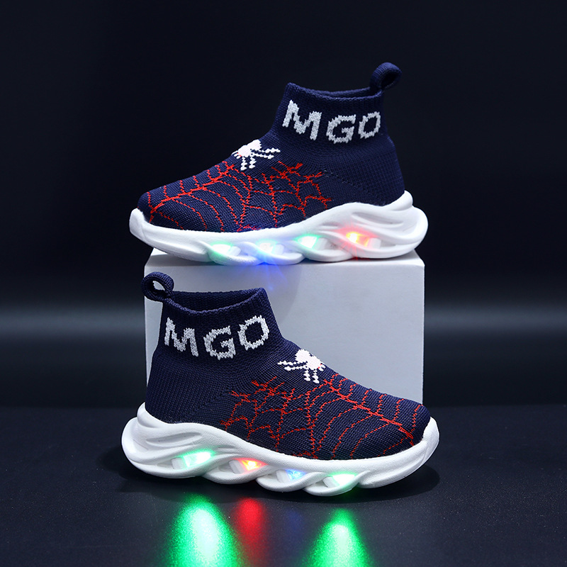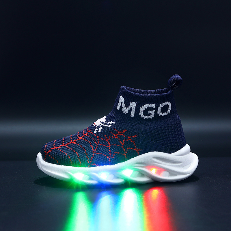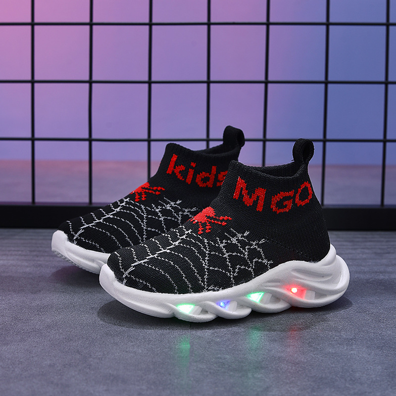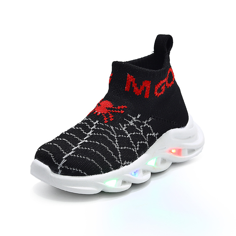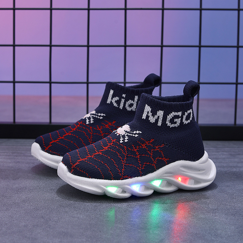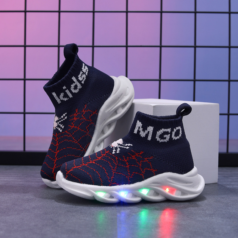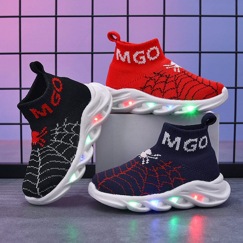 봄과 가을 새로운 어린이 운동화 비행 짠 스파이더 맨 LED 빛나는 어린이 신발 1-6 세 소년 스포츠 캐주얼 신발스토어 가기
