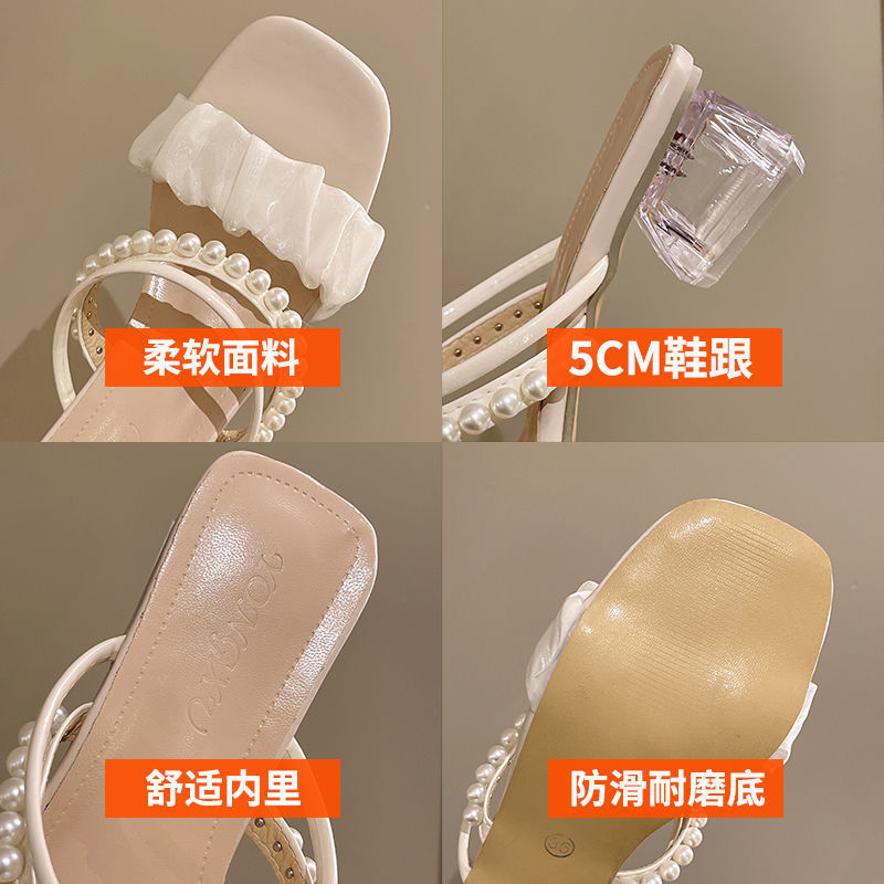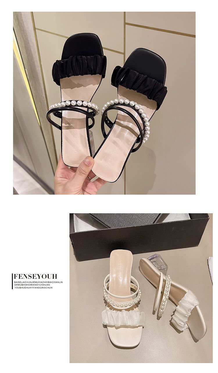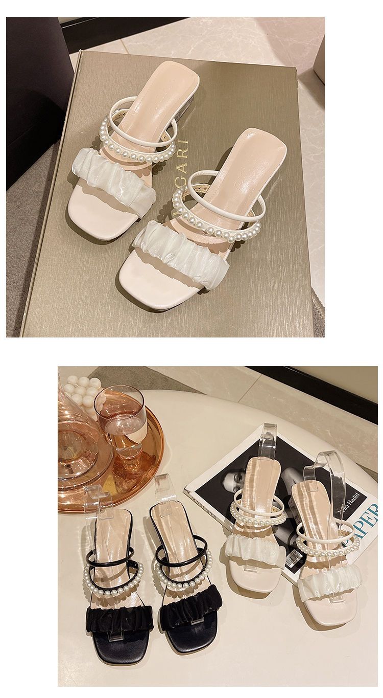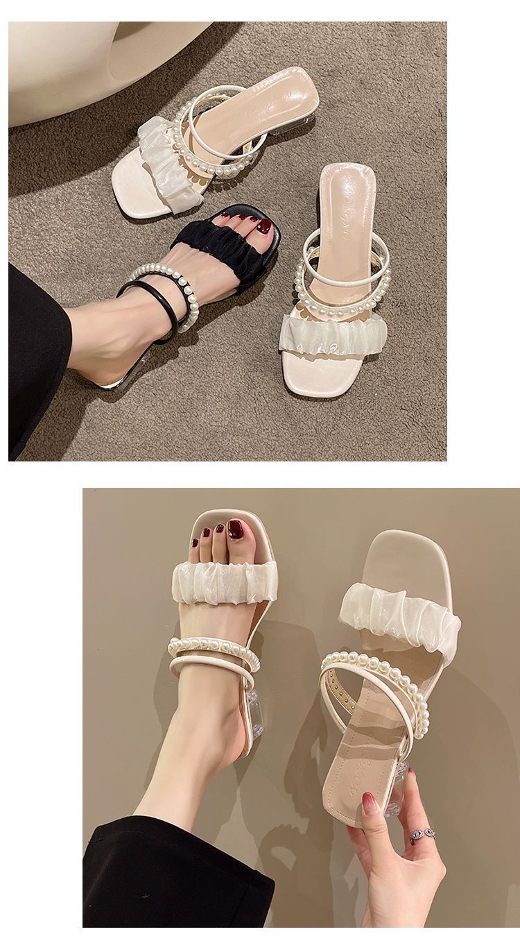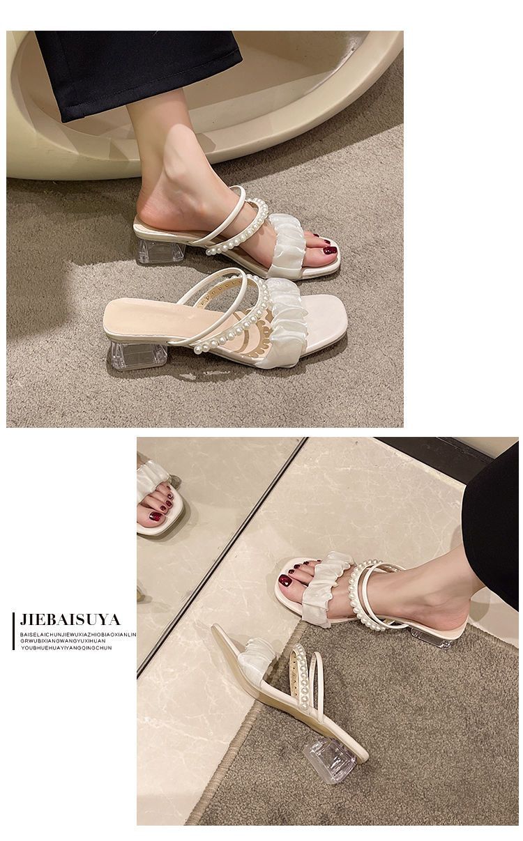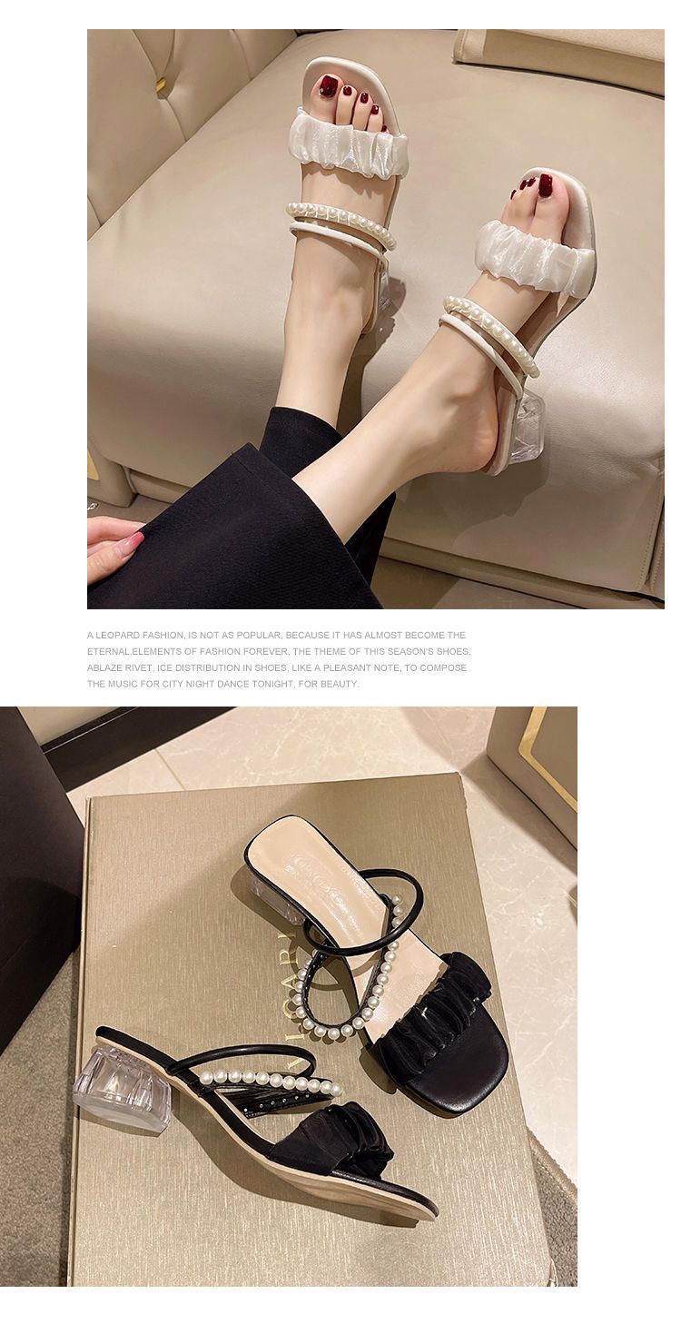 2024 년 여름 새 샌들 및 슬리퍼 여성용 미들 힐 두꺼운 힐 프랑스 올 매치 아우터웨어 요정 스타일 펄 투웨어 샌들