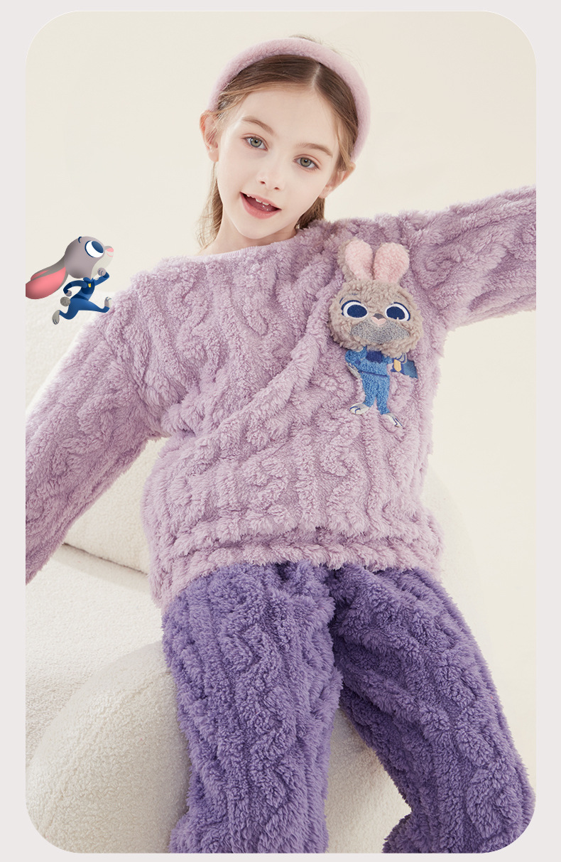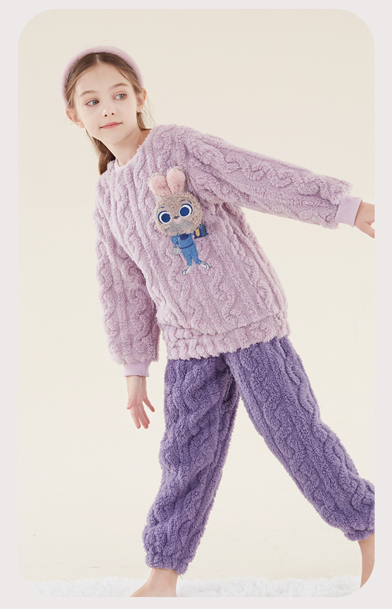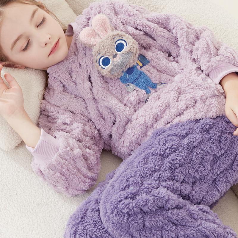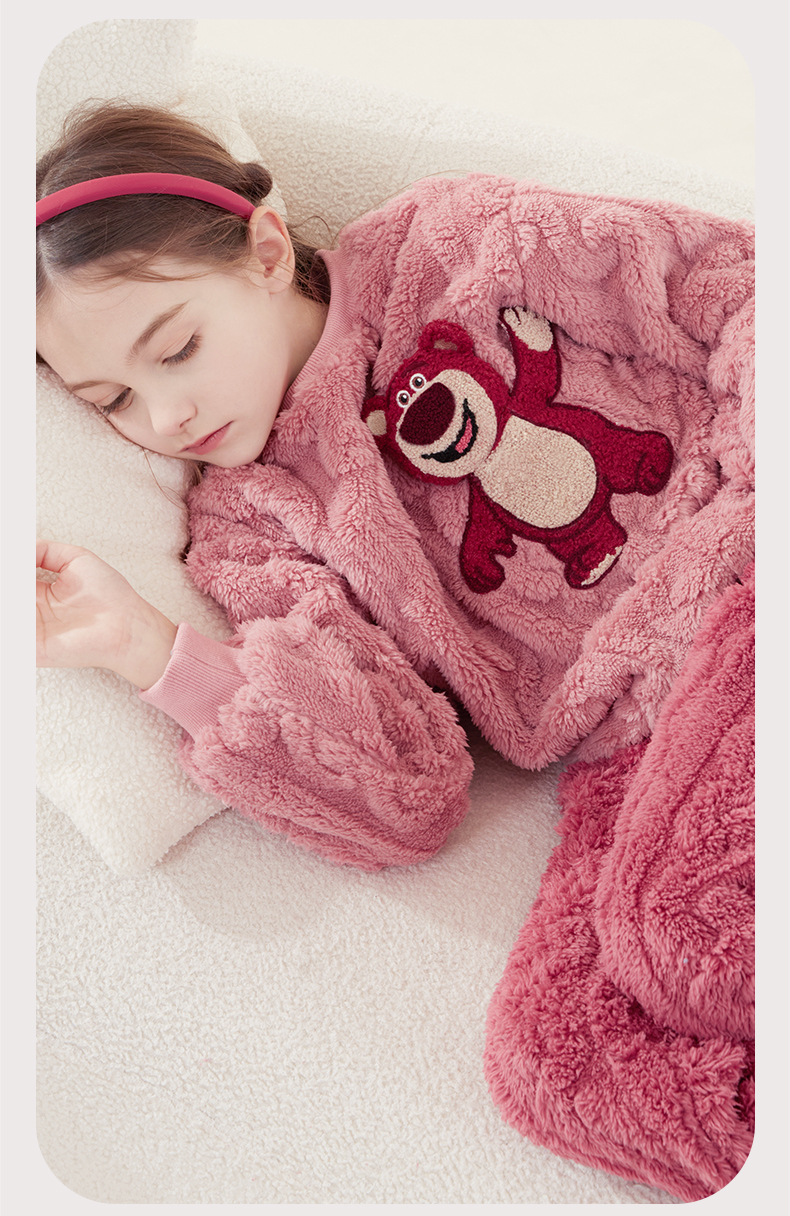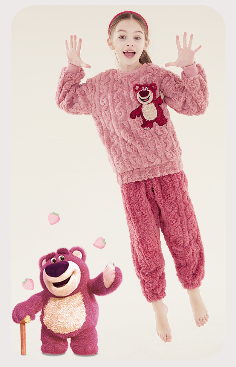 소녀 잠옷 세트 어린이 산호 양털 가을과 겨울 집 옷 플란넬 기모 두꺼운 소녀 부모-자식 딸기 곰
