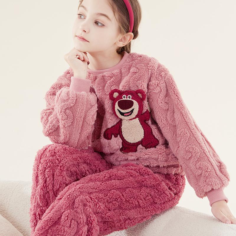 소녀 잠옷 세트 어린이 산호 양털 가을과 겨울 집 옷 플란넬 기모 두꺼운 소녀 부모-자식 딸기 곰스토어 가기