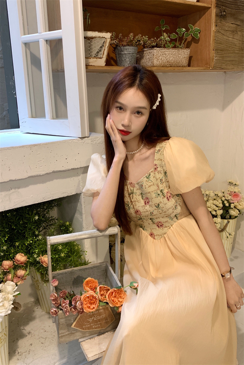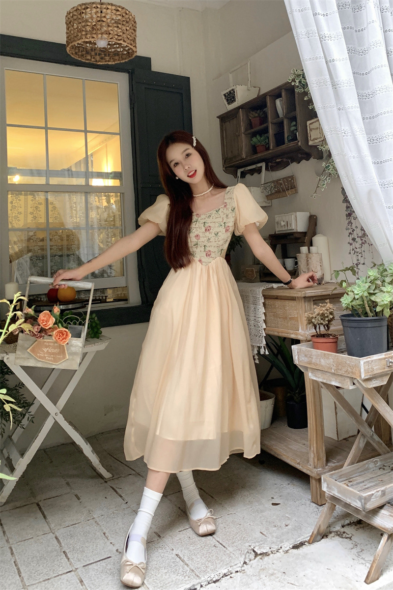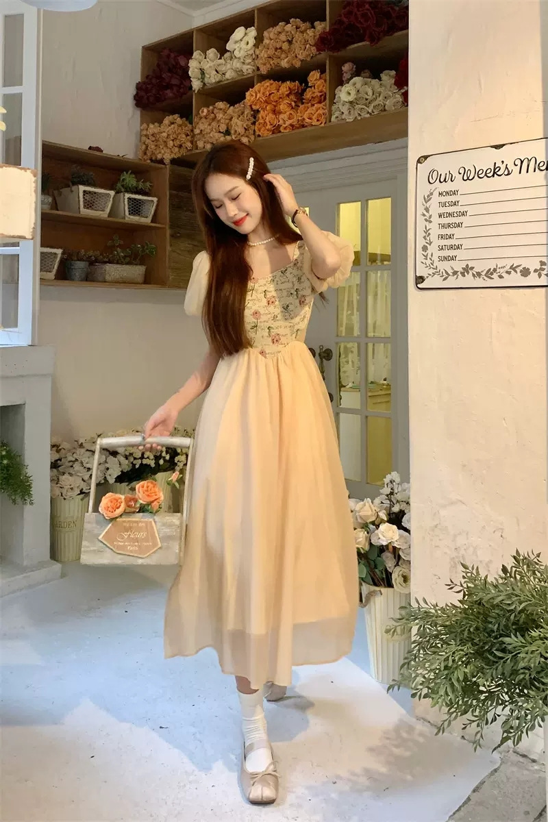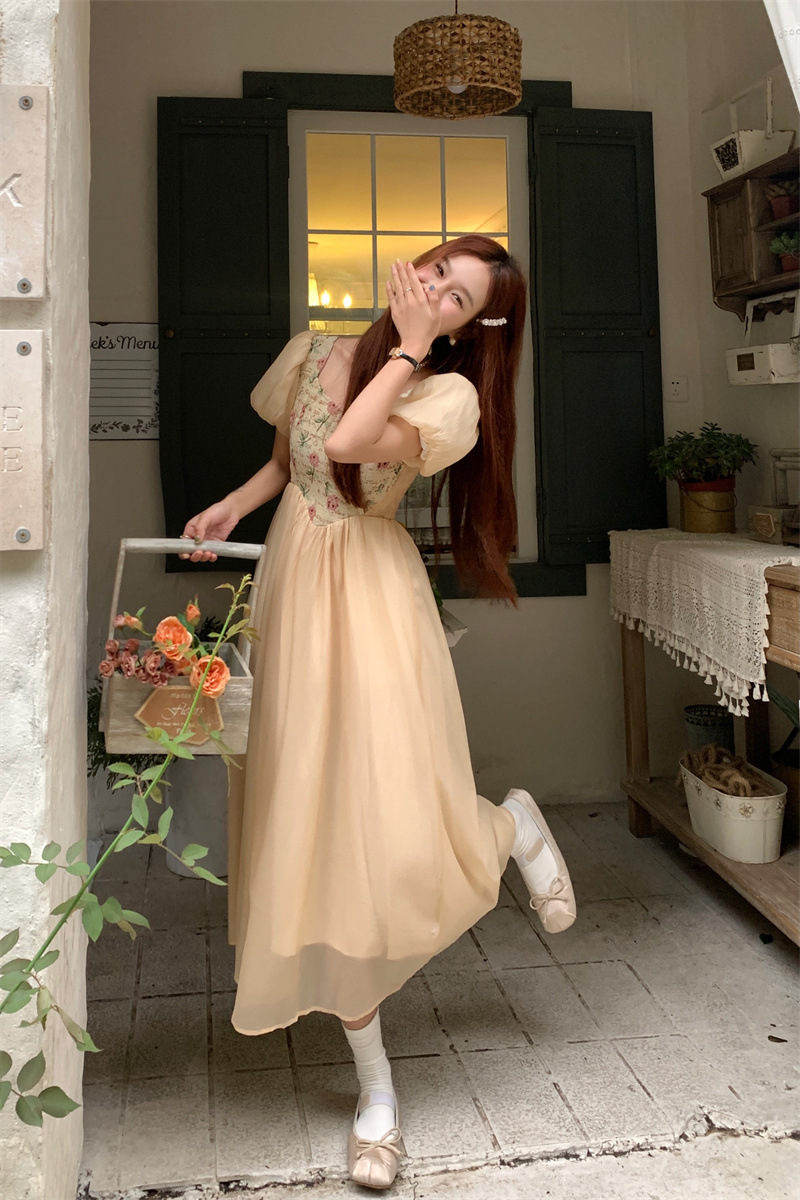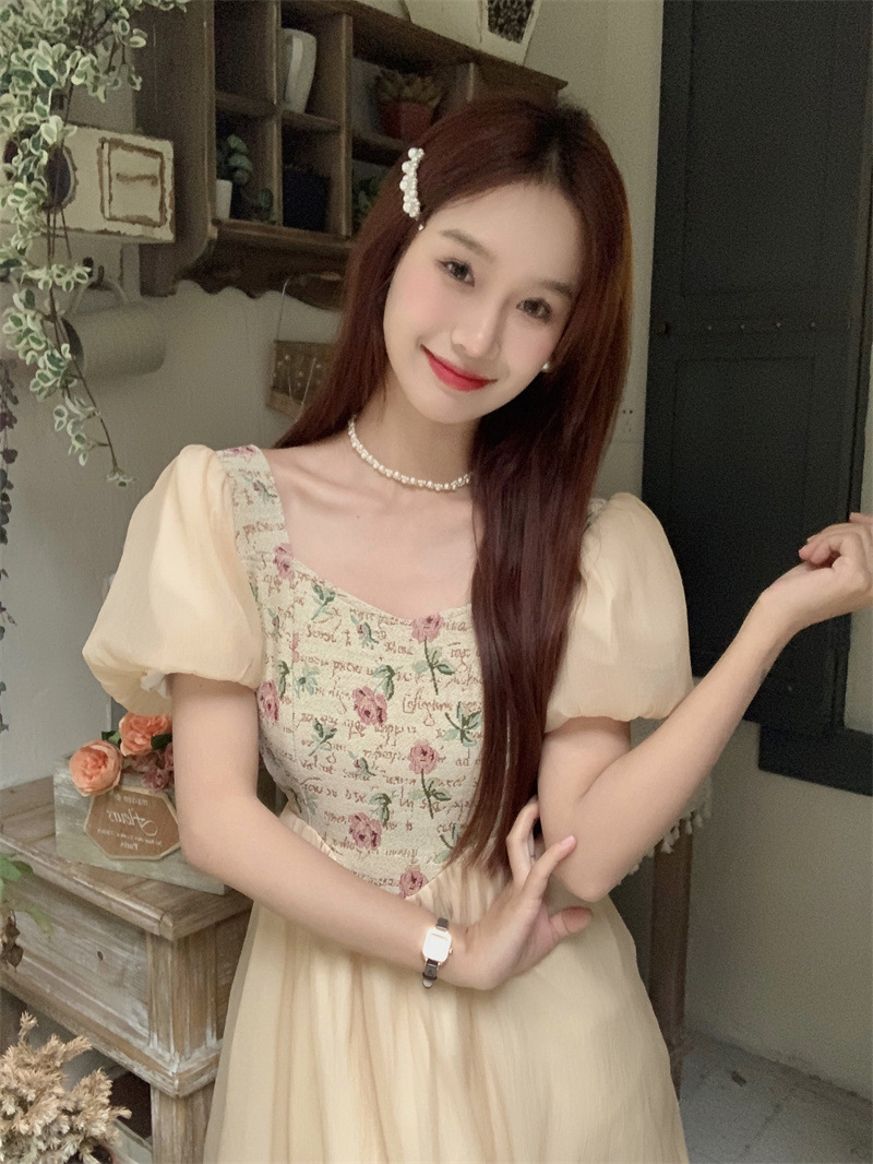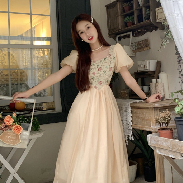 프랑스 스티칭 버블 반팔 원피스 여름 여성 의류 2024 작은 남자를위한 새로운 허리 요정 원피스스토어 가기