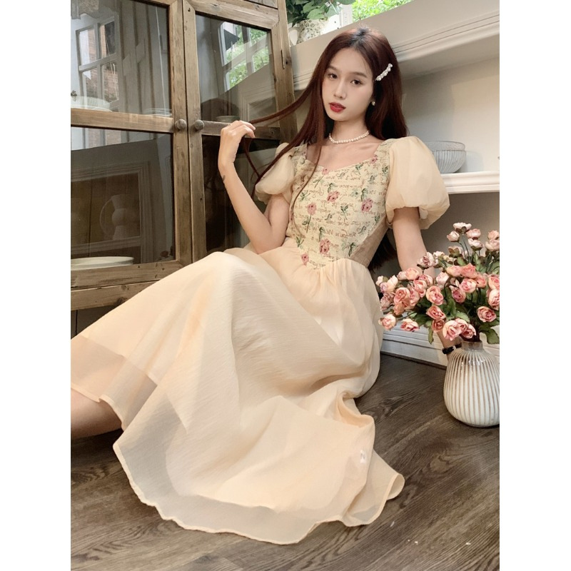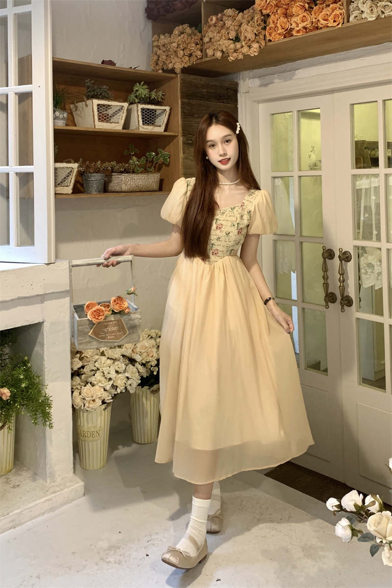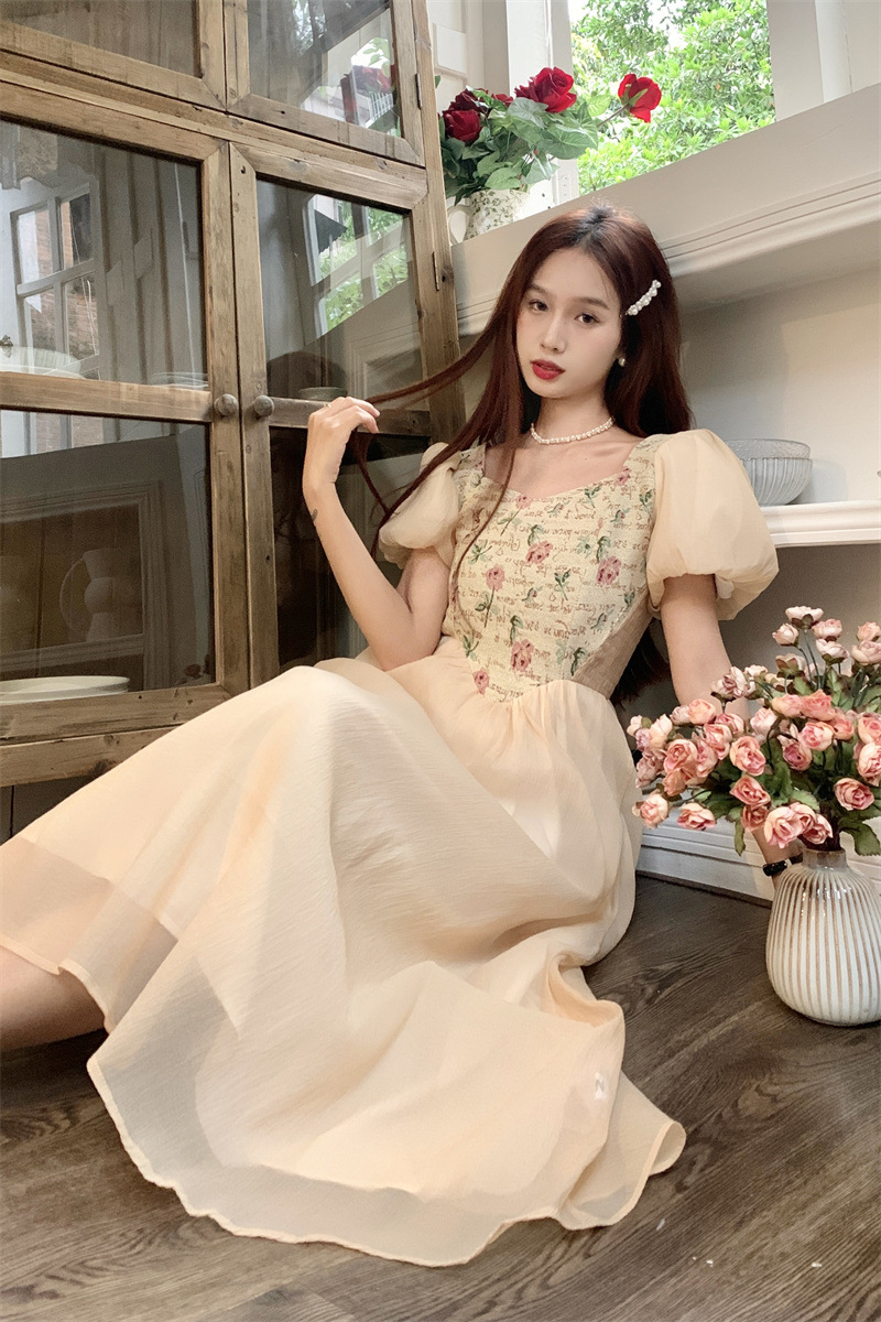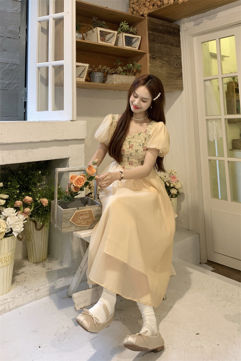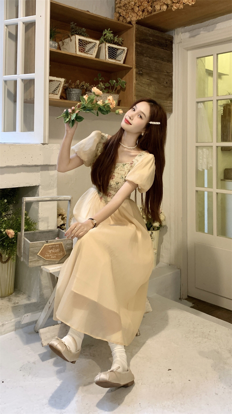 프랑스 스티칭 버블 반팔 원피스 여름 여성 의류 2024 작은 남자를위한 새로운 허리 요정 원피스스토어 가기