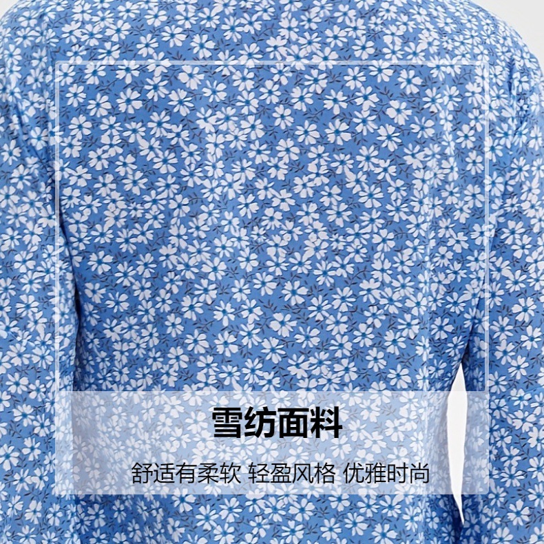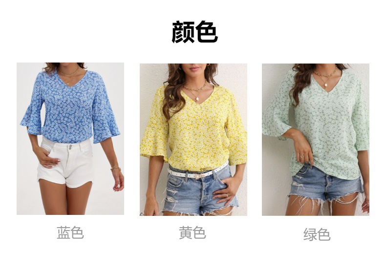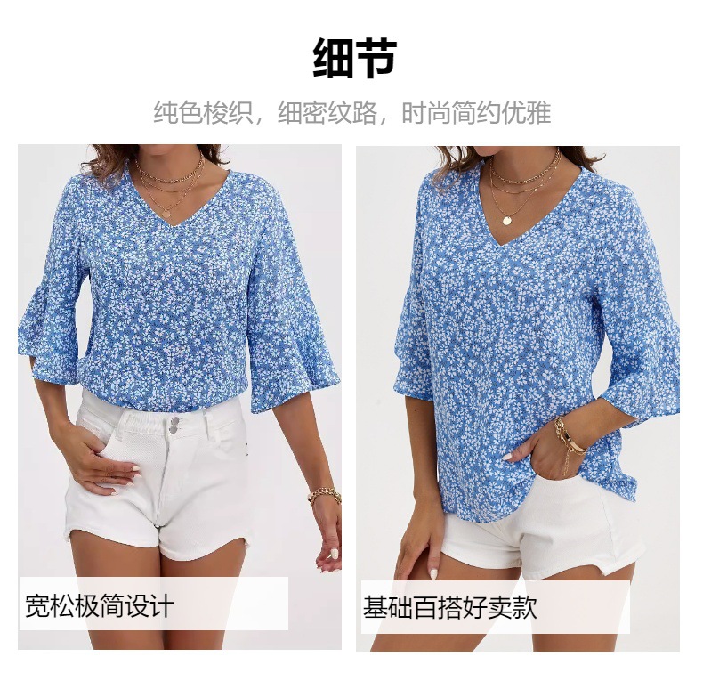 유럽과 미국의 새로운 패션 여성의 여름 작은 꽃 V 넥 쉬폰 셔츠, 뿔 소매 느슨한 풀오버 재고 패션