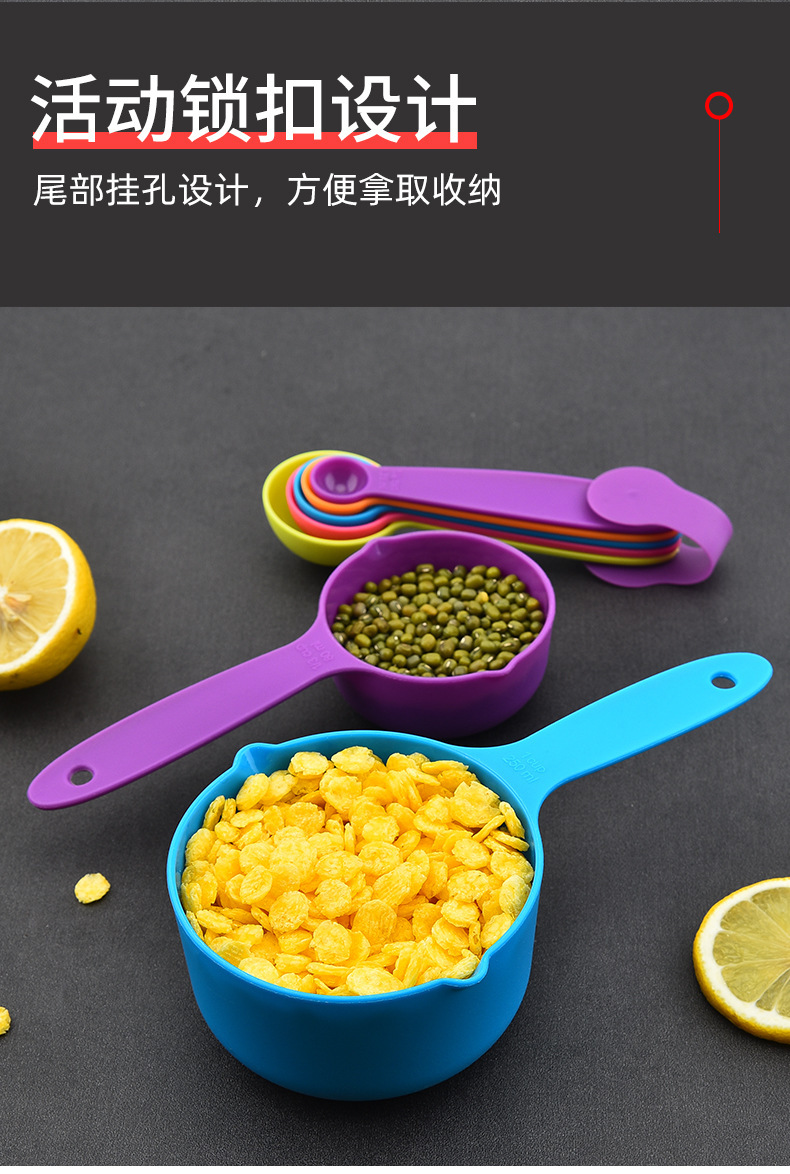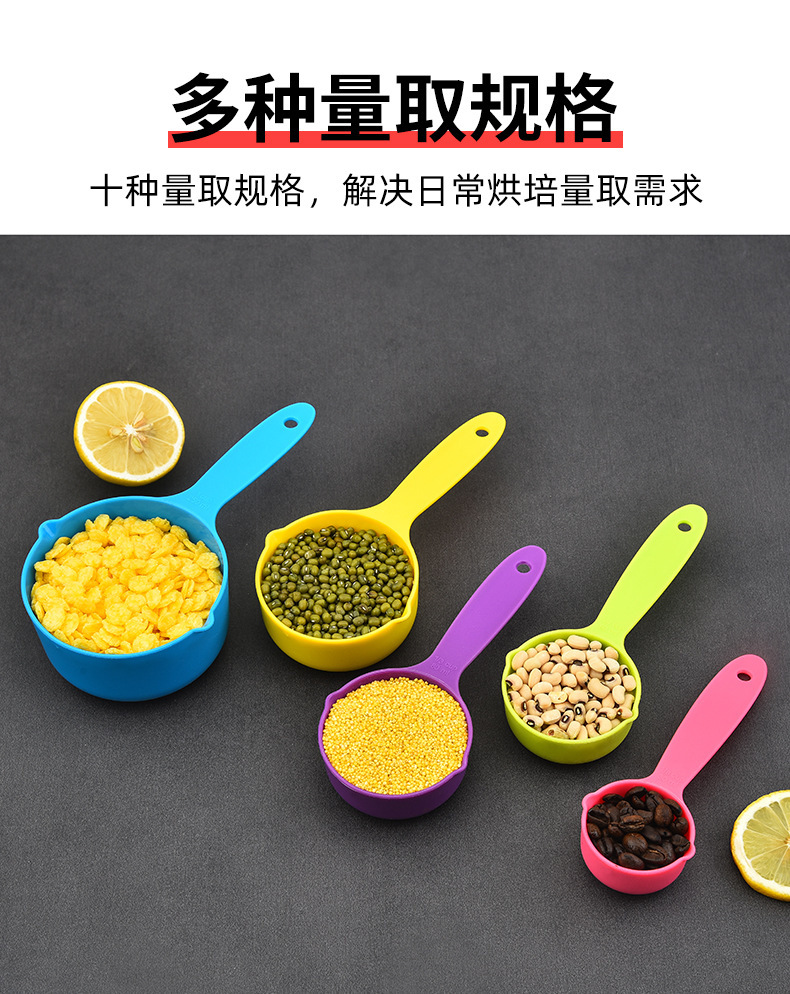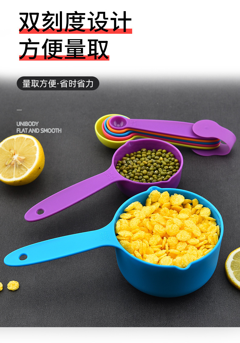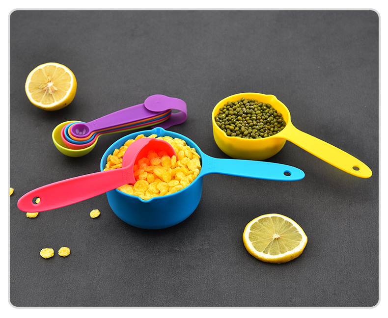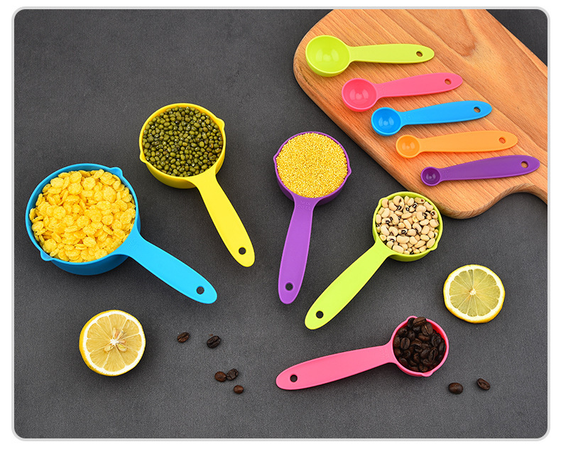재고 컬러 플라스틱 측정 컵 측정 숟가락 10 개 세트 베이킹 조각 측정 숟가락 다기능 조절 측정 컵 측정 숟가락