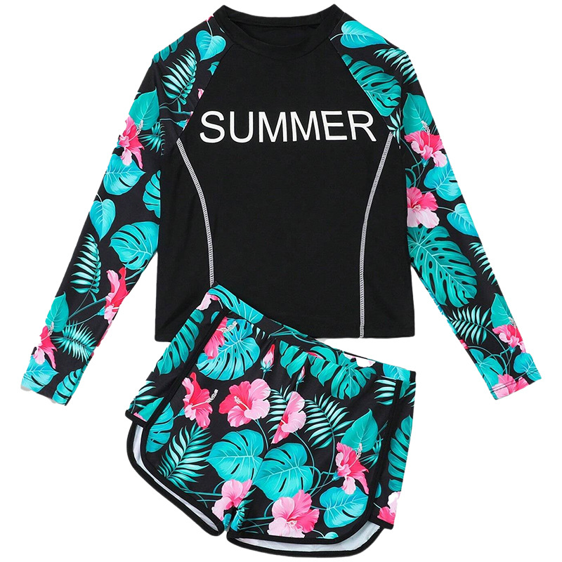 2024 새로운 여자 수영복 분할 어린이 수영복 긴 소매 반바지 세트 중대형 어린이를위한 2 피스 국경 수영복