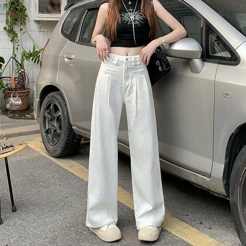 새로운 캐주얼 의상 높은 허리 배 모양의 그림 고관절을 덮고있는 스트레이트 청바지 여성의 2024 느슨한 슬림 넓은 다리 바지스토어 가기