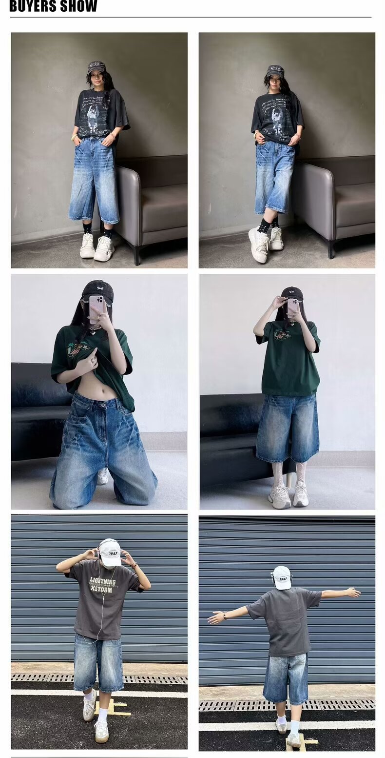 아메리칸 스타일 7 점 바지 레트로 올드 라이트닝 데님 반바지 남성용 루즈 스트레이트 와이드 레그 크롭 팬츠 드랩 쇼트스토어 가기