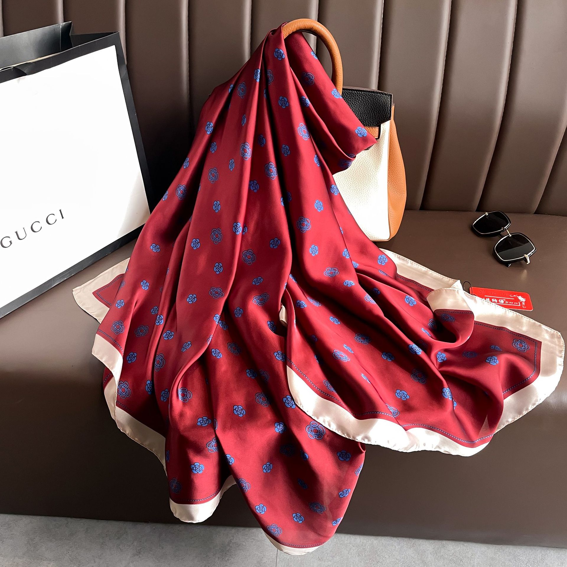 버건디 동백 꽃 인쇄 실크 스카프 여성의 새틴 모조 실크 스카프 대형 선 스크린 목도리 스카프스토어 가기
