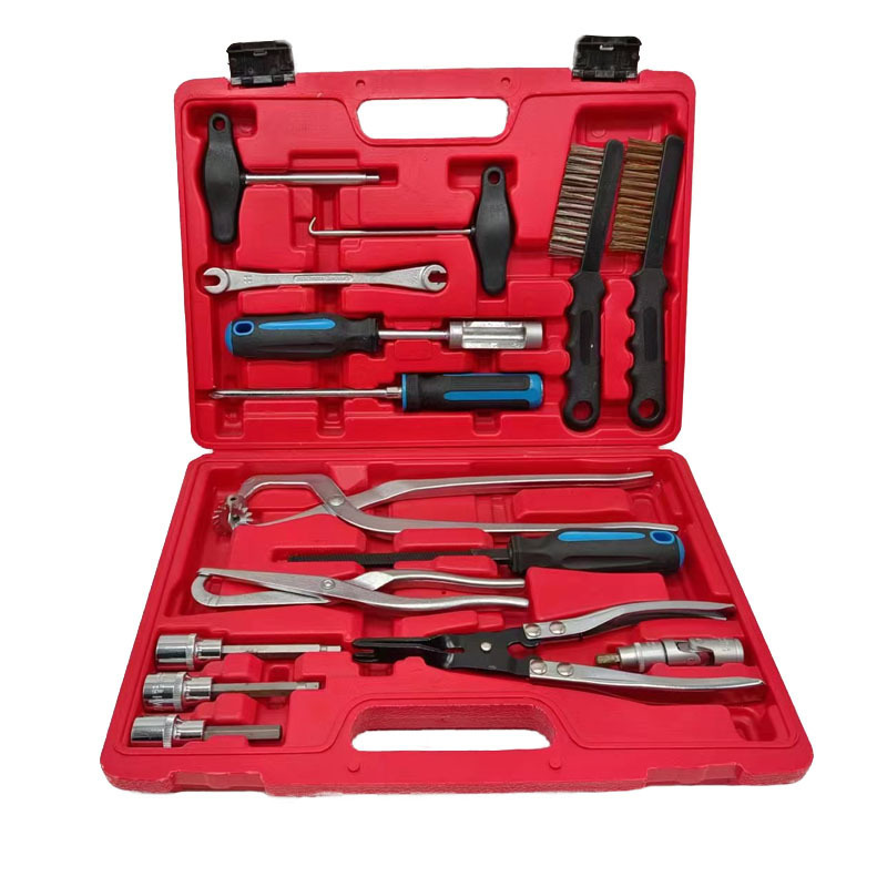 Bremsen Wartungs- und Montagesatz, 15-tlg.- Universalsatz Werkzeug- Bremsfedernzange mit beweglicher Kralle für genietete und geklebte Beläge- Bremsfedernzange zum Aus- und Einhängen der Rückholfeder, geschmiedete Ausführung- Bremssattelbürste, Stahl, speziell zum Entfernen von Bremsabrieb von den Bremssätteln- Bremssattelbürste, Messing, speziell zum Entfernen von Bremsabrieb von Aluminium-Bremssätteln- Bremsfeder-Montagewerkzeug, zum Ein- und Ausbau der Bremsträgerfeder, speziell für VW, Seat, Skoda, Opel, Renault- Bremssattelfeile, extra schlanke Ausführung, zum Entfernen von Bremsabrieb, Rost, Schmutz von den Bremssätteln- Bremsleitungsschlüssel, zweiseitig gekröpfte Ausführung, mit hinterlegten verstärkten Sechskant-Öffnungen, SW 10X11 mm- Montagehaken zum Ein- und Ausbau der Zugfeder, z.B. bei Mercedes, VW LT.- Bremsfedereinbauwerkzeug zur Montage der Feder an der Feststellbremse- Bremsseil-Federnzange zum Ein- und Ausbau der Handbremskabel- komplett in Kunststoffkoffer sortiert