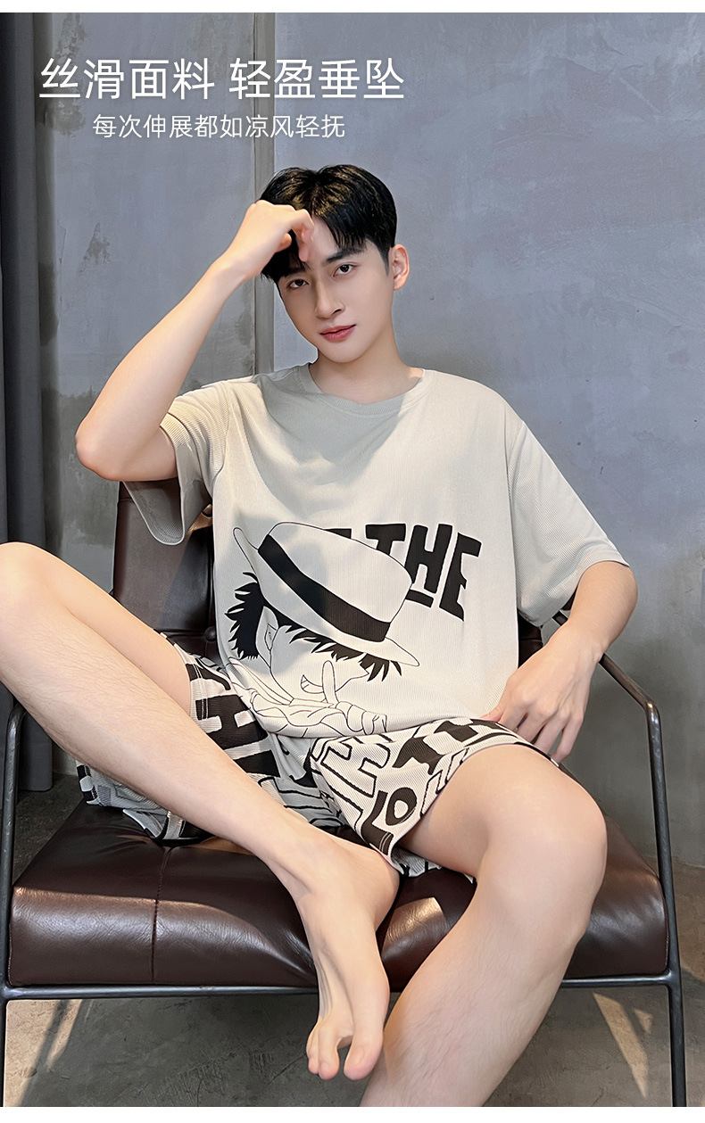 TR7030 외팔 반바지 착용 남성용 홈 옷 2 피스 세트 여름 느슨한 둥근 목 간단한 느슨한