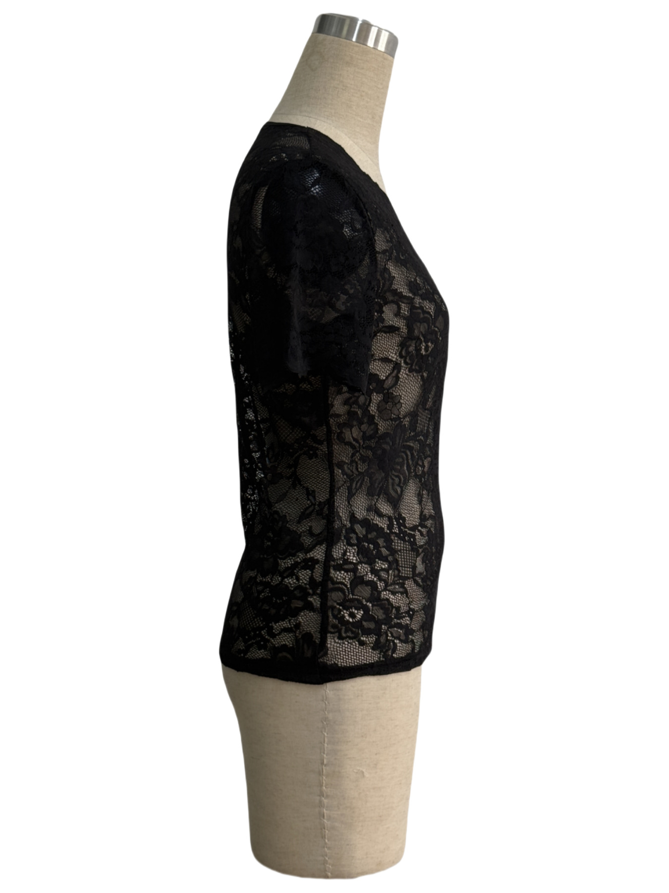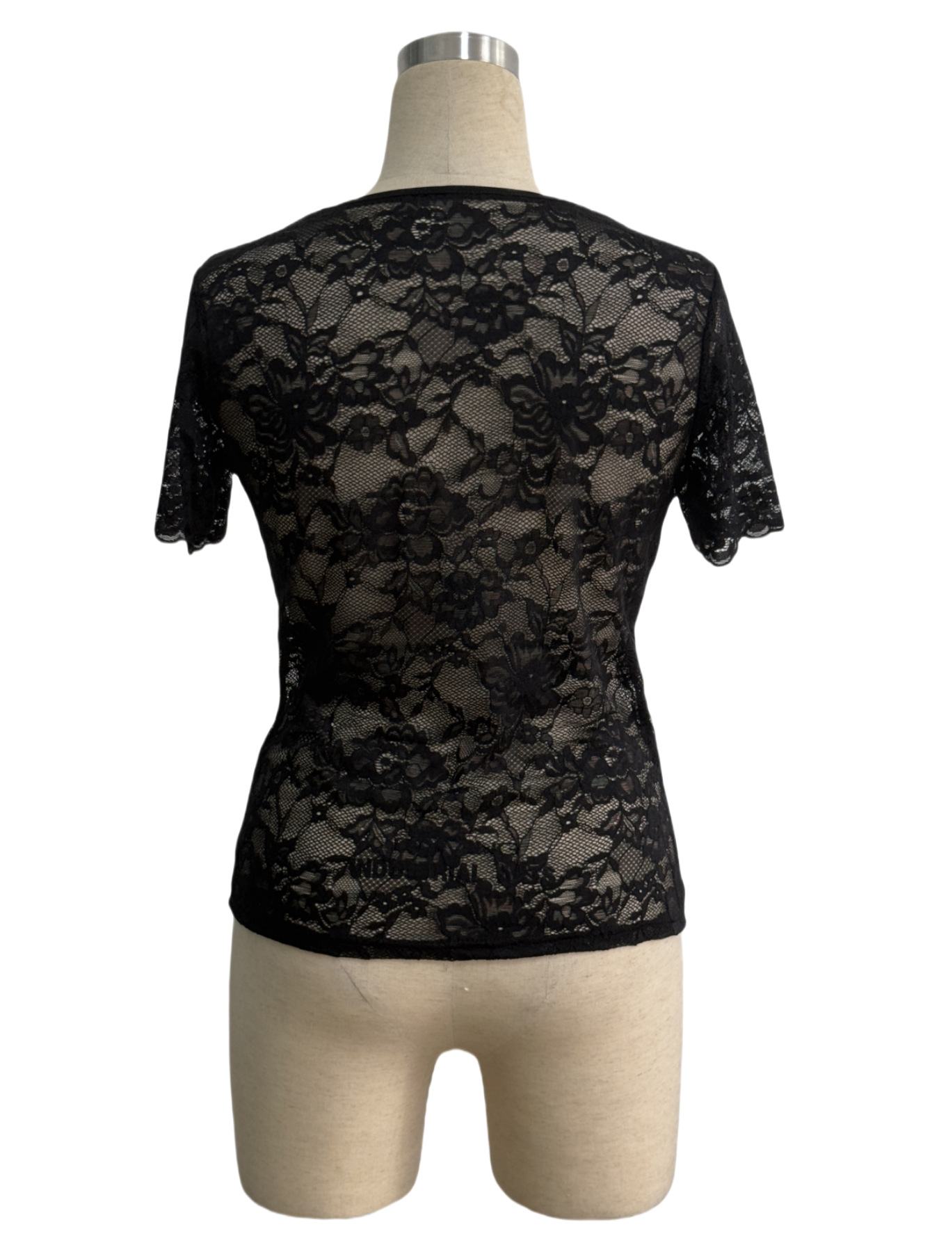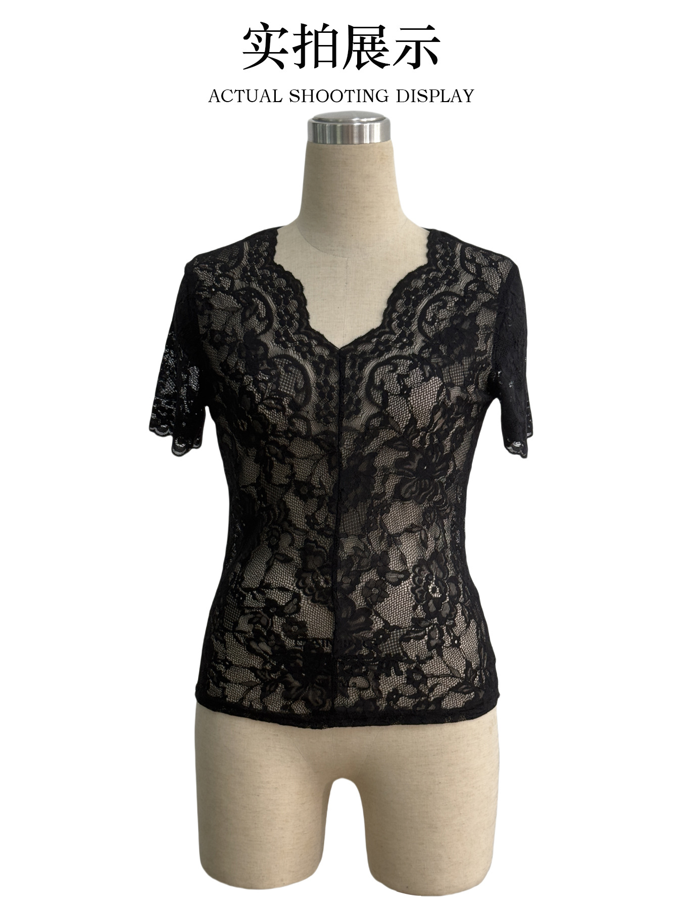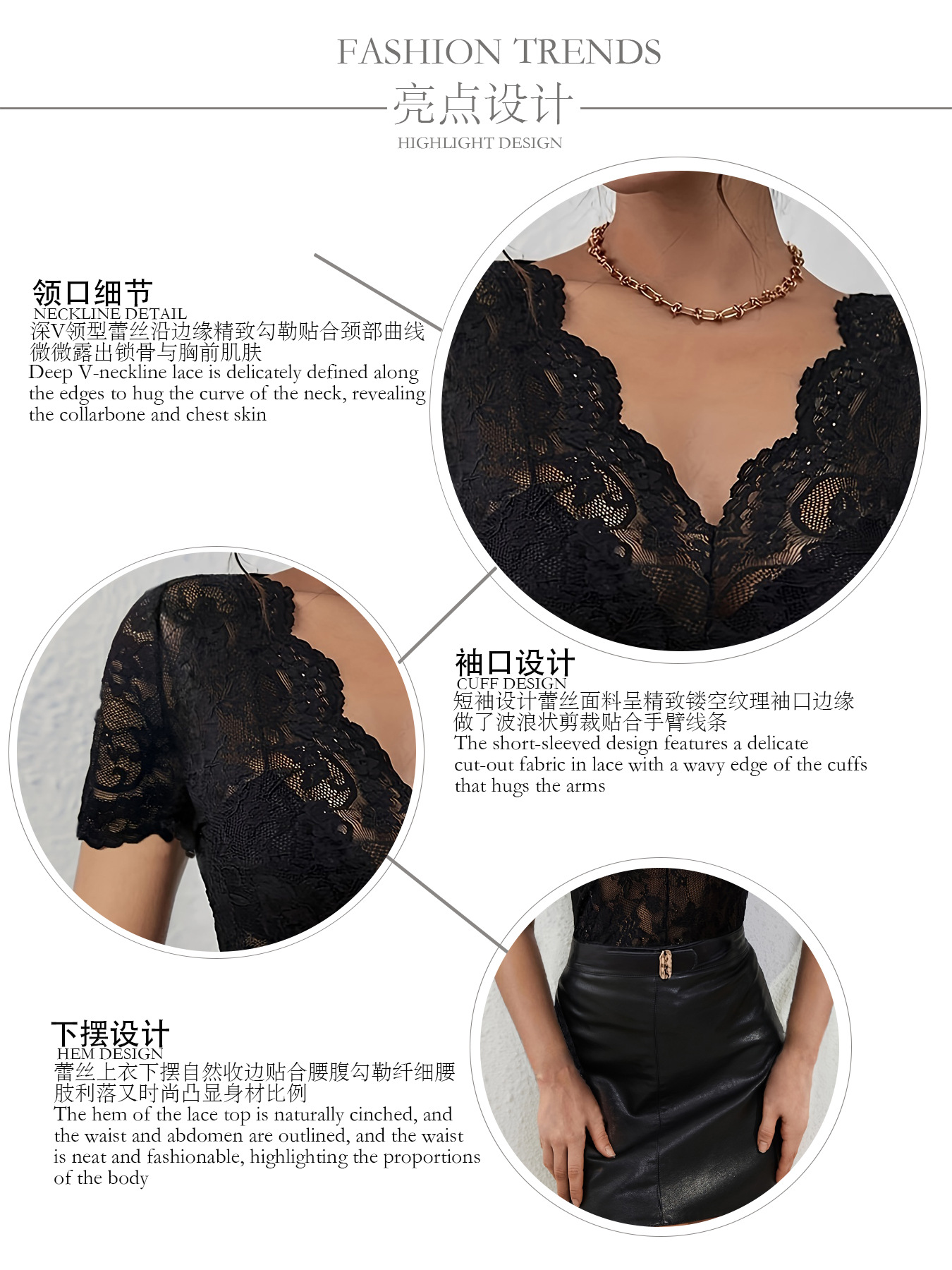 유럽과 미국의 국경 2025 새로운 우아한 팬 모양의 v 넥 솔리드 컬러 레이스 섹시한 티셔츠 슬리밍 탑 여성 의류스토어 가기